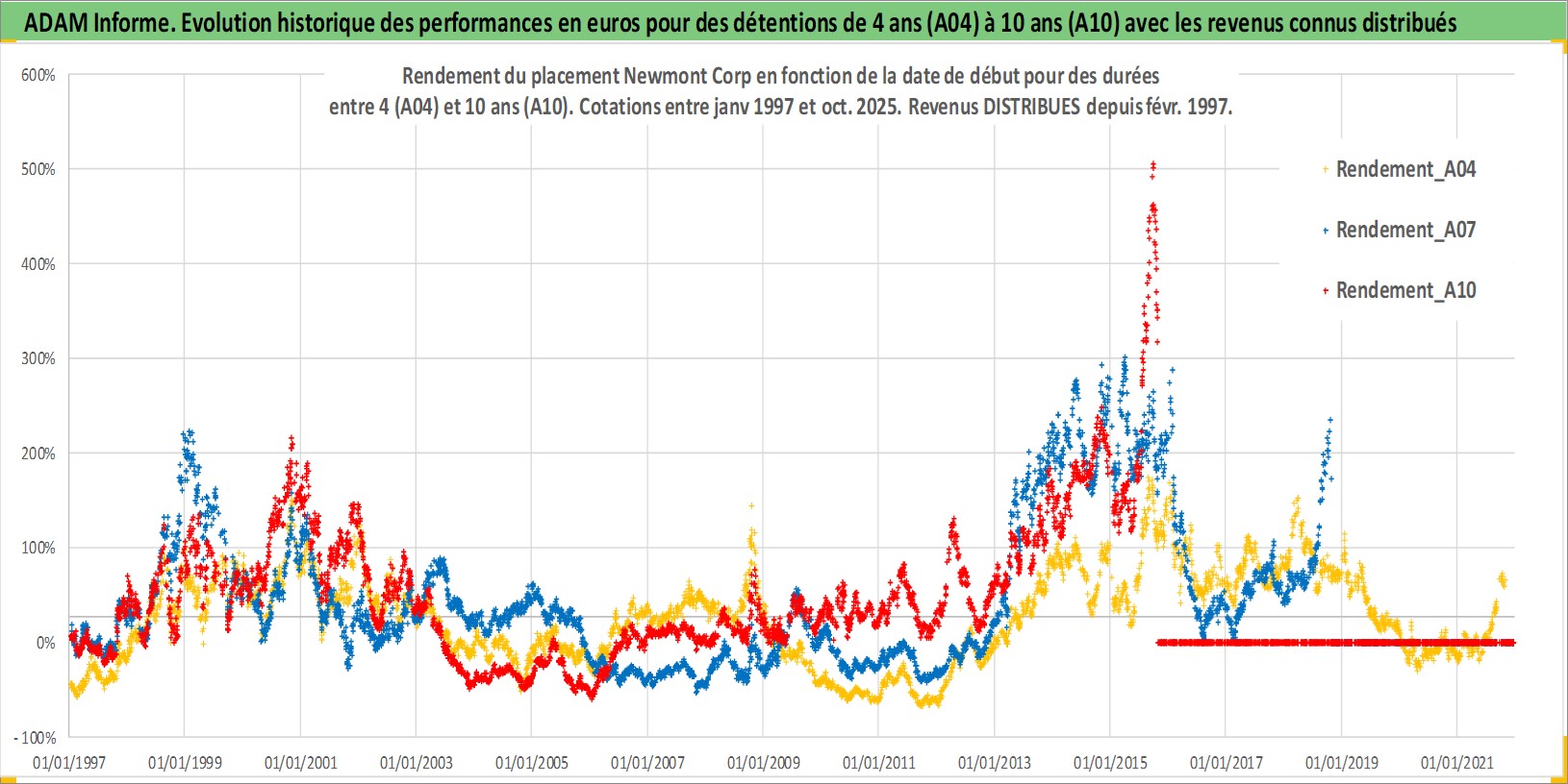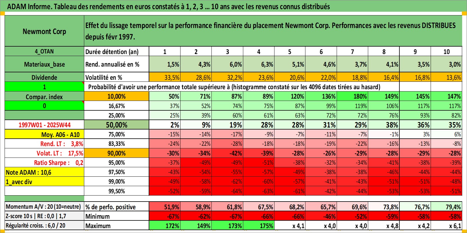 Site dédié aux investisseursPage dédiée sur site financeAnalyse des valorisations hebdomadaires de l'action Newmont Corp. Cet actif est cote en USD. Les valorisations sont en contrevaleur EURO et couvrent les semaines 1997W01 a 2025W44. Les revenus de cet actif financier sont pris en compte depuis la semaine 1997W07. La note globale ESG de cet actif est estimee a 10.0 (apres rebasage entre 0 et 20).