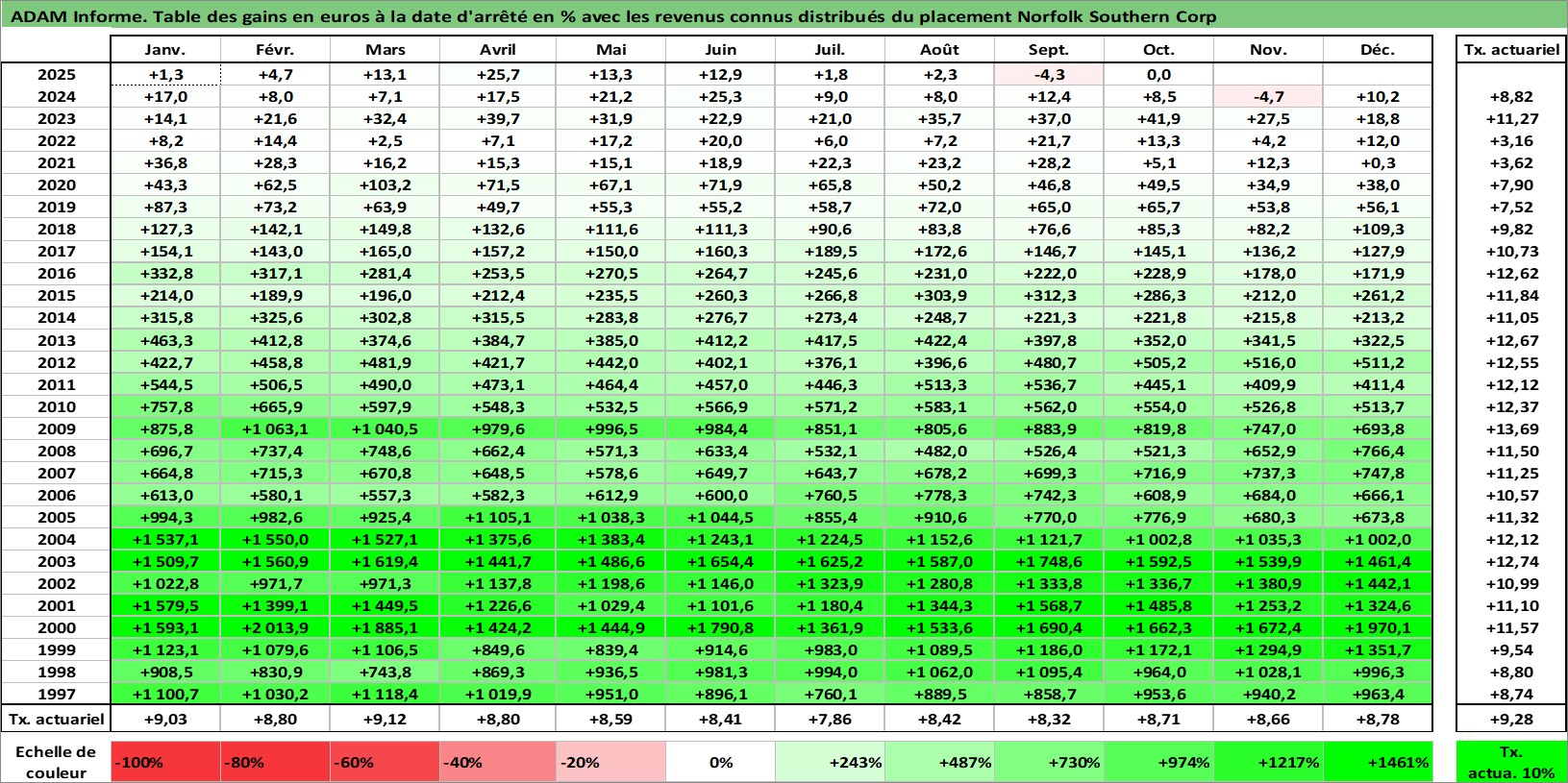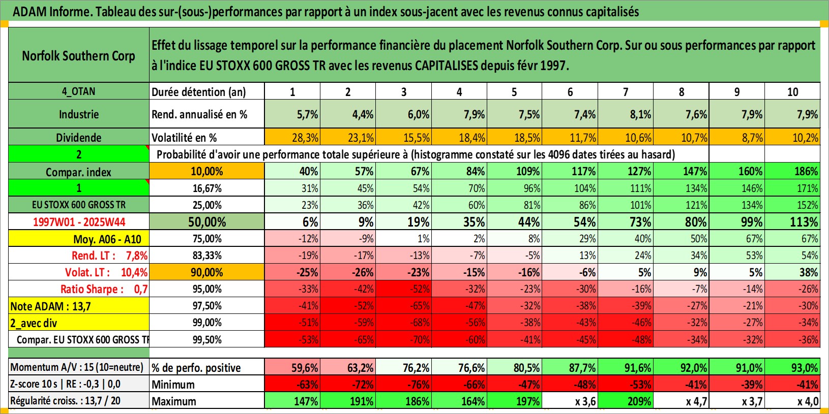 Site dédié aux investisseursPage dédiée sur site financeAnalyse des valorisations hebdomadaires de l'action Norfolk Southern Corp. Cet actif est cote en USD. Les valorisations sont en contrevaleur EURO et couvrent les semaines 1997W01 a 2025W44. Les revenus de cet actif financier sont pris en compte depuis la semaine 1997W06. La note globale ESG de cet actif est estimee a 9.0 (apres rebasage entre 0 et 20).