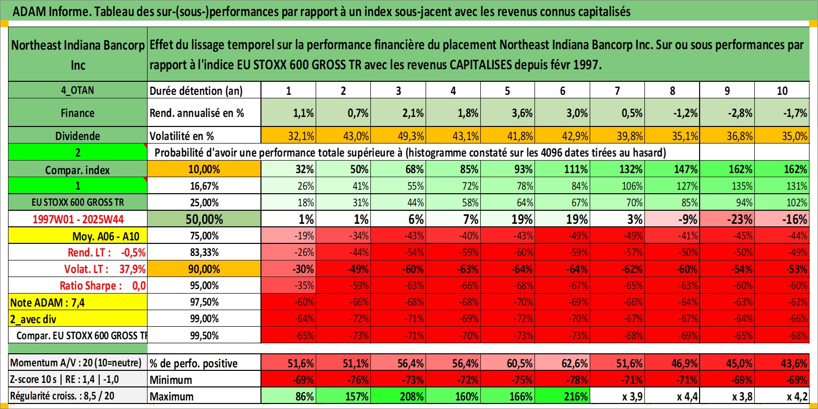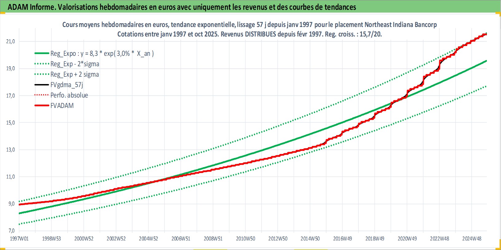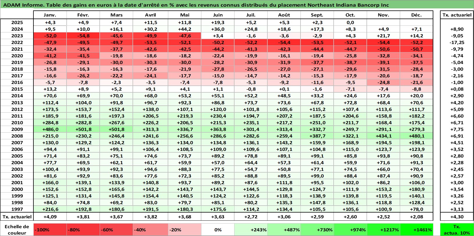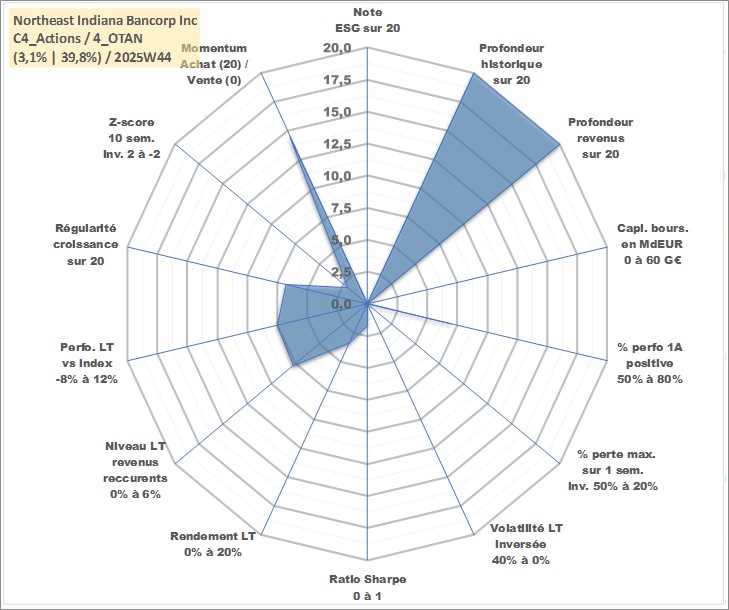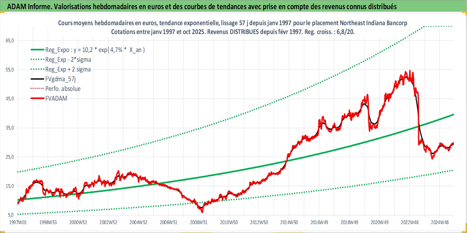Site dédié aux investisseursPage dédiée sur site financeAnalyse des valorisations hebdomadaires de l'action Northeast Indiana Bancorp Inc. Cet actif est cote en USD. Les valorisations sont en contrevaleur EURO et couvrent les semaines 1997W01 a 2025W44. Les revenus de cet actif financier sont pris en compte depuis la semaine 1997W06. La note ESG de cet actif n'est pas connue.