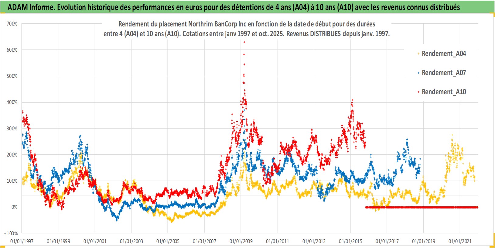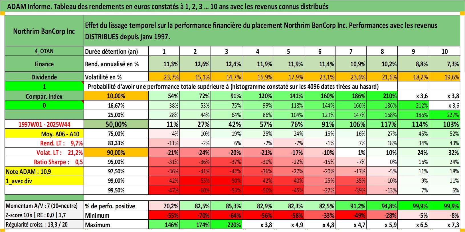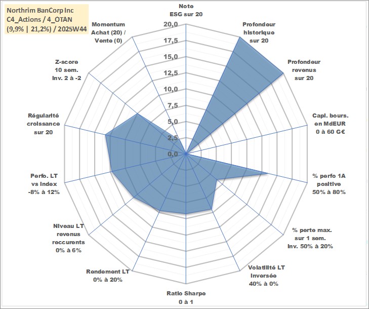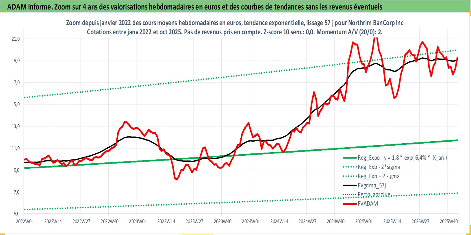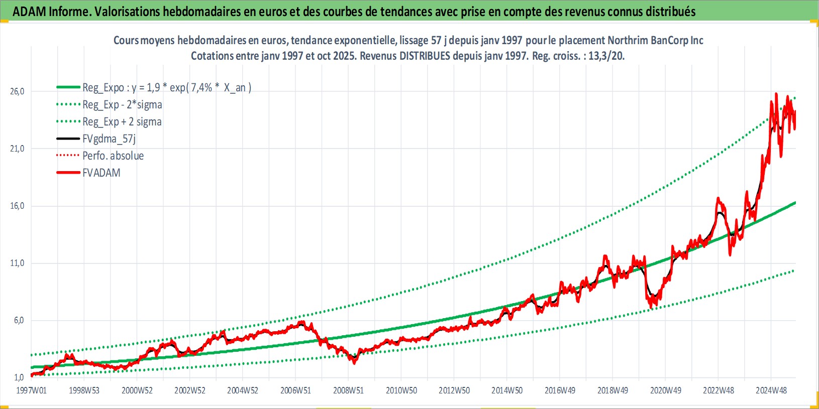 Site dédié aux investisseursPage dédiée sur site financeAnalyse des valorisations hebdomadaires de l'action Northrim BanCorp Inc. Cet actif est cote en USD. Les valorisations sont en contrevaleur EURO et couvrent les semaines 1997W01 a 2025W44. Les revenus de cet actif financier sont pris en compte depuis la semaine 1997W03. La note ESG de cet actif n'est pas connue.