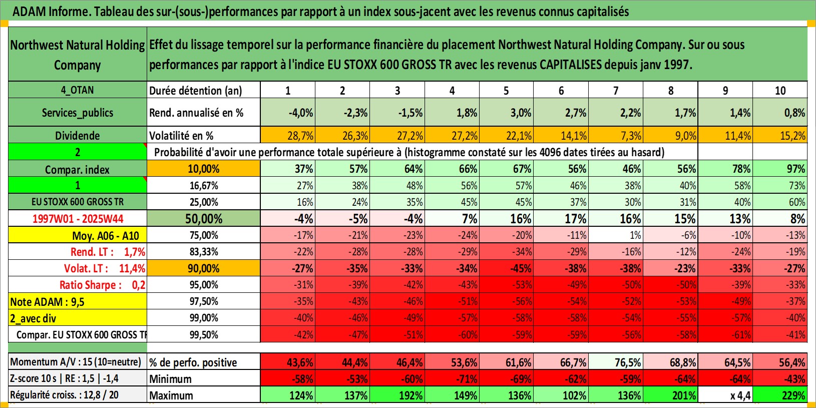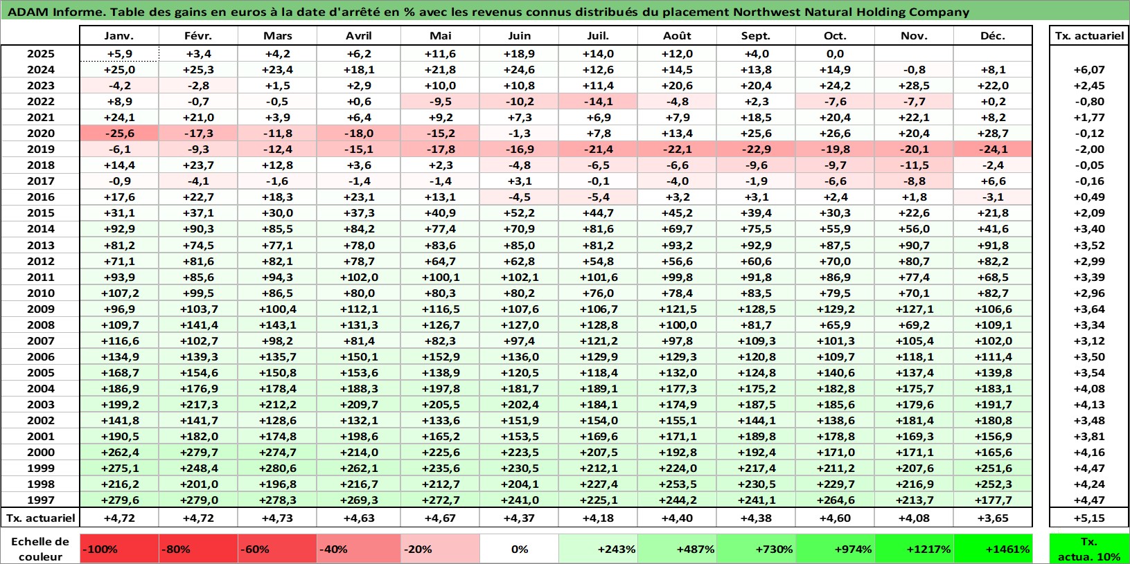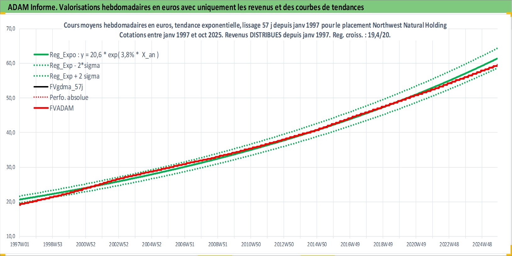 Site dédié aux investisseursPage dédiée sur site financeAnalyse des valorisations hebdomadaires de l'action Northwest Natural Holding Company. Cet actif est cote en USD. Les valorisations sont en contrevaleur EURO et couvrent les semaines 1997W01 a 2025W44. Les revenus de cet actif financier sont pris en compte depuis la semaine 1997W05. La note ESG de cet actif n'est pas connue.