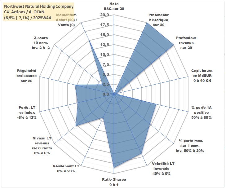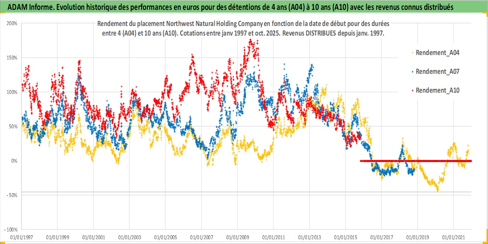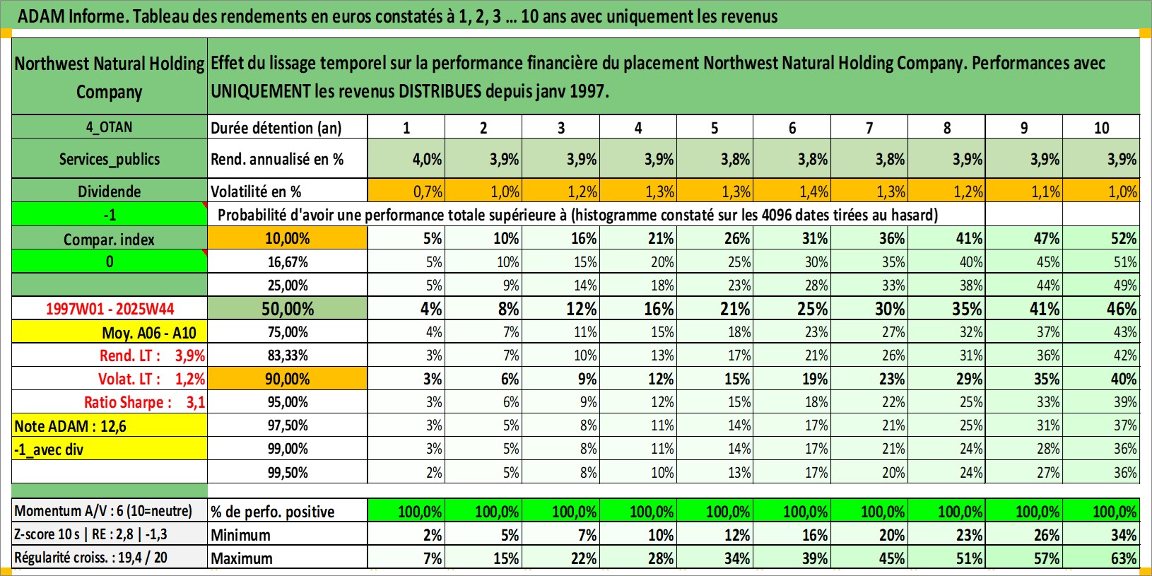 Site dédié aux investisseursPage dédiée sur site financeAnalyse des valorisations hebdomadaires de l'action Northwest Natural Holding Company. Cet actif est cote en USD. Les valorisations sont en contrevaleur EURO et couvrent les semaines 1997W01 a 2025W44. Les revenus de cet actif financier sont pris en compte depuis la semaine 1997W05. La note ESG de cet actif n'est pas connue.