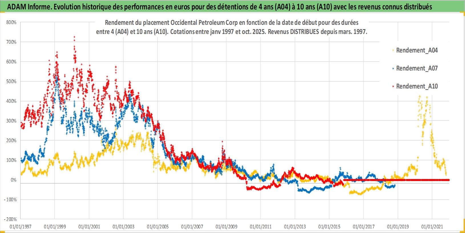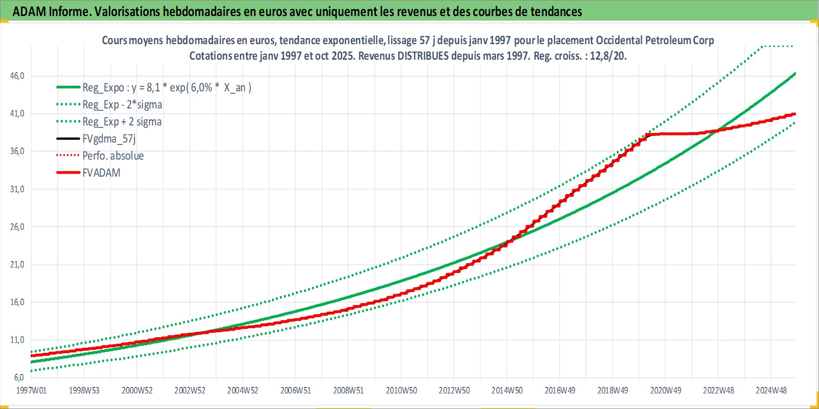 Site dédié aux investisseursPage dédiée sur site financeAnalyse des valorisations hebdomadaires de l'action Occidental Petroleum Corp. Cet actif est cote en USD. Les valorisations sont en contrevaleur EURO et couvrent les semaines 1997W01 a 2025W44. Les revenus de cet actif financier sont pris en compte depuis la semaine 1997W10. La note globale ESG de cet actif est estimee a 1.0 (apres rebasage entre 0 et 20).