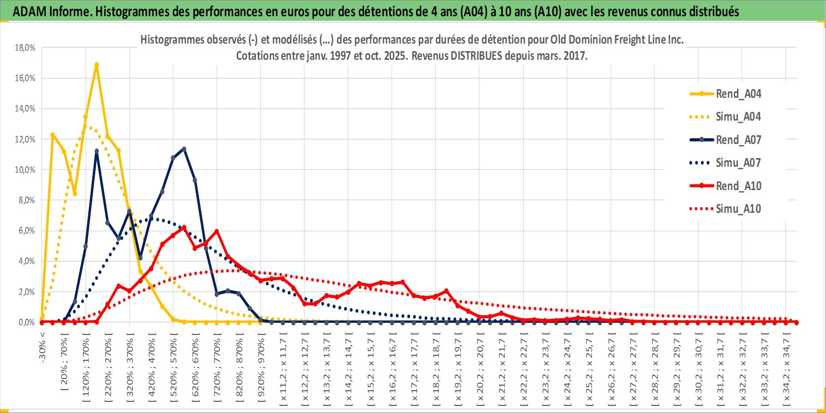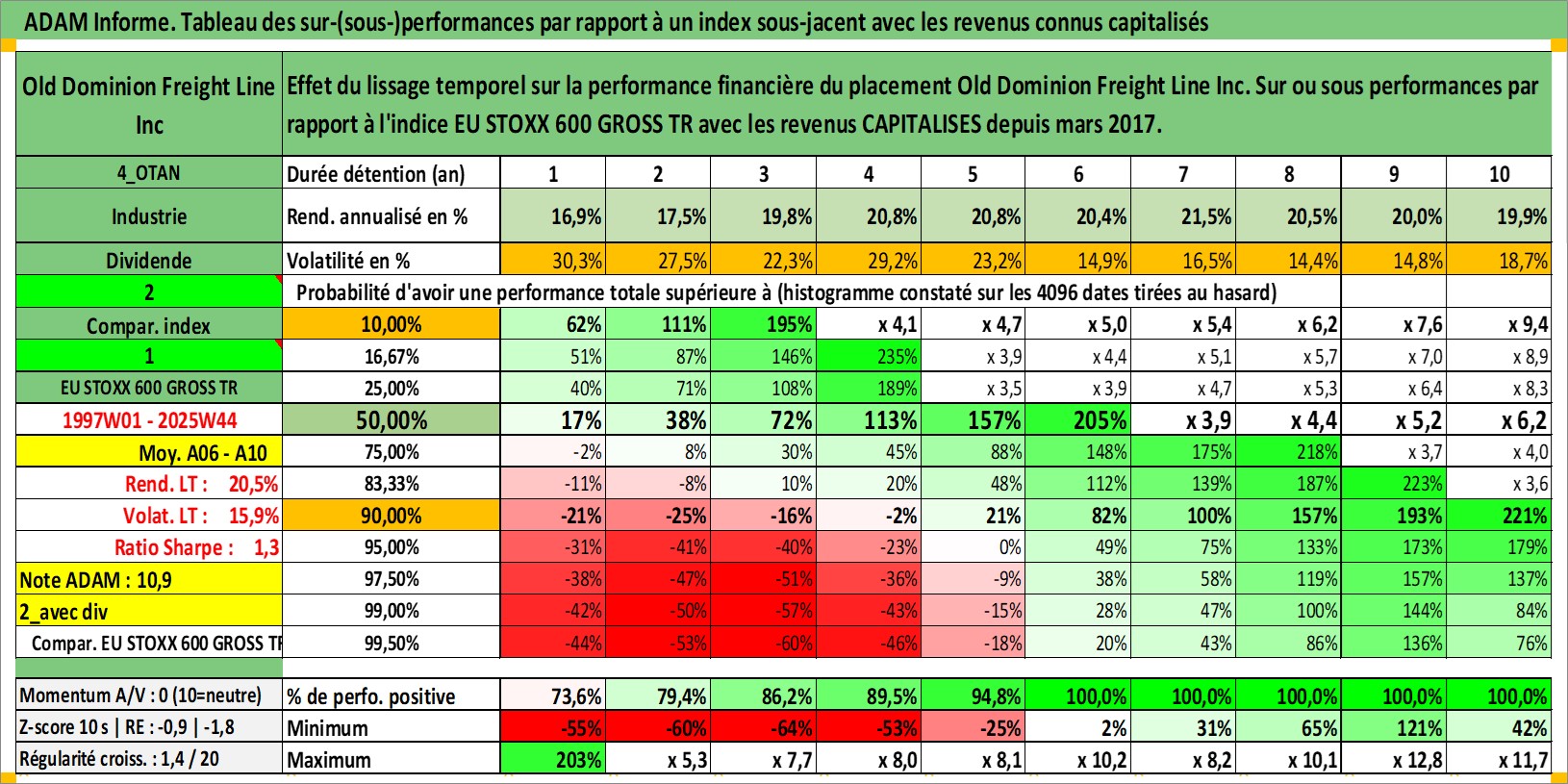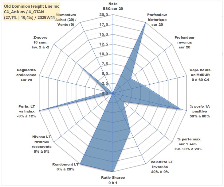 Site dédié aux investisseursPage dédiée sur site financeAnalyse des valorisations hebdomadaires de l'action Old Dominion Freight Line Inc. Cet actif est cote en USD. Les valorisations sont en contrevaleur EURO et couvrent les semaines 1997W01 a 2025W44. Les revenus de cet actif financier sont pris en compte depuis la semaine 2017W09. La note ESG de cet actif n'est pas connue.