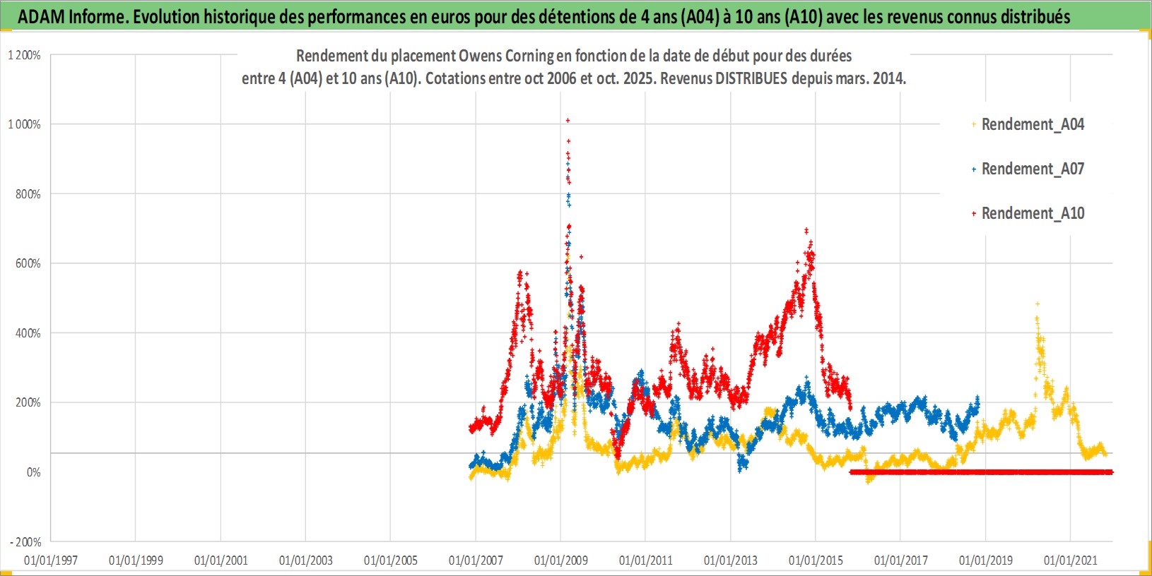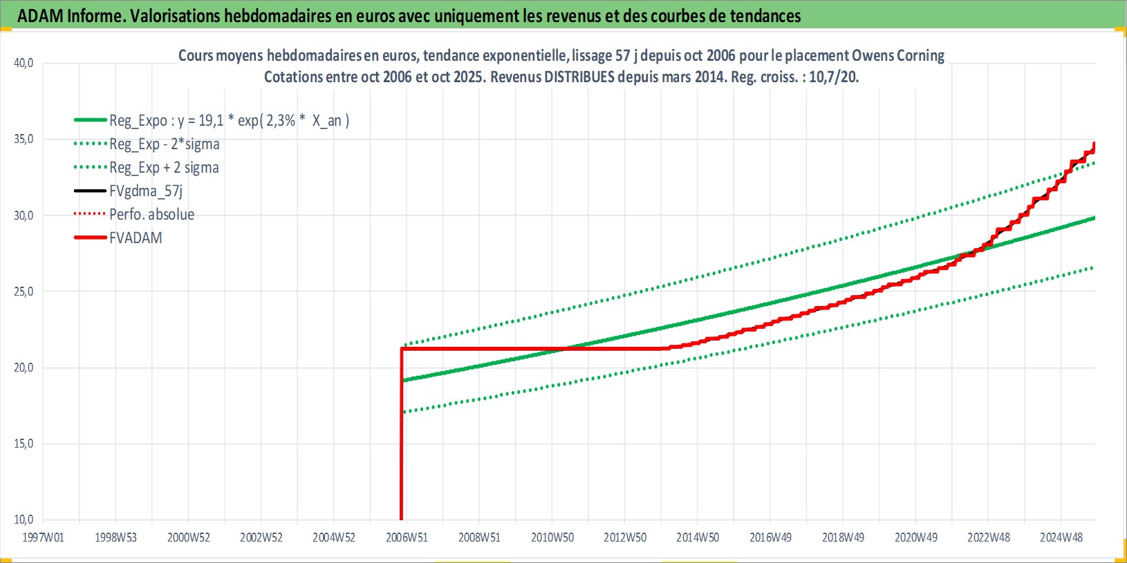 Site dédié aux investisseursPage dédiée sur site financeAnalyse des valorisations hebdomadaires de l'action Owens Corning. Cet actif est cote en USD. Les valorisations sont en contrevaleur EURO et couvrent les semaines 2006W44 a 2025W44. Les revenus de cet actif financier sont pris en compte depuis la semaine 2014W11. La note globale ESG de cet actif est estimee a 13.0 (apres rebasage entre 0 et 20).