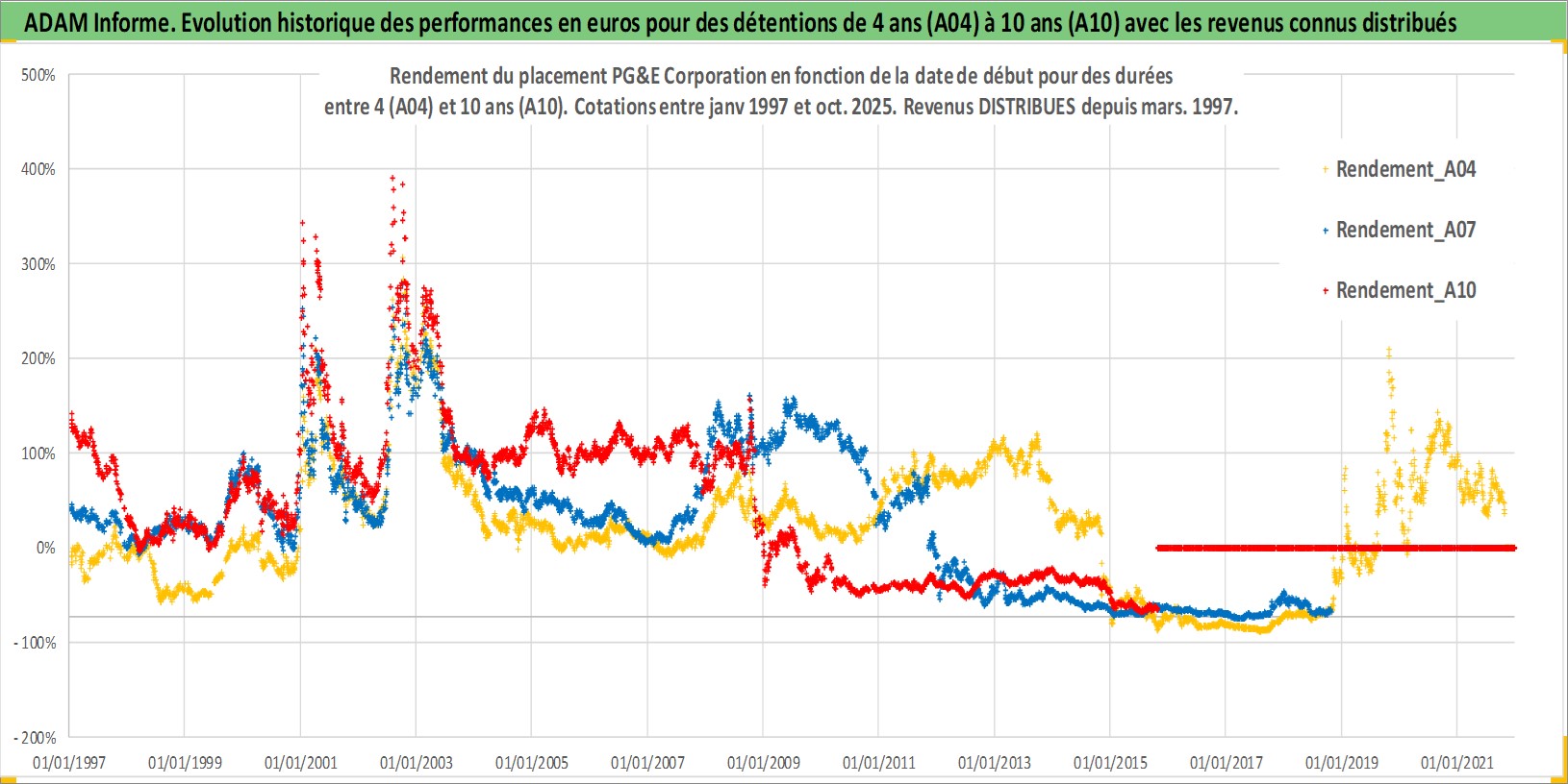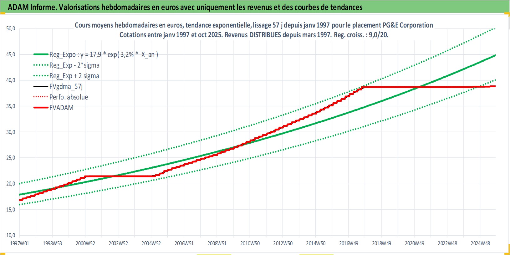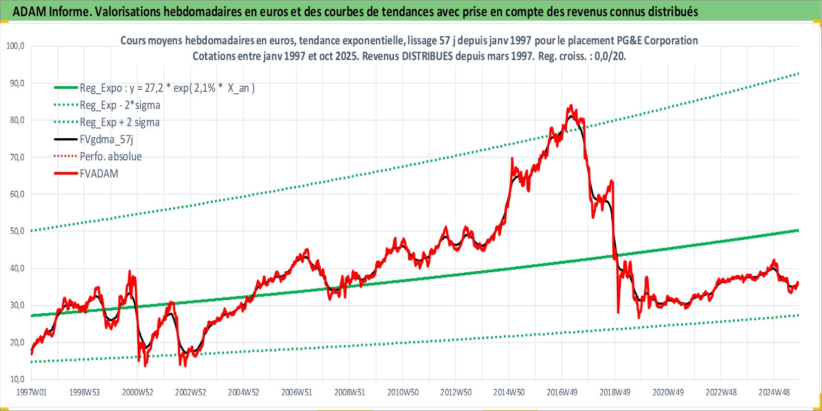 Site dédié aux investisseursPage dédiée sur site financeAnalyse des valorisations hebdomadaires de l'action PG&E Corporation. Cet actif est cote en USD. Les valorisations sont en contrevaleur EURO et couvrent les semaines 1997W01 a 2025W44. Les revenus de cet actif financier sont pris en compte depuis la semaine 1997W11. La note globale ESG de cet actif est estimee a 3.0 (apres rebasage entre 0 et 20).