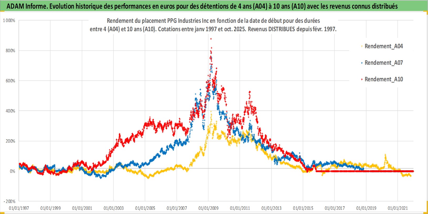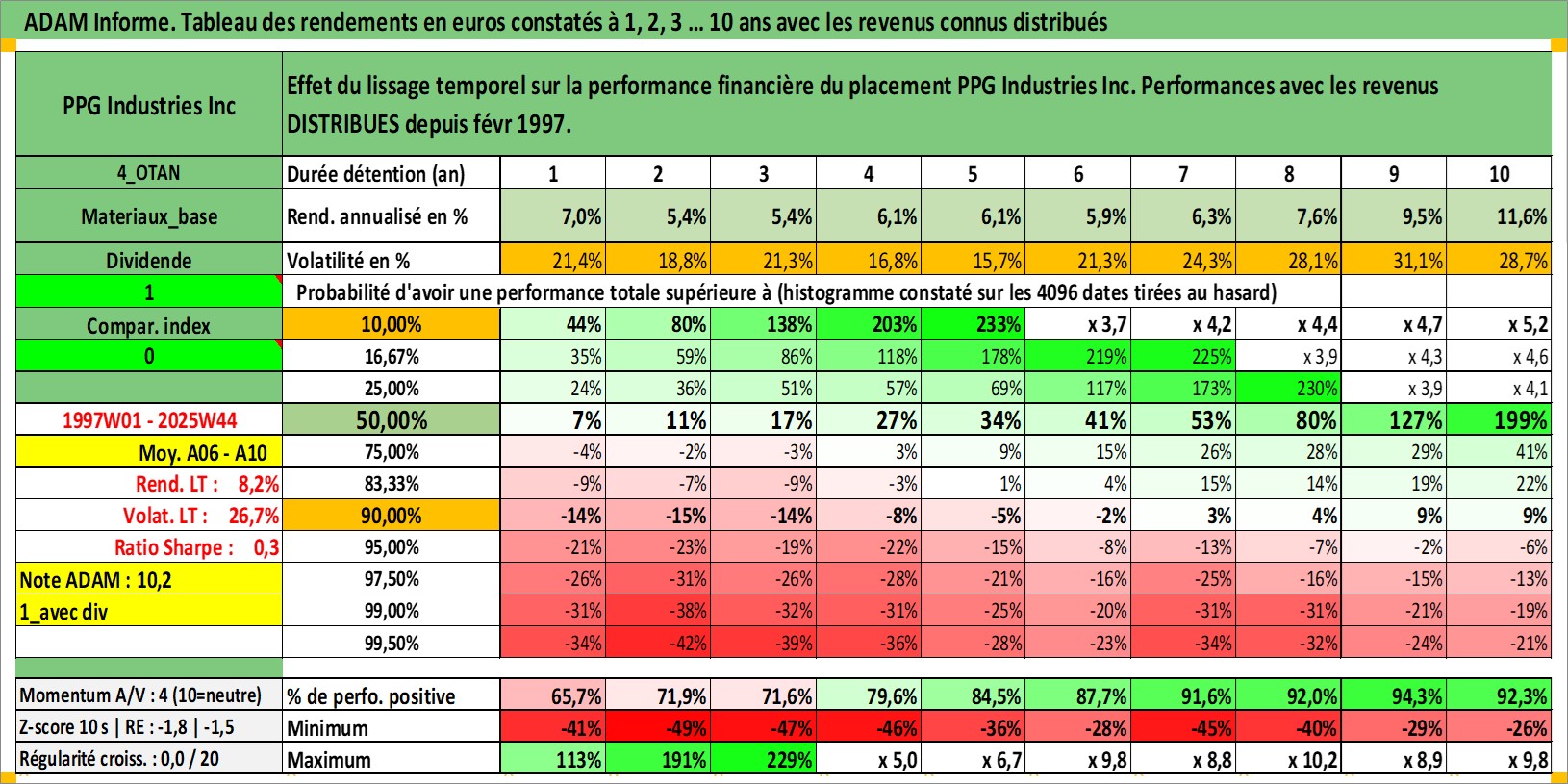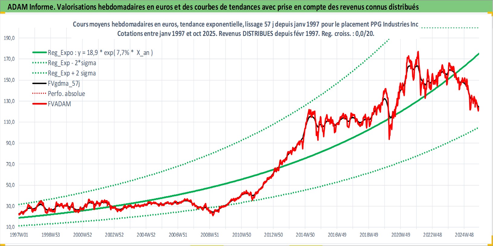 Site dédié aux investisseursPage dédiée sur site financeAnalyse des valorisations hebdomadaires de l'action PPG Industries Inc. Cet actif est cote en USD. Les valorisations sont en contrevaleur EURO et couvrent les semaines 1997W01 a 2025W44. Les revenus de cet actif financier sont pris en compte depuis la semaine 1997W07. La note globale ESG de cet actif est estimee a 8.0 (apres rebasage entre 0 et 20).