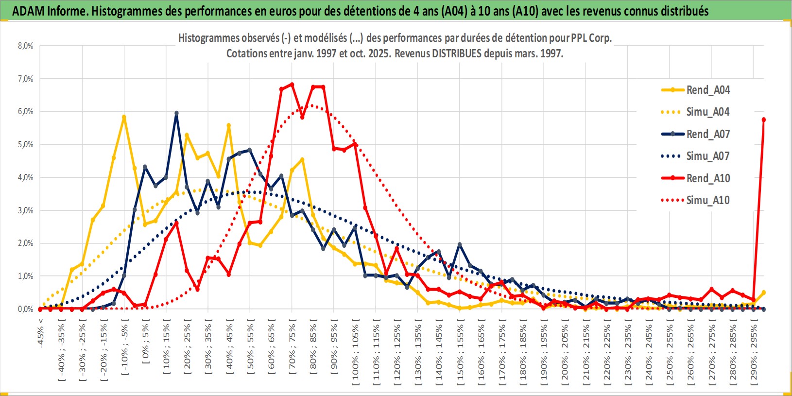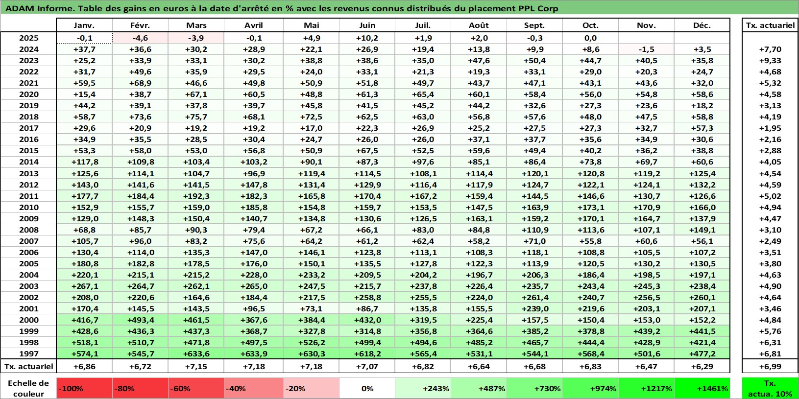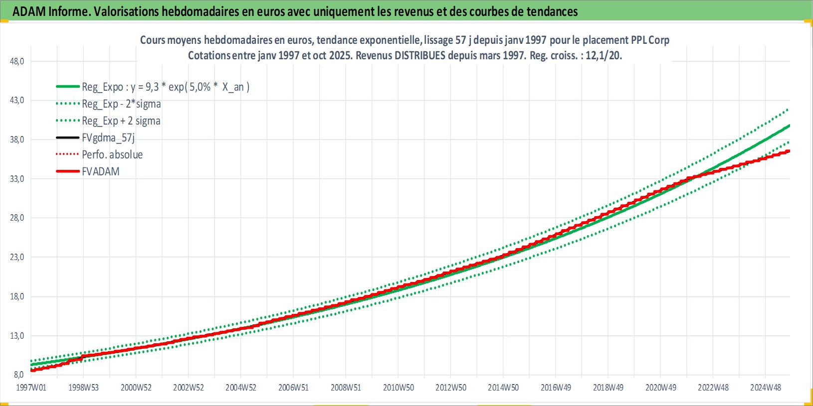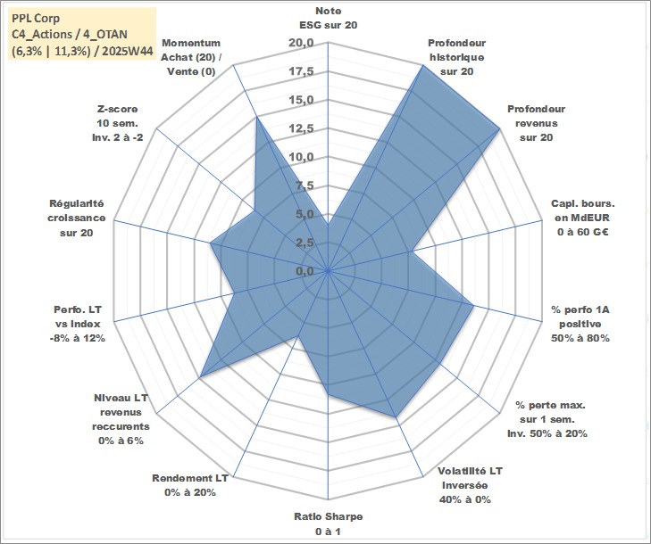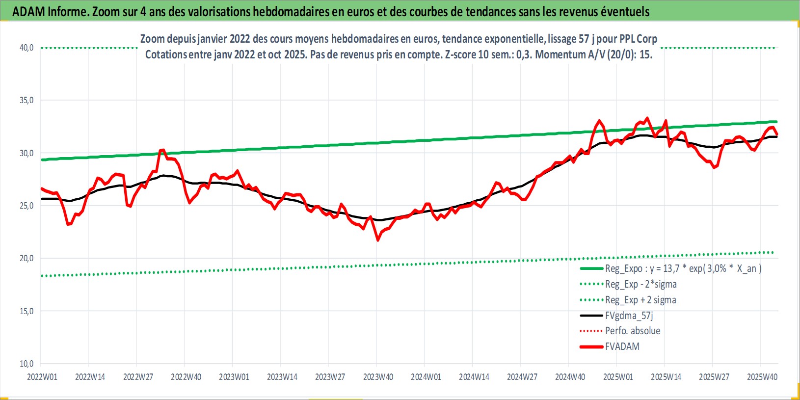 Site dédié aux investisseursPage dédiée sur site financeAnalyse des valorisations hebdomadaires de l'action PPL Corp. Cet actif est cote en USD. Les valorisations sont en contrevaleur EURO et couvrent les semaines 1997W01 a 2025W44. Les revenus de cet actif financier sont pris en compte depuis la semaine 1997W10. La note globale ESG de cet actif est estimee a 4.0 (apres rebasage entre 0 et 20).