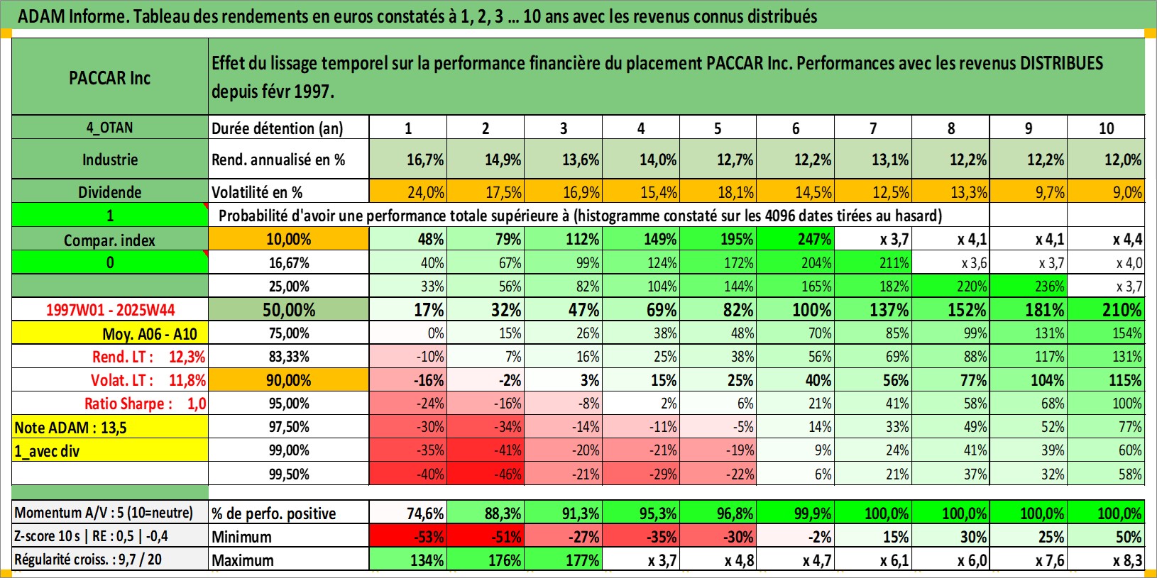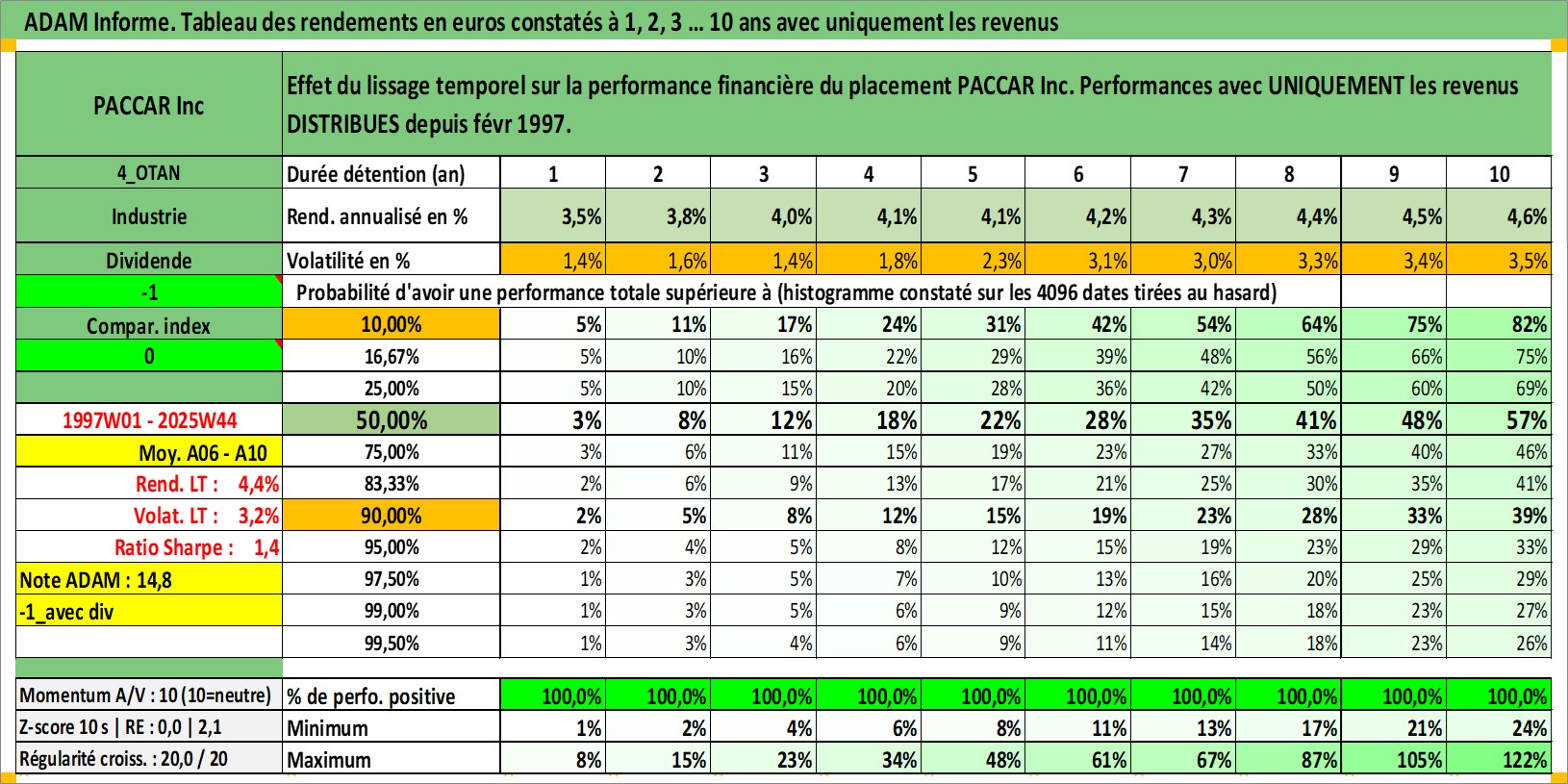 Site dédié aux investisseursPage dédiée sur site financeAnalyse des valorisations hebdomadaires de l'action PACCAR Inc. Cet actif est cote en USD. Les valorisations sont en contrevaleur EURO et couvrent les semaines 1997W01 a 2025W44. Les revenus de cet actif financier sont pris en compte depuis la semaine 1997W08. La note globale ESG de cet actif est estimee a 6.0 (apres rebasage entre 0 et 20).