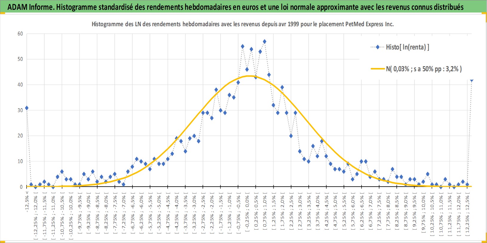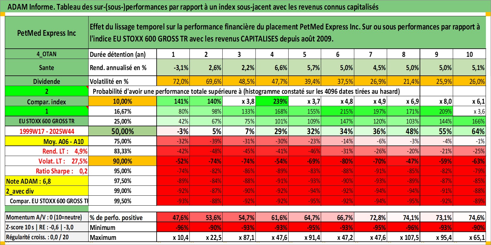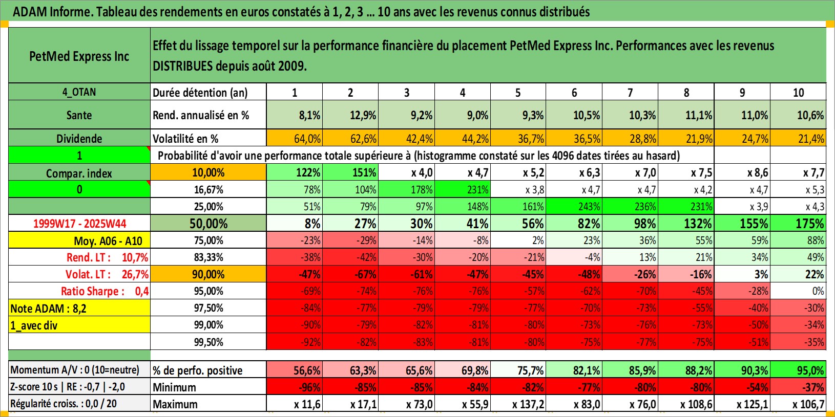 Site dédié aux investisseursPage dédiée sur site financeAnalyse des valorisations hebdomadaires de l'action PetMed Express Inc. Cet actif est cote en USD. Les valorisations sont en contrevaleur EURO et couvrent les semaines 1999W17 a 2025W44. Les revenus de cet actif financier sont pris en compte depuis la semaine 2009W33. La note ESG de cet actif n'est pas connue.