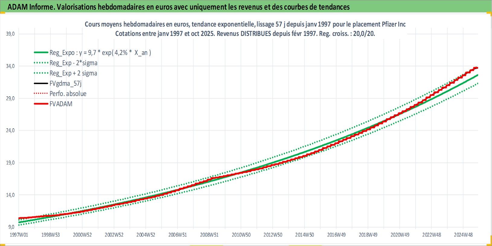 Site dédié aux investisseursPage dédiée sur site financeAnalyse des valorisations hebdomadaires de l'action Pfizer Inc. Cet actif est cote en USD. Les valorisations sont en contrevaleur EURO et couvrent les semaines 1997W01 a 2025W44. Les revenus de cet actif financier sont pris en compte depuis la semaine 1997W06. La note globale ESG de cet actif est estimee a 7.0 (apres rebasage entre 0 et 20).