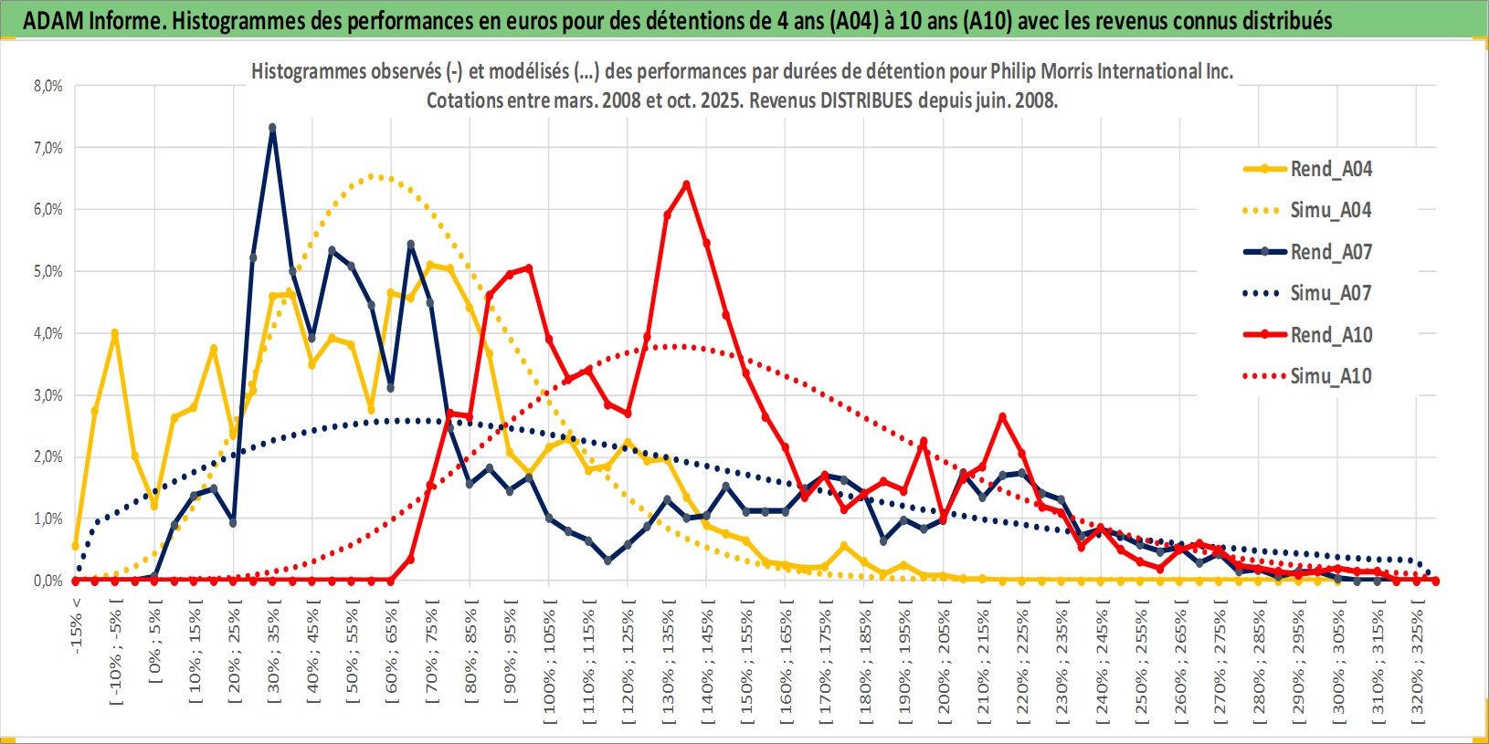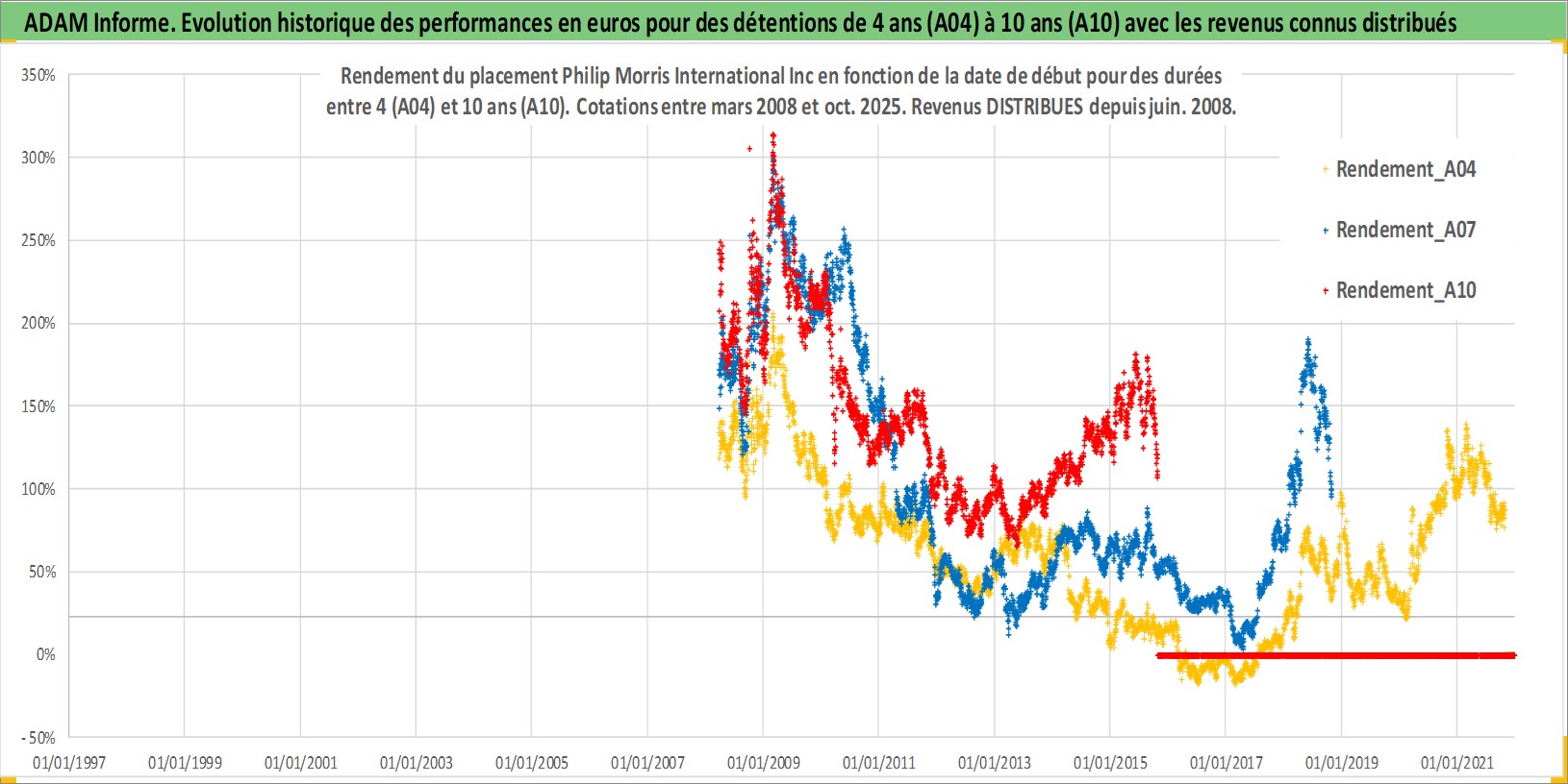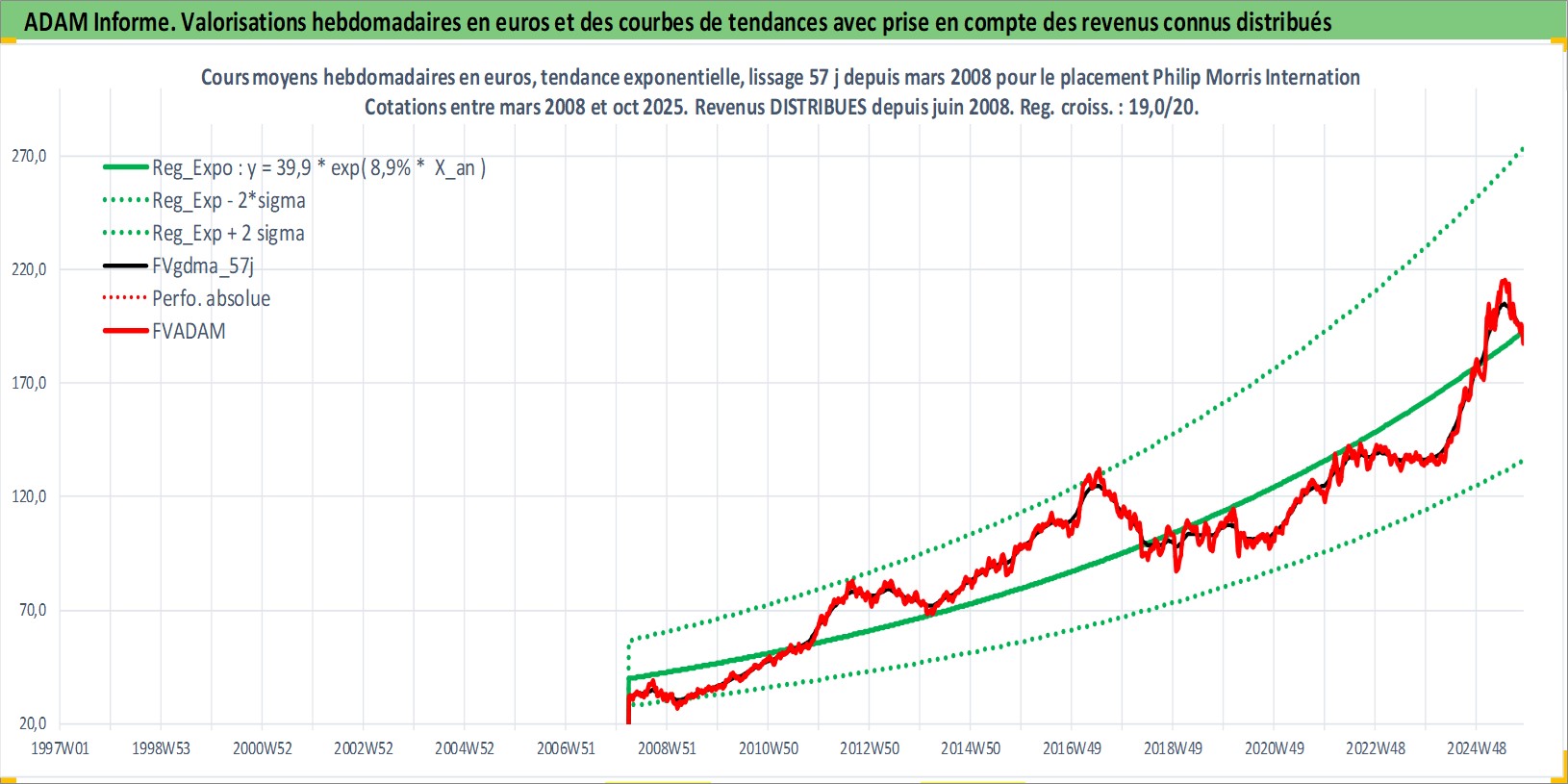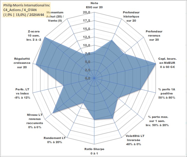 Site dédié aux investisseursPage dédiée sur site financeAnalyse des valorisations hebdomadaires de l'action Philip Morris International Inc. Cet actif est cote en USD. Les valorisations sont en contrevaleur EURO et couvrent les semaines 2008W12 a 2025W44. Les revenus de cet actif financier sont pris en compte depuis la semaine 2008W26. La note globale ESG de cet actif est estimee a 8.0 (apres rebasage entre 0 et 20).