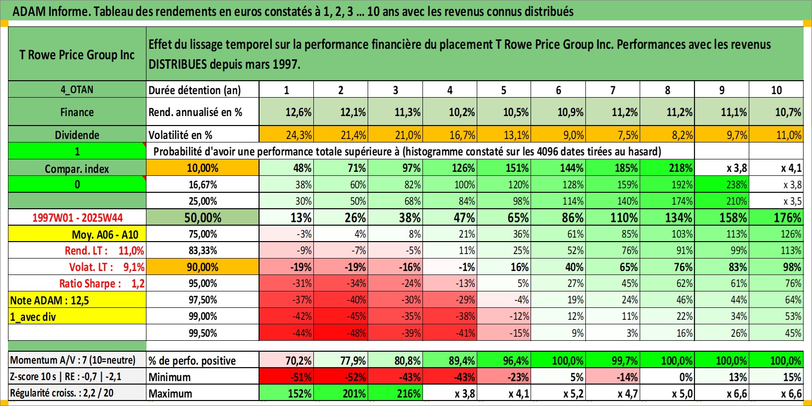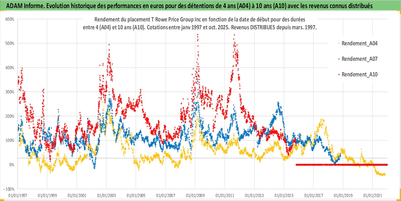 Site dédié aux investisseursPage dédiée sur site financeAnalyse des valorisations hebdomadaires de l'action T Rowe Price Group Inc. Cet actif est cote en USD. Les valorisations sont en contrevaleur EURO et couvrent les semaines 1997W01 a 2025W44. Les revenus de cet actif financier sont pris en compte depuis la semaine 1997W12. La note globale ESG de cet actif est estimee a 12.0 (apres rebasage entre 0 et 20).
