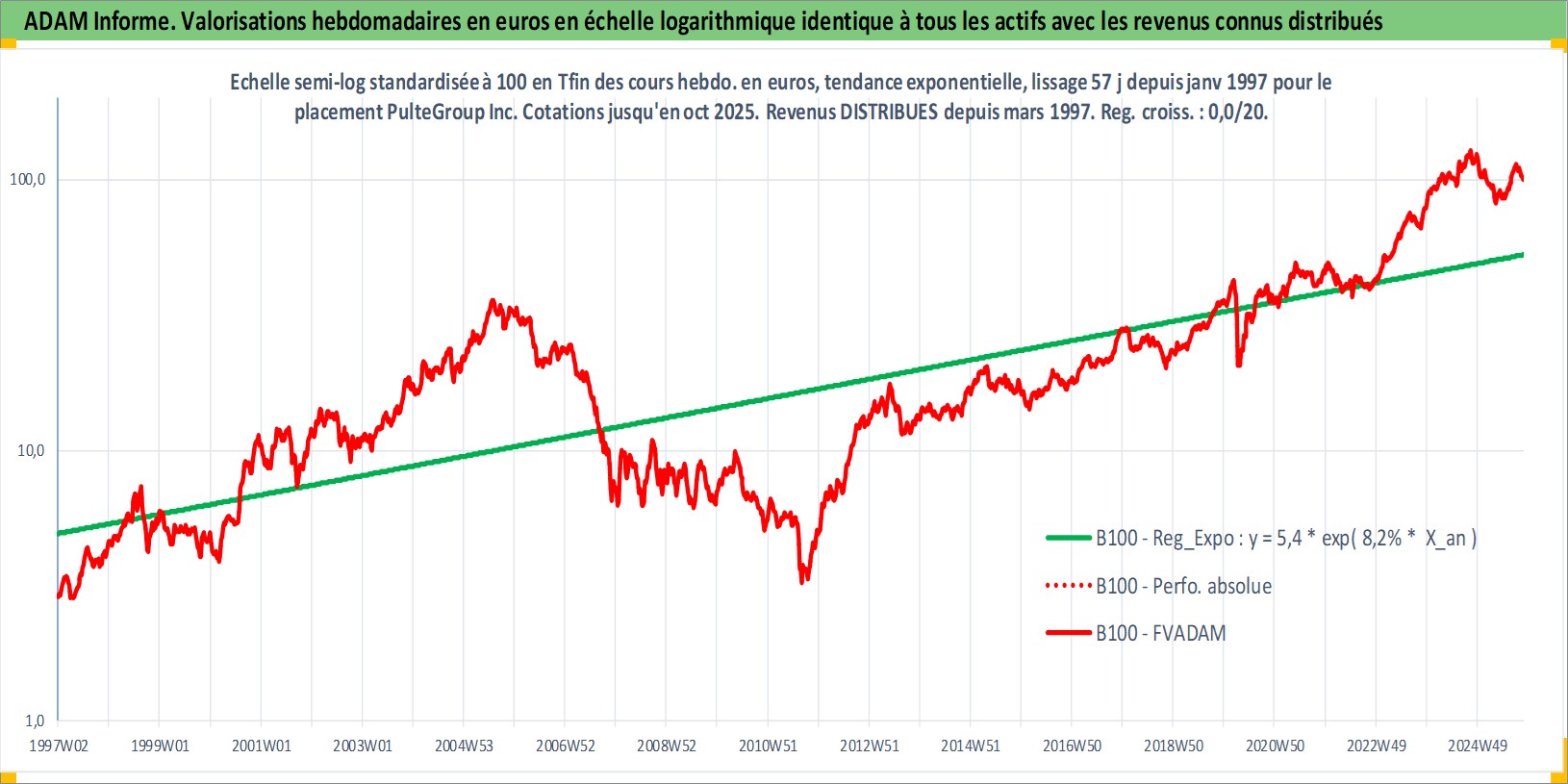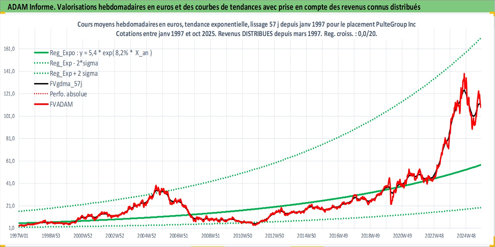 Site dédié aux investisseursPage dédiée sur site financeAnalyse des valorisations hebdomadaires de l'action PulteGroup Inc. Cet actif est cote en USD. Les valorisations sont en contrevaleur EURO et couvrent les semaines 1997W01 a 2025W44. Les revenus de cet actif financier sont pris en compte depuis la semaine 1997W13. La note globale ESG de cet actif est estimee a 10.0 (apres rebasage entre 0 et 20).