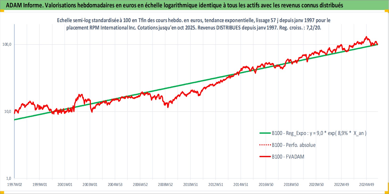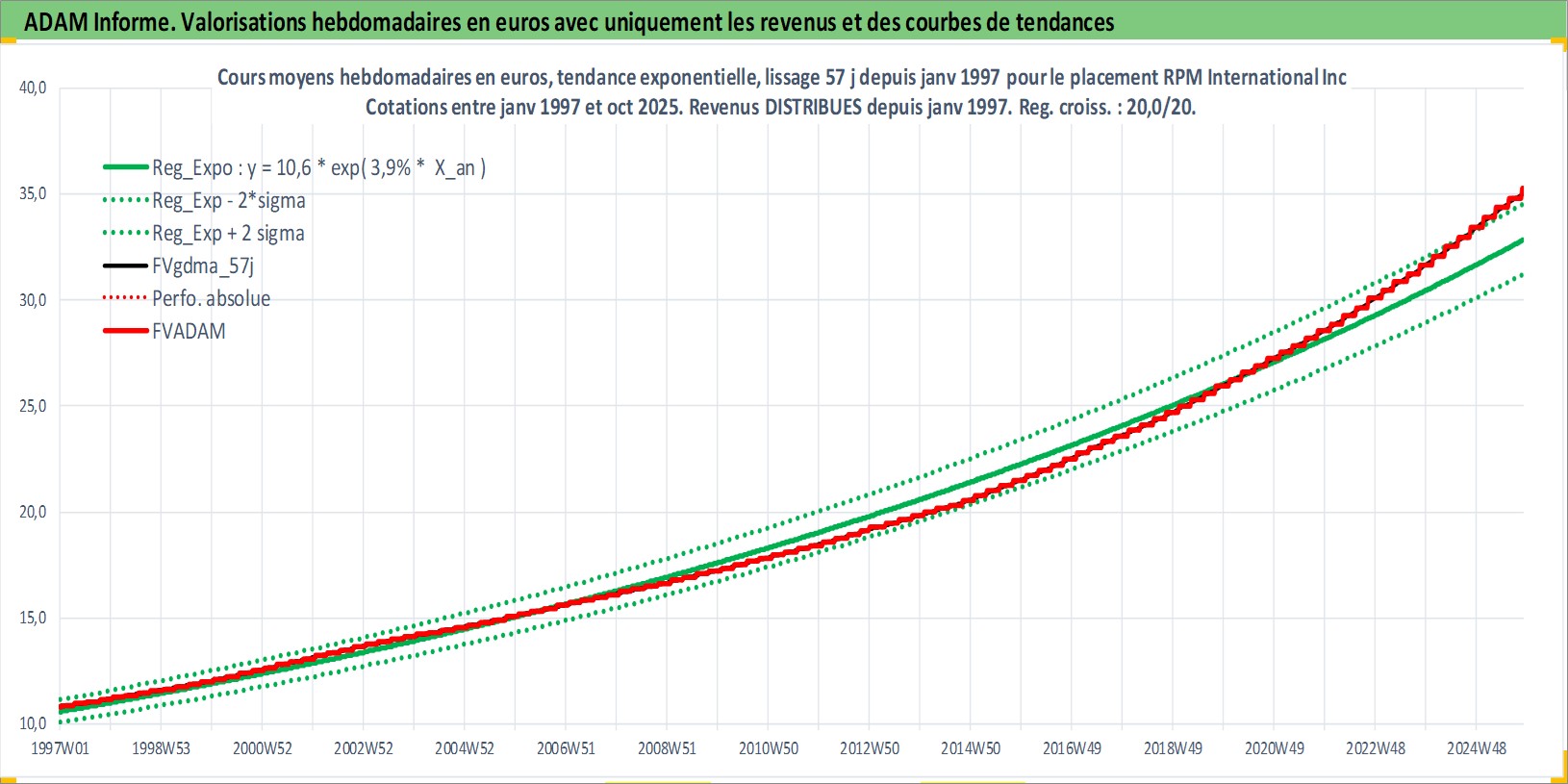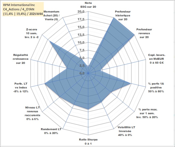 Site dédié aux investisseursPage dédiée sur site financeAnalyse des valorisations hebdomadaires de l'action RPM International Inc. Cet actif est cote en USD. Les valorisations sont en contrevaleur EURO et couvrent les semaines 1997W01 a 2025W44. Les revenus de cet actif financier sont pris en compte depuis la semaine 1997W03. La note globale ESG de cet actif est estimee a 2.0 (apres rebasage entre 0 et 20).