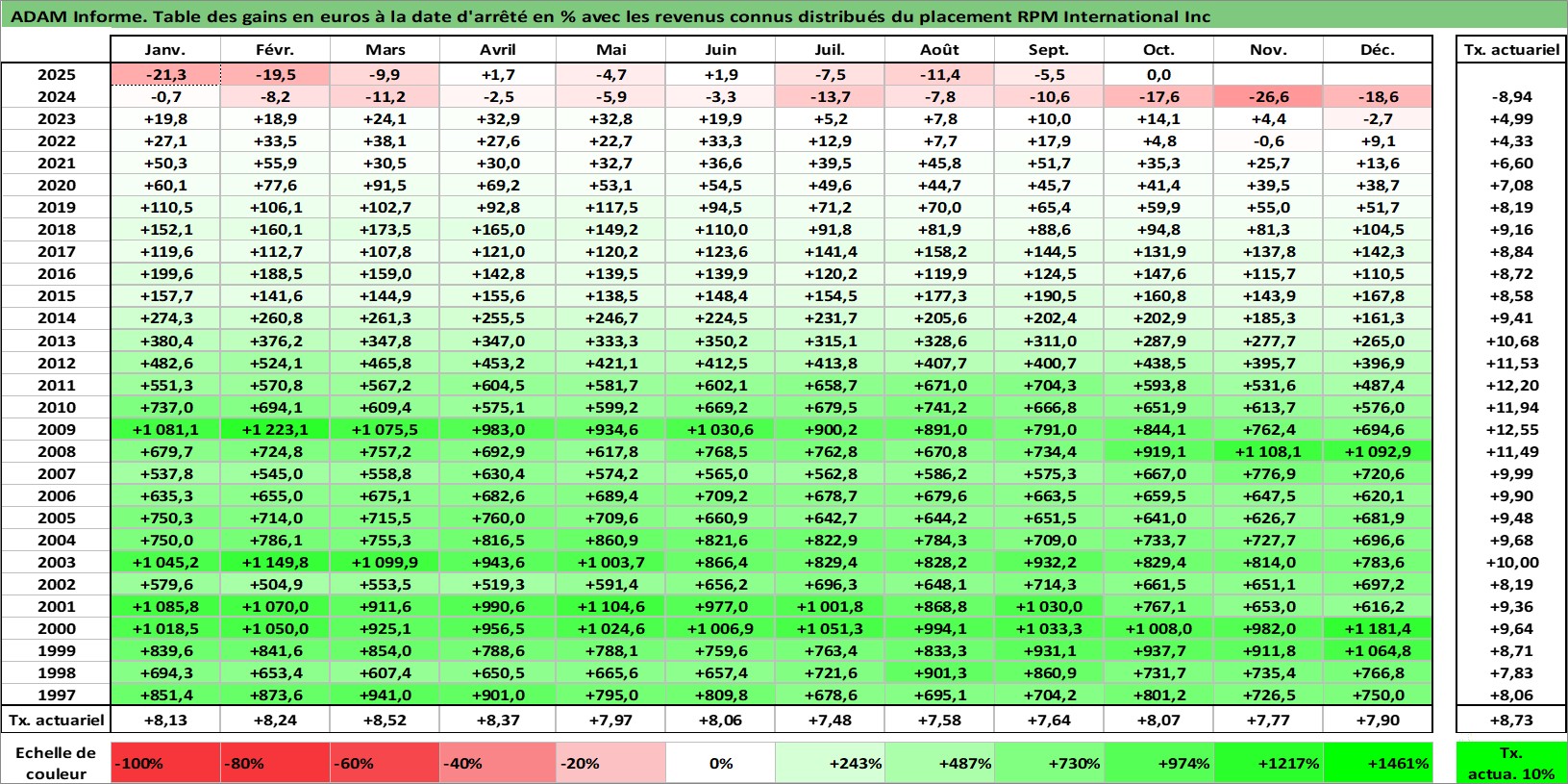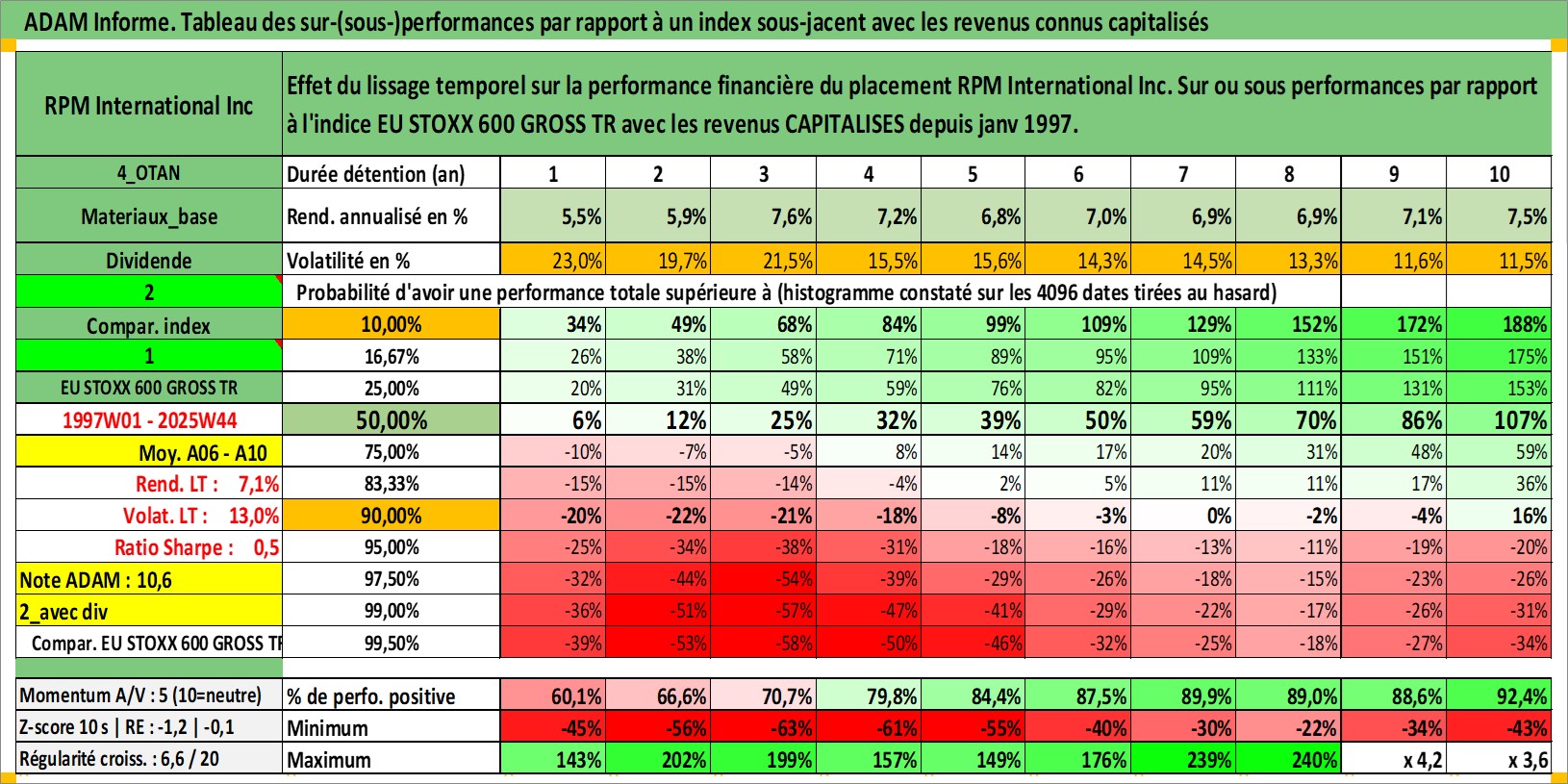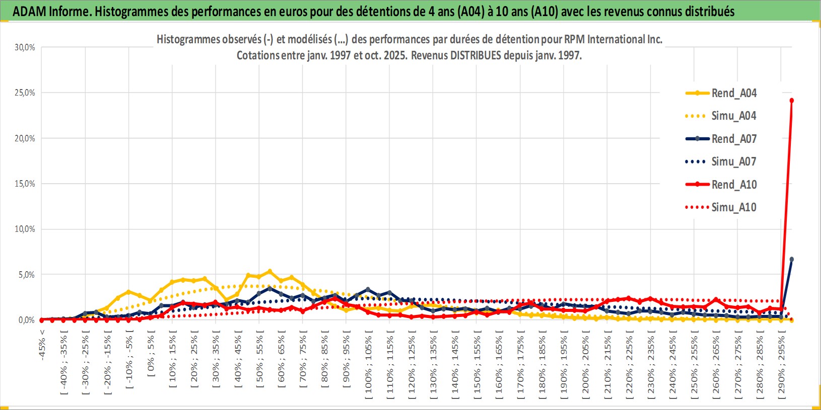 Site dédié aux investisseursPage dédiée sur site financeAnalyse des valorisations hebdomadaires de l'action RPM International Inc. Cet actif est cote en USD. Les valorisations sont en contrevaleur EURO et couvrent les semaines 1997W01 a 2025W44. Les revenus de cet actif financier sont pris en compte depuis la semaine 1997W03. La note globale ESG de cet actif est estimee a 2.0 (apres rebasage entre 0 et 20).