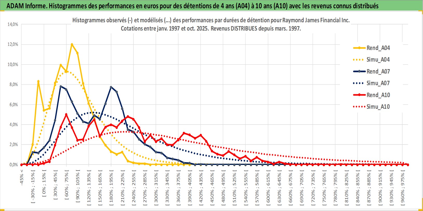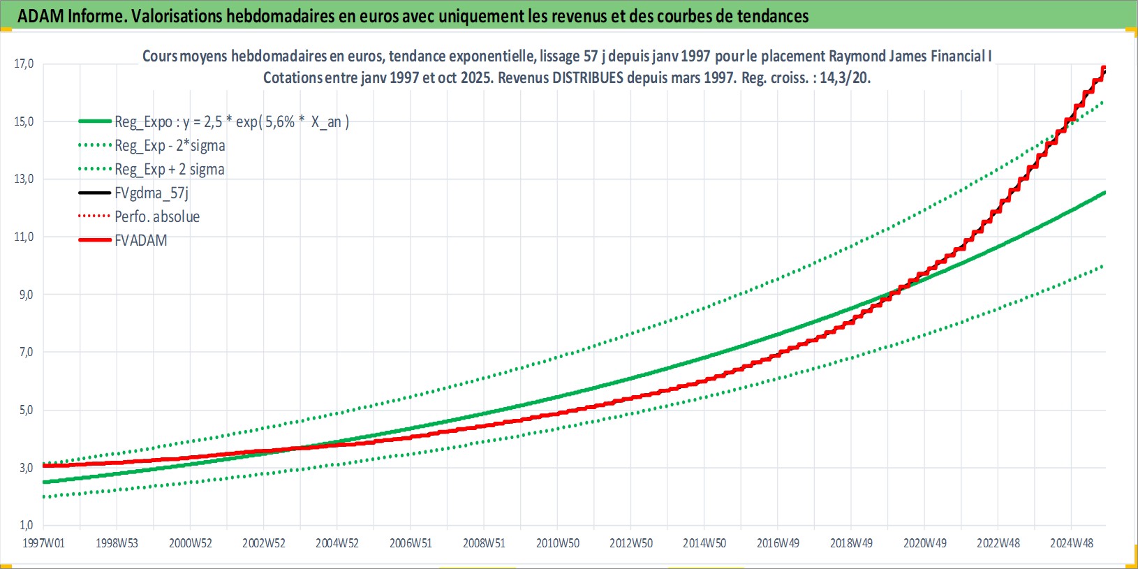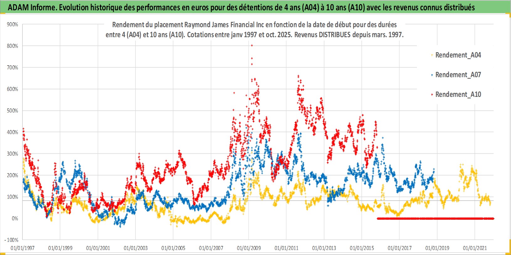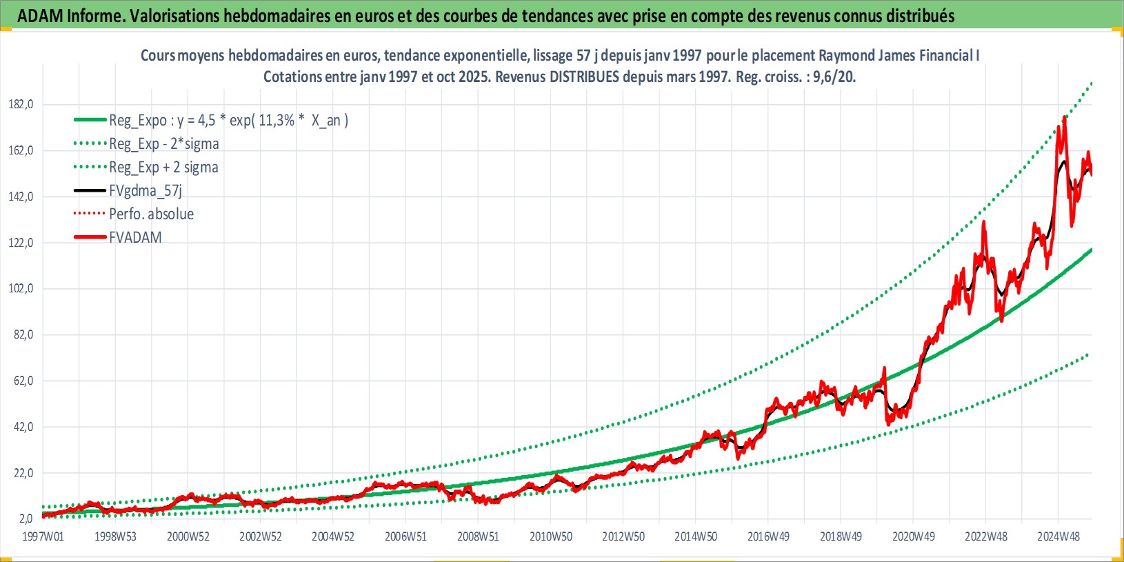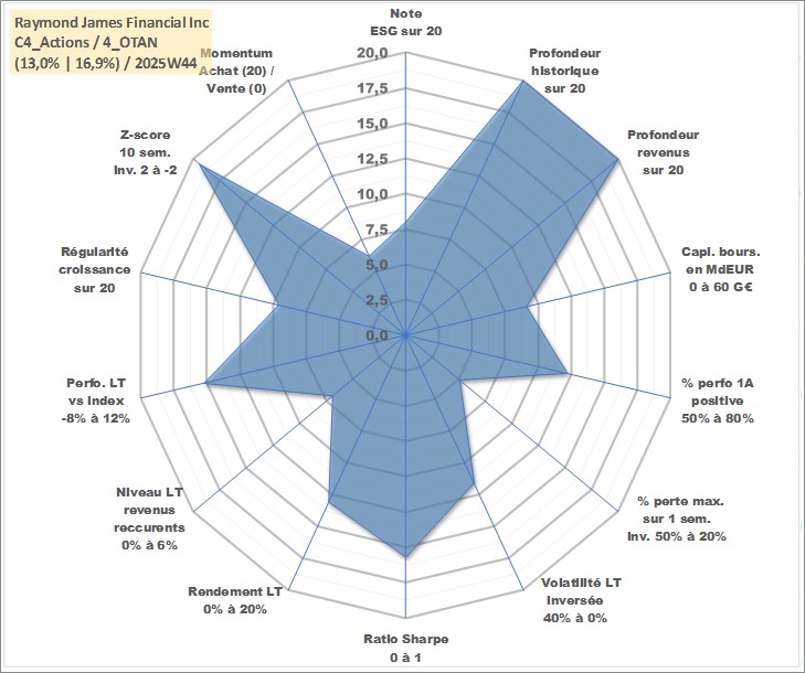 Site dédié aux investisseursPage dédiée sur site financeAnalyse des valorisations hebdomadaires de l'action Raymond James Financial Inc. Cet actif est cote en USD. Les valorisations sont en contrevaleur EURO et couvrent les semaines 1997W01 a 2025W44. Les revenus de cet actif financier sont pris en compte depuis la semaine 1997W10. La note globale ESG de cet actif est estimee a 8.0 (apres rebasage entre 0 et 20).