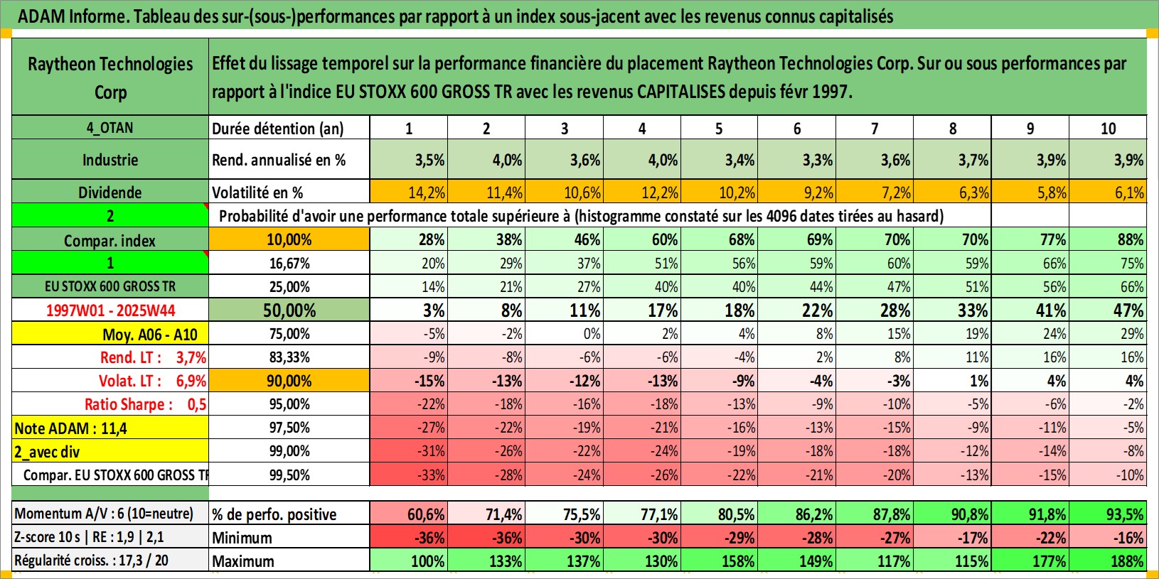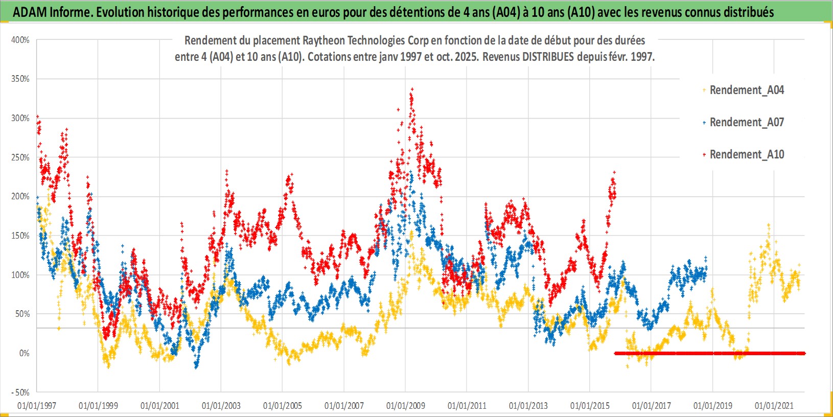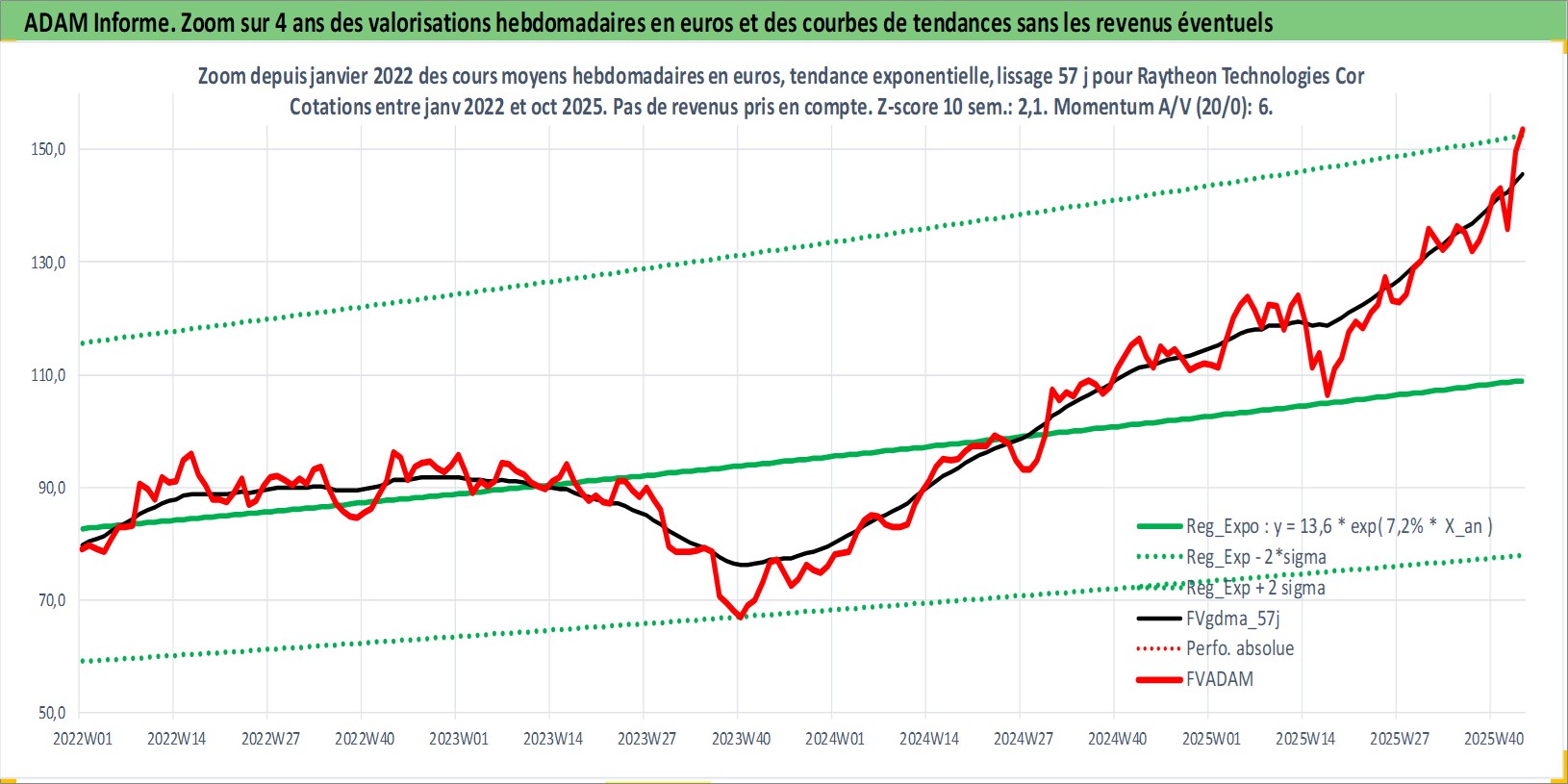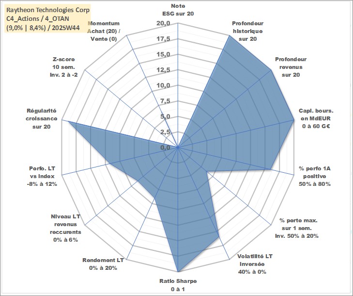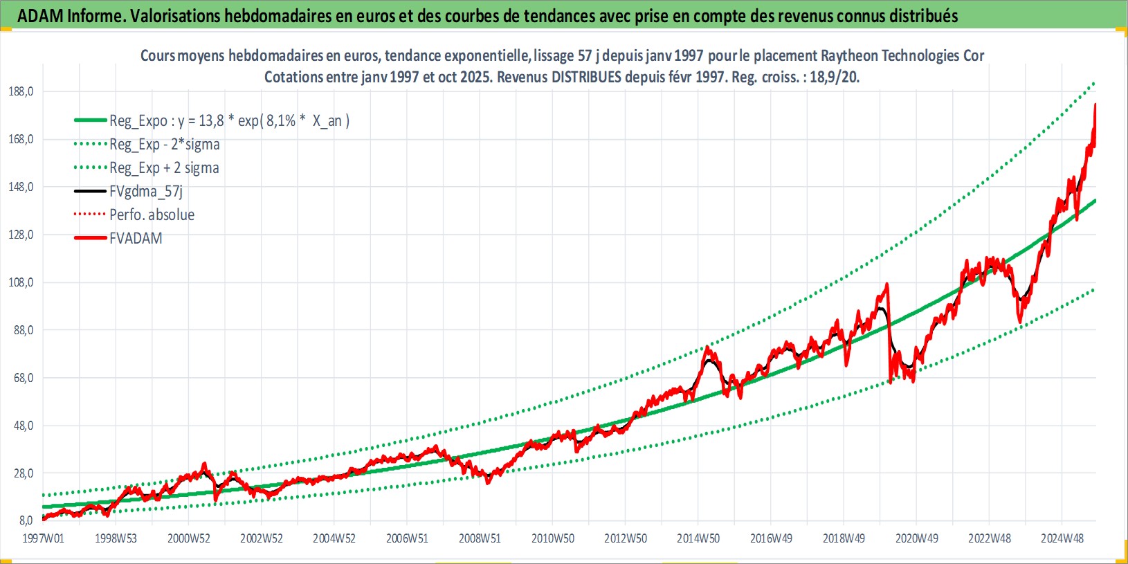 Site dédié aux investisseursPage dédiée sur site financeAnalyse des valorisations hebdomadaires de l'action Raytheon Technologies Corp. Cet actif est cote en USD. Les valorisations sont en contrevaleur EURO et couvrent les semaines 1997W01 a 2025W44. Les revenus de cet actif financier sont pris en compte depuis la semaine 1997W08. La note ESG de cet actif n'est pas connue.