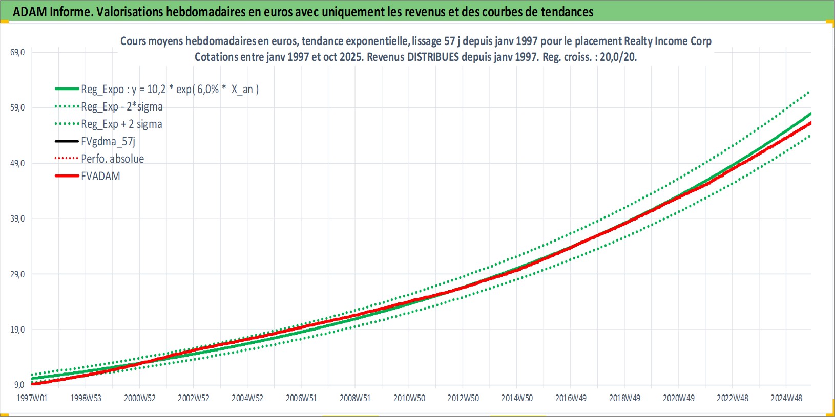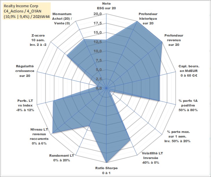Site dédié aux investisseursPage dédiée sur site financeAnalyse des valorisations hebdomadaires de l'action Realty Income Corp. Cet actif est cote en USD. Les valorisations sont en contrevaleur EURO et couvrent les semaines 1997W01 a 2025W44. Les revenus de cet actif financier sont pris en compte depuis la semaine 1997W05. La note globale ESG de cet actif est estimee a 13.0 (apres rebasage entre 0 et 20).