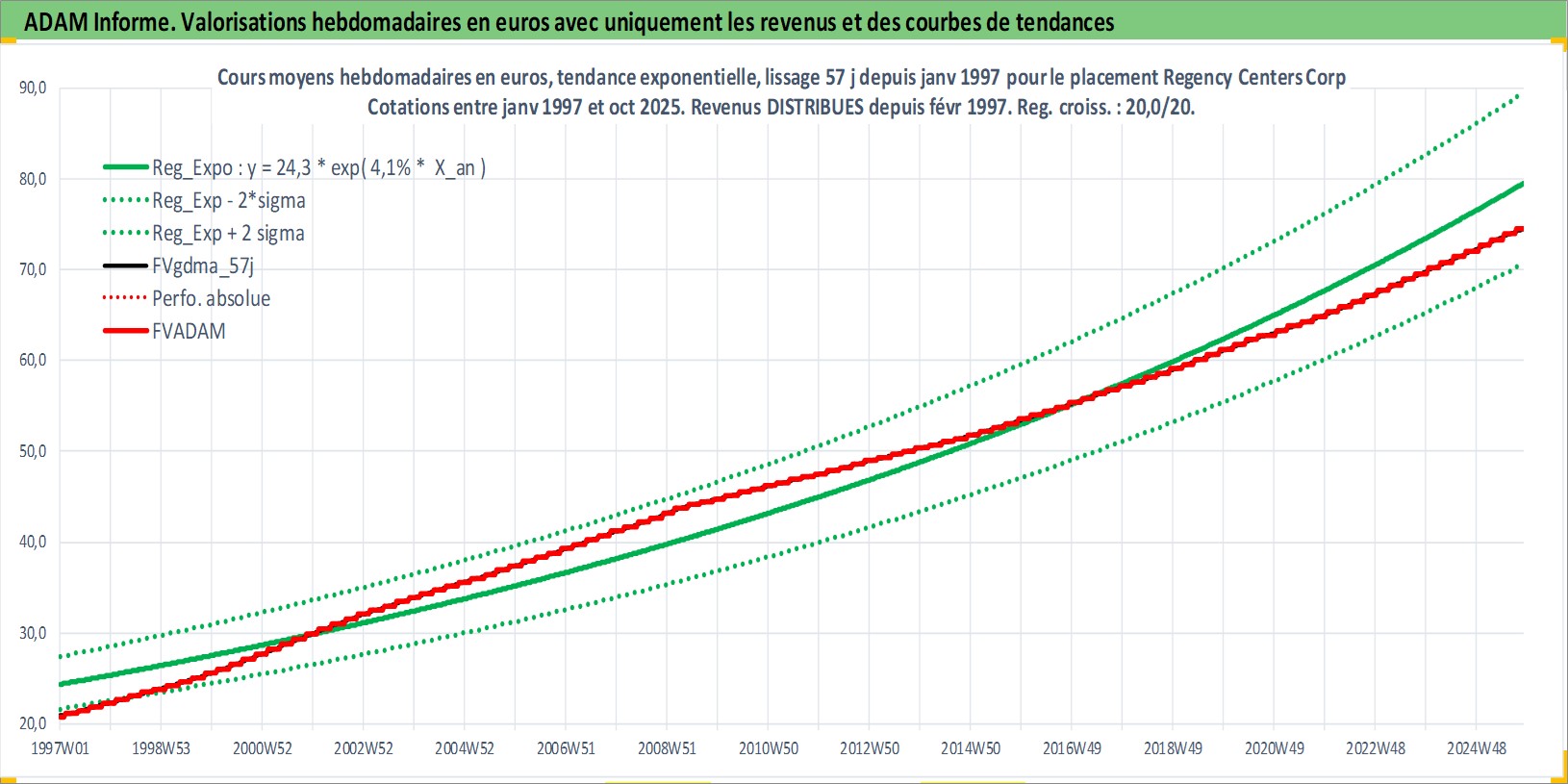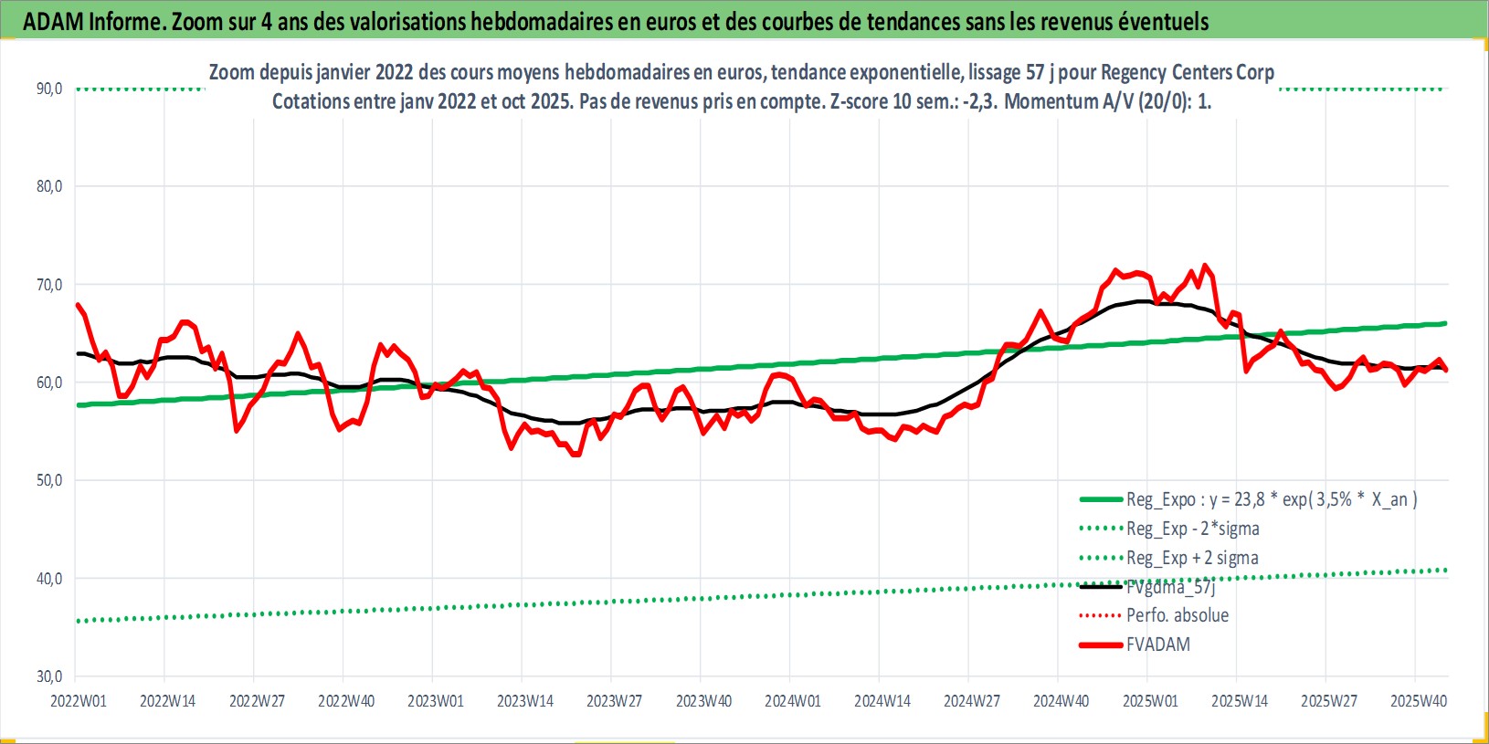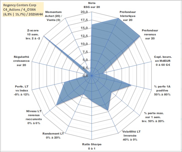 Site dédié aux investisseursPage dédiée sur site financeAnalyse des valorisations hebdomadaires de l'action Regency Centers Corp. Cet actif est cote en USD. Les valorisations sont en contrevaleur EURO et couvrent les semaines 1997W01 a 2025W44. Les revenus de cet actif financier sont pris en compte depuis la semaine 1997W07. La note globale ESG de cet actif est estimee a 16.0 (apres rebasage entre 0 et 20).
