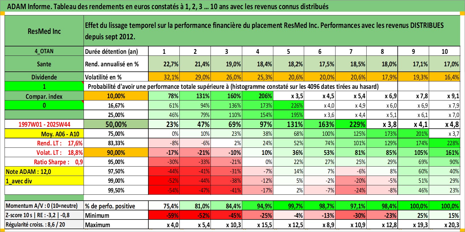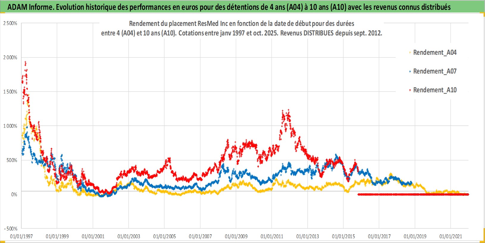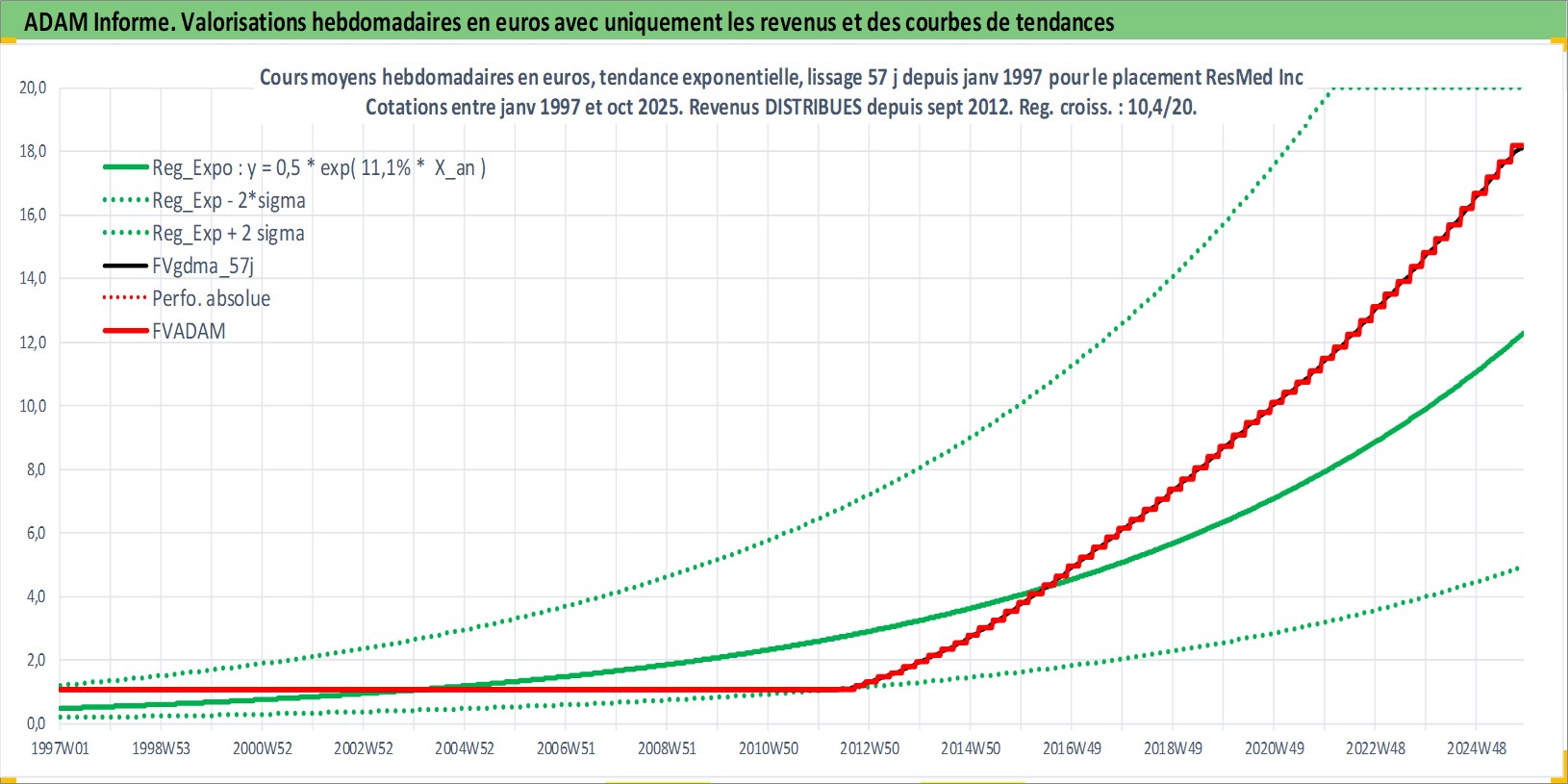 Site dédié aux investisseursPage dédiée sur site financeAnalyse des valorisations hebdomadaires de l'action ResMed Inc. Cet actif est cote en USD. Les valorisations sont en contrevaleur EURO et couvrent les semaines 1997W01 a 2025W44. Les revenus de cet actif financier sont pris en compte depuis la semaine 2012W36. La note globale ESG de cet actif est estimee a 7.0 (apres rebasage entre 0 et 20).