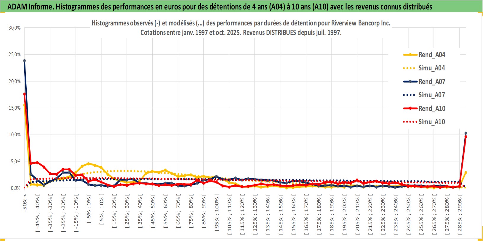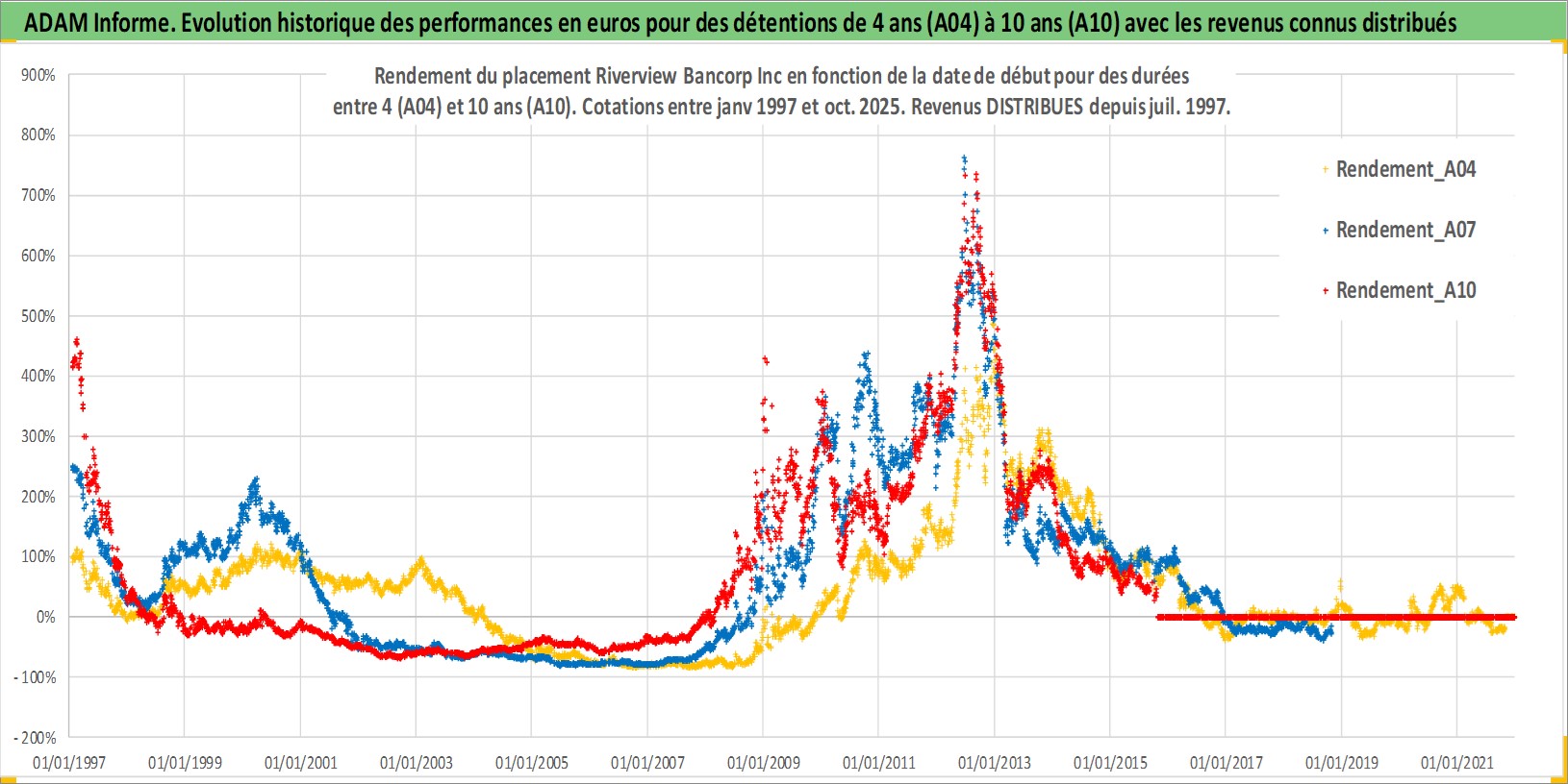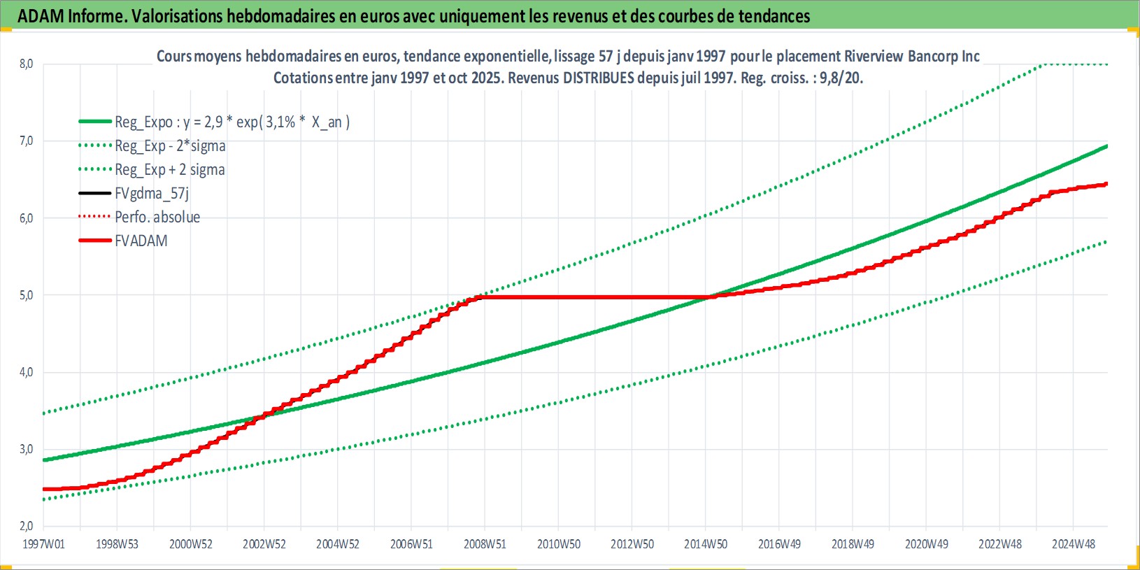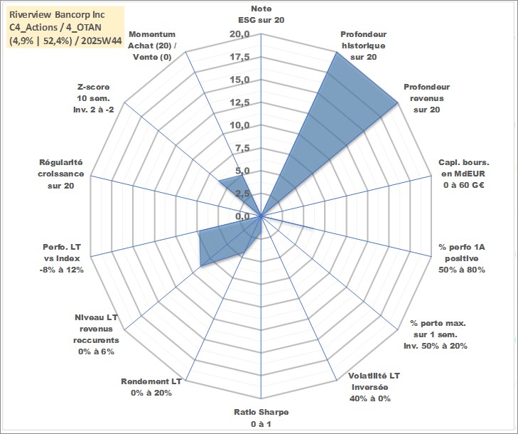 Site dédié aux investisseursPage dédiée sur site financeAnalyse des valorisations hebdomadaires de l'action Riverview Bancorp Inc. Cet actif est cote en USD. Les valorisations sont en contrevaleur EURO et couvrent les semaines 1997W01 a 2025W44. Les revenus de cet actif financier sont pris en compte depuis la semaine 1997W27. La note ESG de cet actif n'est pas connue.