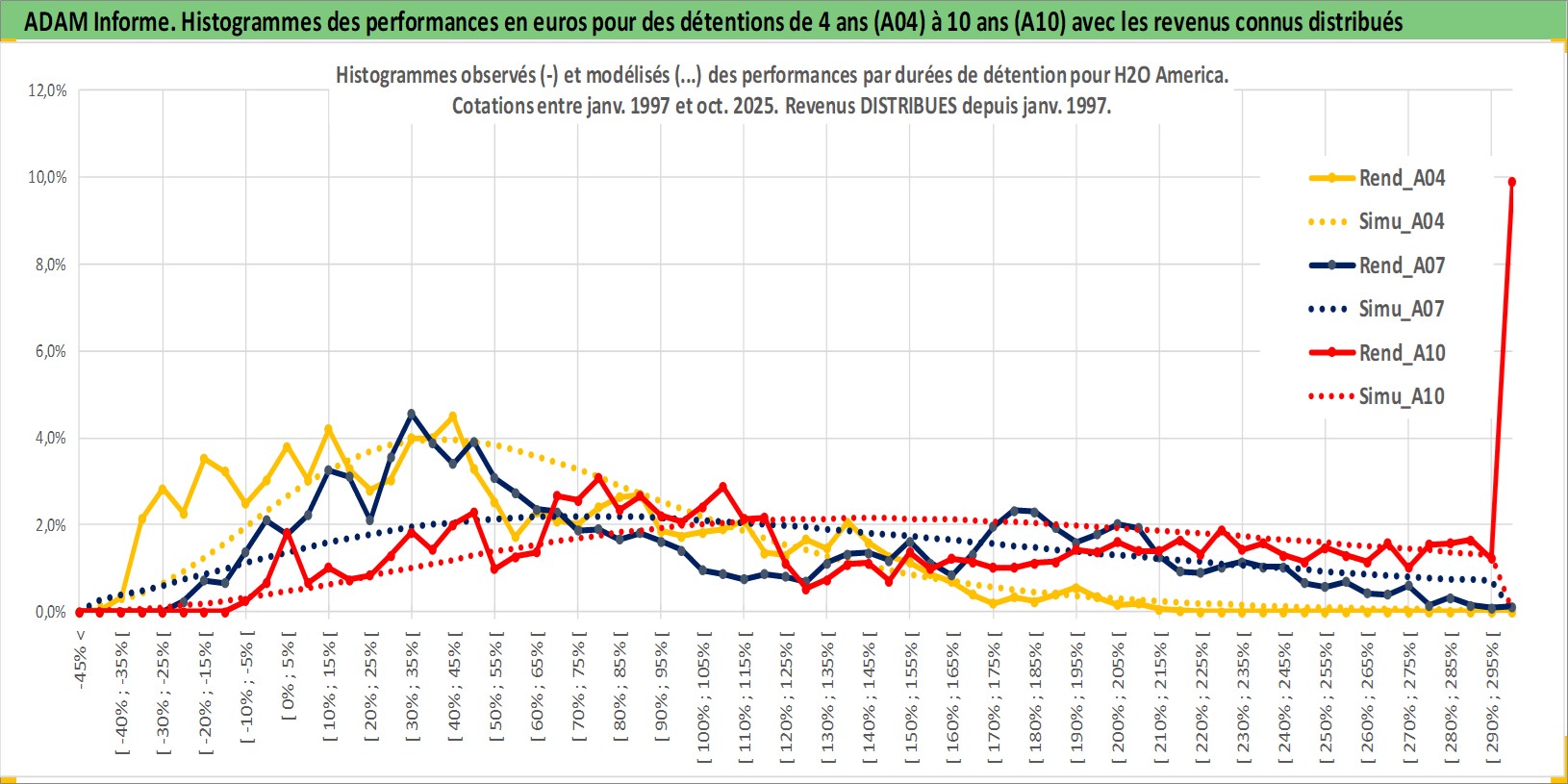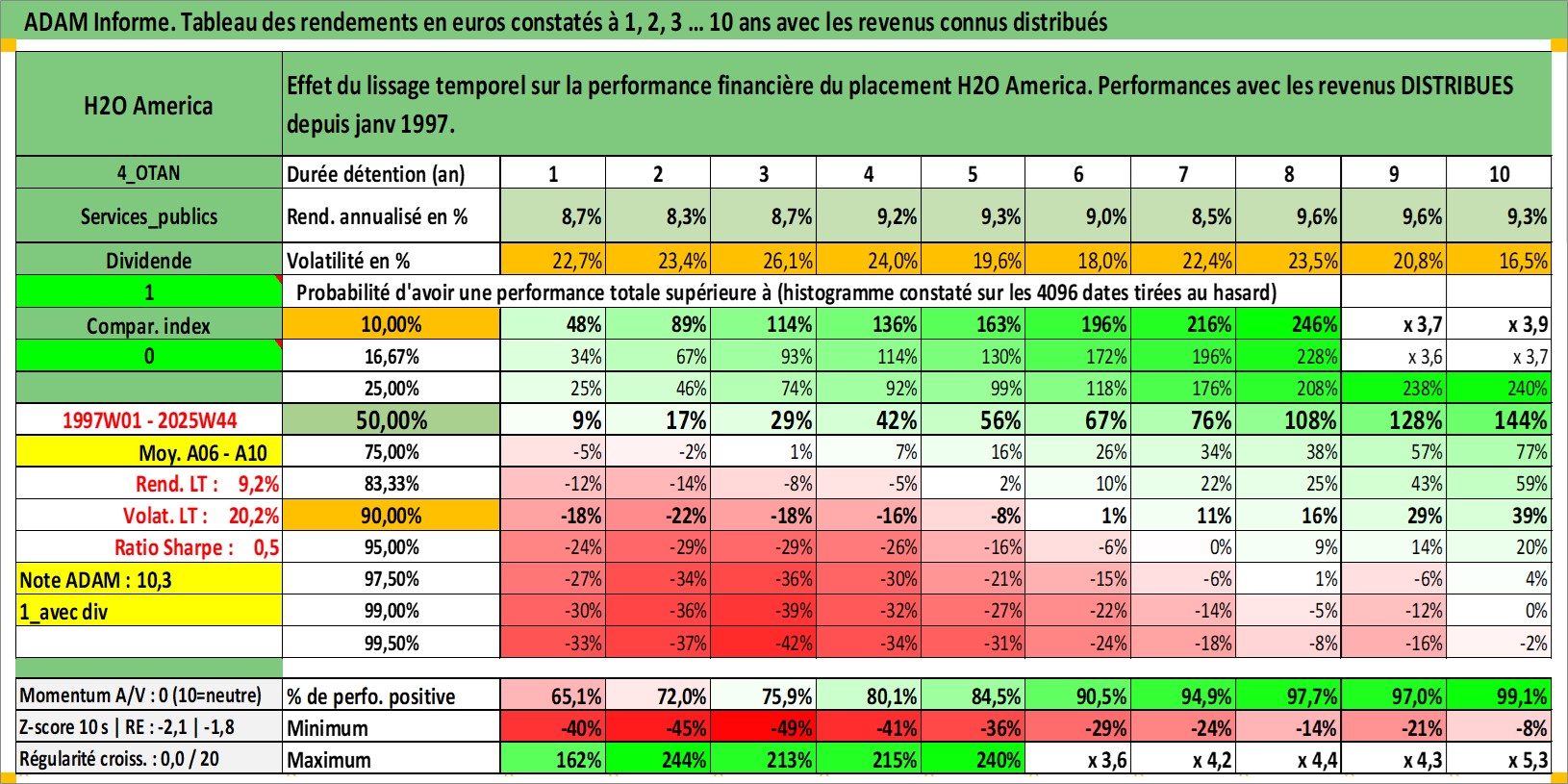Site dédié aux investisseursPage dédiée sur site financeAnalyse des valorisations hebdomadaires de l'action H2O America. Cet actif est cote en USD. Les valorisations sont en contrevaleur EURO et couvrent les semaines 1997W01 a 2025W44. Les revenus de cet actif financier sont pris en compte depuis la semaine 1997W05. La note ESG de cet actif n'est pas connue.
