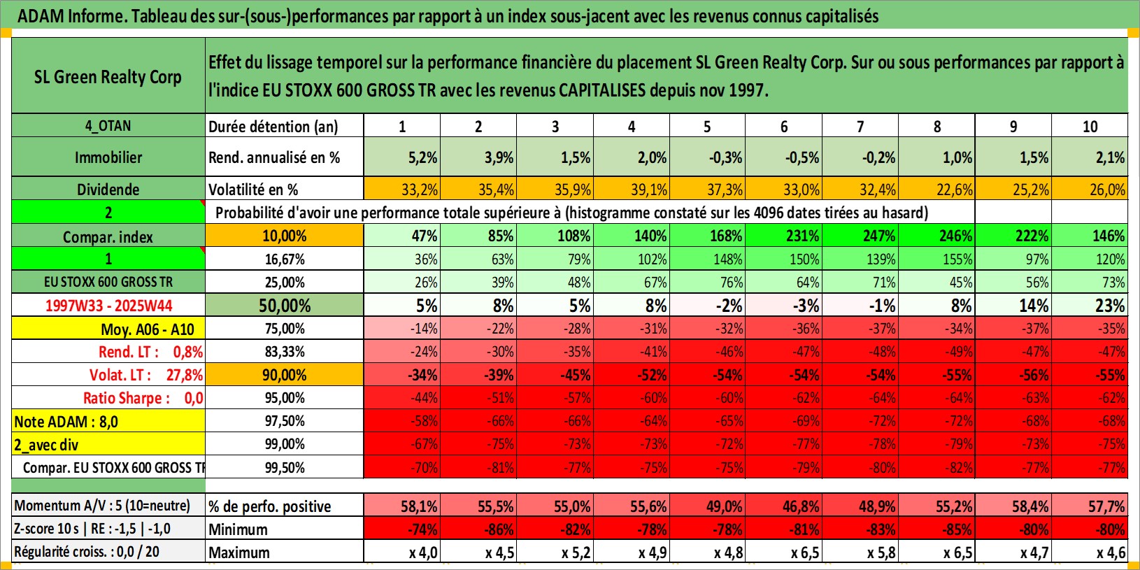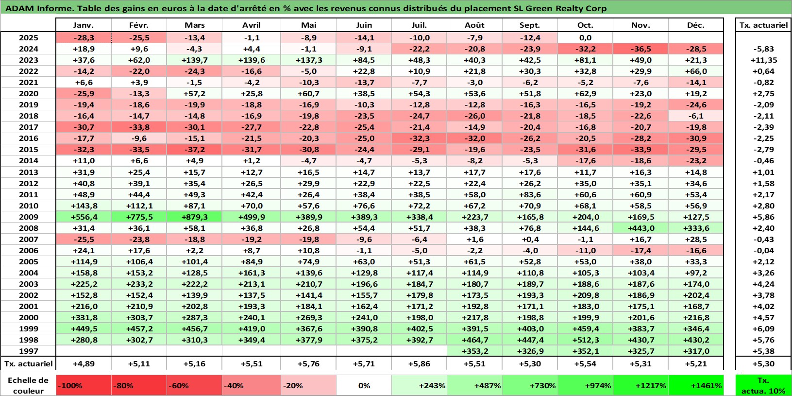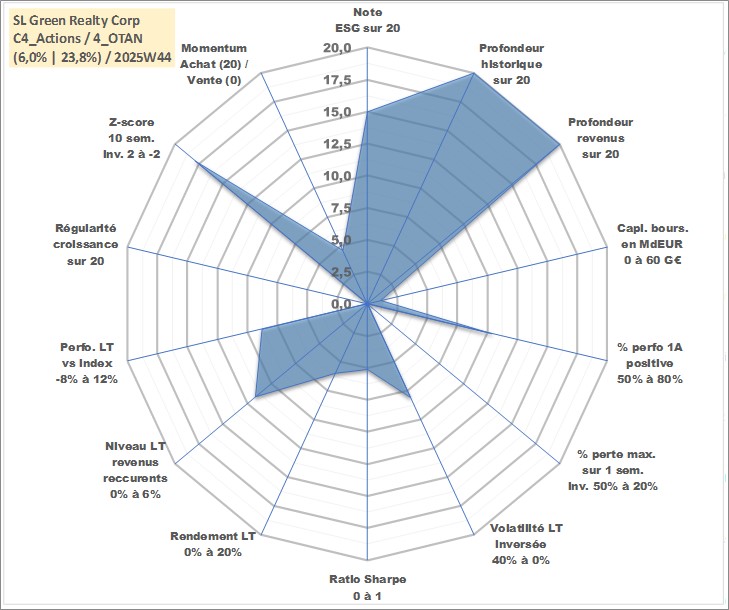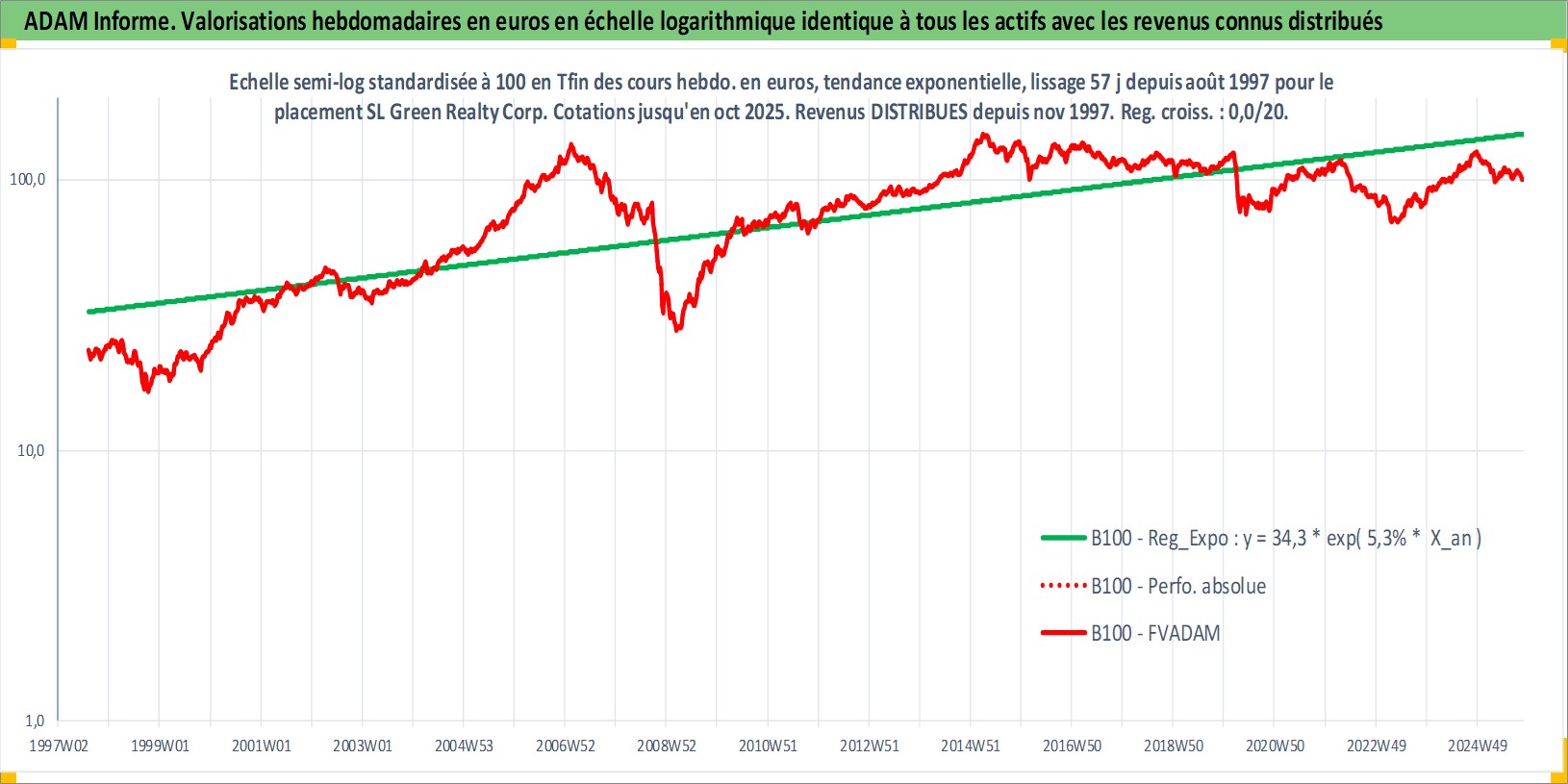 Site dédié aux investisseursPage dédiée sur site financeAnalyse des valorisations hebdomadaires de l'action SL Green Realty Corp. Cet actif est cote en USD. Les valorisations sont en contrevaleur EURO et couvrent les semaines 1997W33 a 2025W44. Les revenus de cet actif financier sont pris en compte depuis la semaine 1997W46. La note globale ESG de cet actif est estimee a 15.0 (apres rebasage entre 0 et 20).