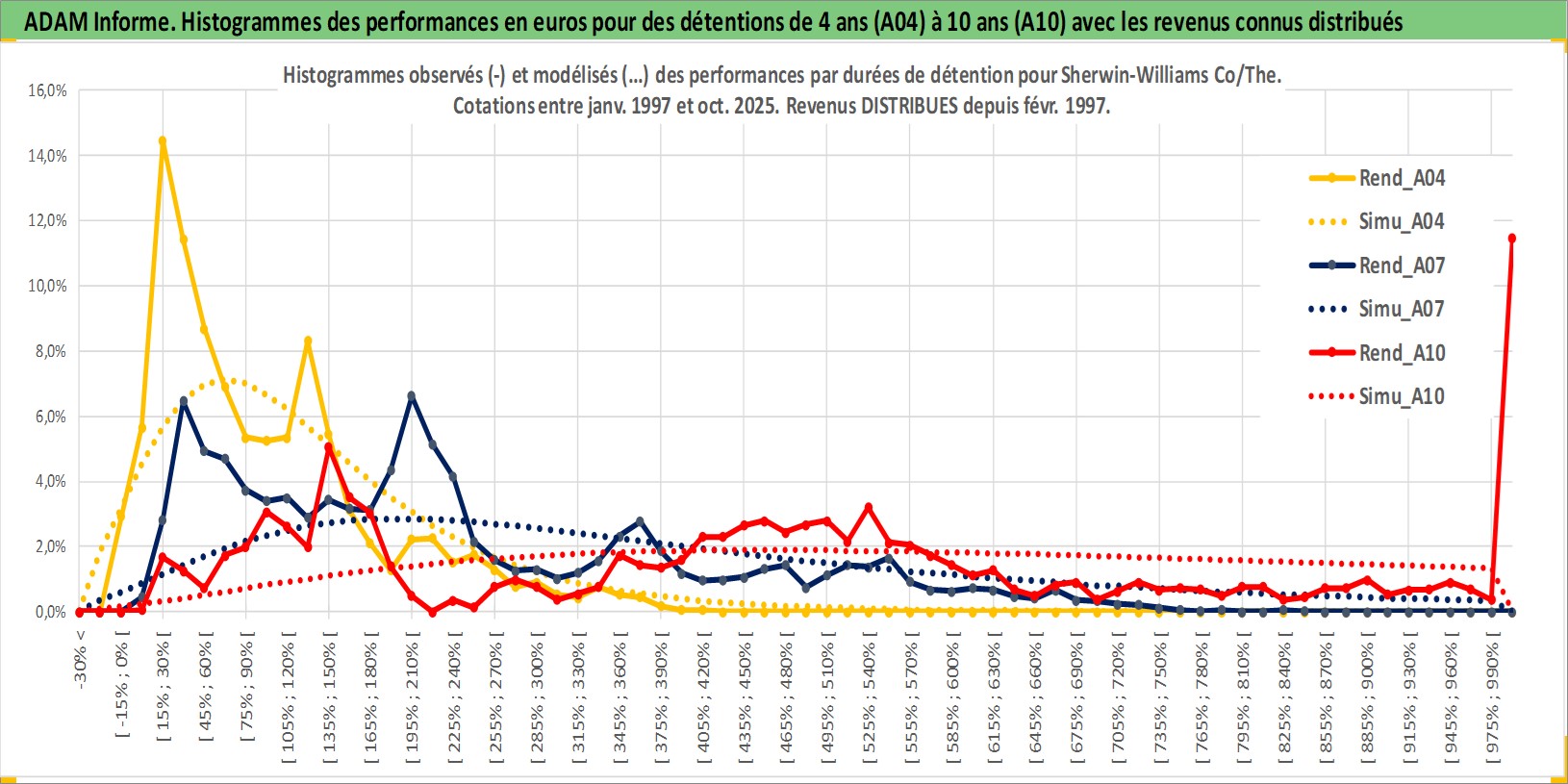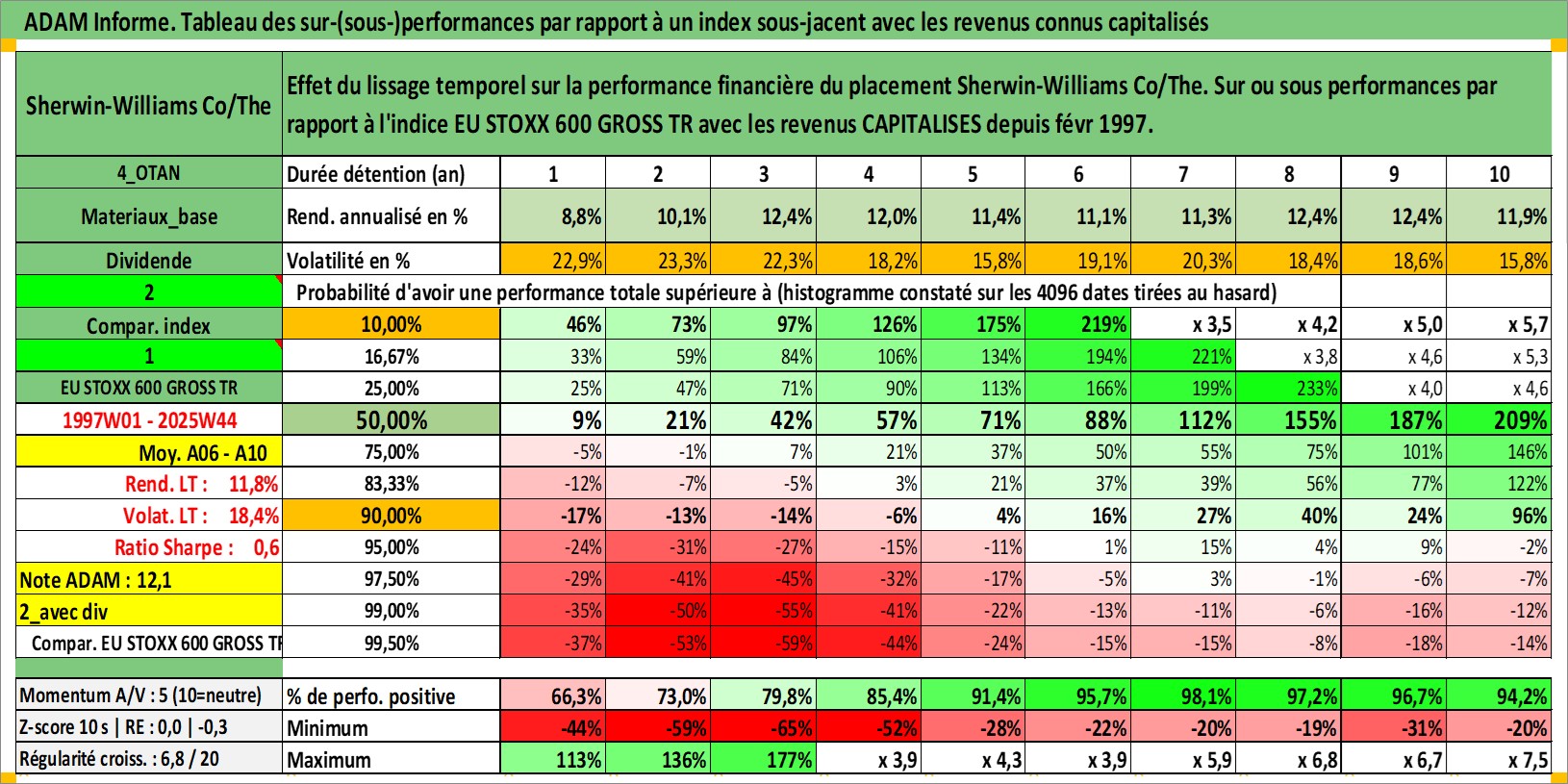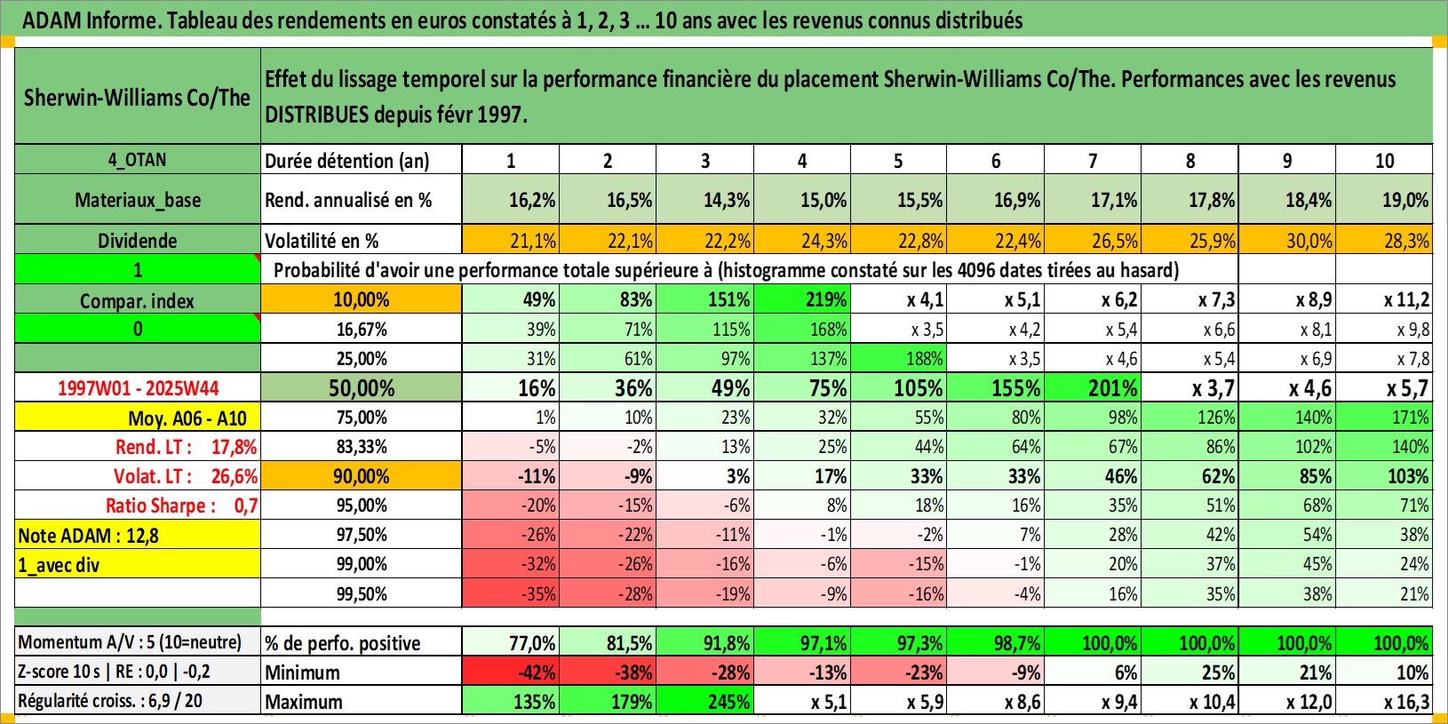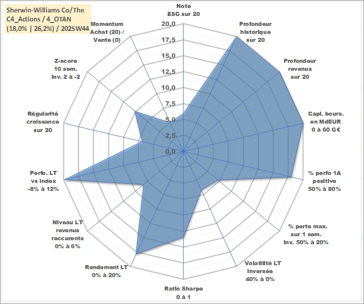 Site dédié aux investisseursPage dédiée sur site financeAnalyse des valorisations hebdomadaires de l'action Sherwin-Williams Co/The. Cet actif est cote en USD. Les valorisations sont en contrevaleur EURO et couvrent les semaines 1997W01 a 2025W44. Les revenus de cet actif financier sont pris en compte depuis la semaine 1997W09. La note globale ESG de cet actif est estimee a 6.0 (apres rebasage entre 0 et 20).