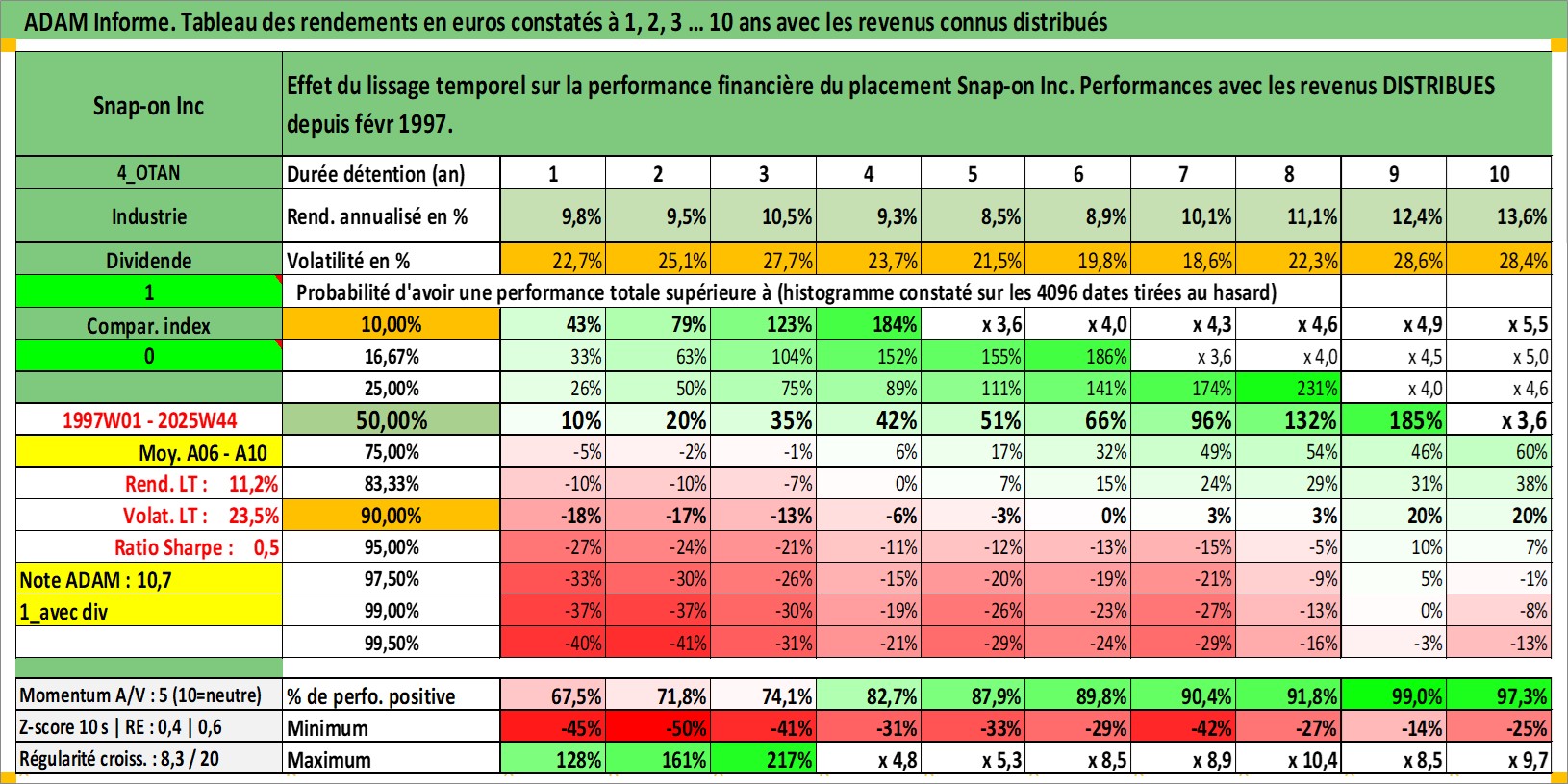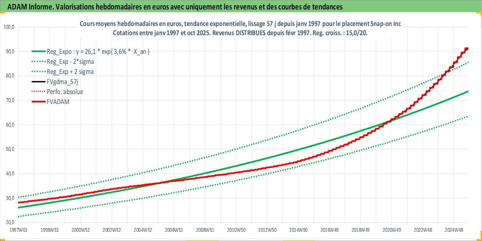 Site dédié aux investisseursPage dédiée sur site financeAnalyse des valorisations hebdomadaires de l'action Snap-on Inc. Cet actif est cote en USD. Les valorisations sont en contrevaleur EURO et couvrent les semaines 1997W01 a 2025W44. Les revenus de cet actif financier sont pris en compte depuis la semaine 1997W07. La note globale ESG de cet actif est estimee a 5.0 (apres rebasage entre 0 et 20).