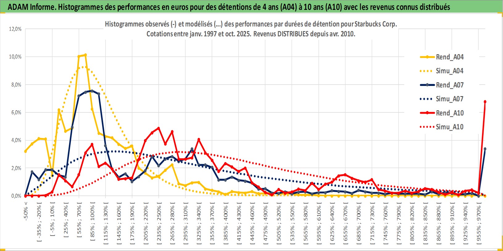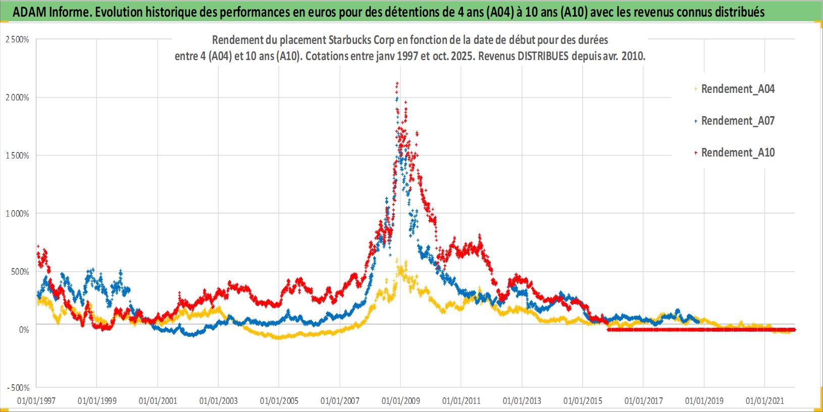 Site dédié aux investisseursPage dédiée sur site financeAnalyse des valorisations hebdomadaires de l'action Starbucks Corp. Cet actif est cote en USD. Les valorisations sont en contrevaleur EURO et couvrent les semaines 1997W01 a 2025W44. Les revenus de cet actif financier sont pris en compte depuis la semaine 2010W14. La note globale ESG de cet actif est estimee a 7.0 (apres rebasage entre 0 et 20).