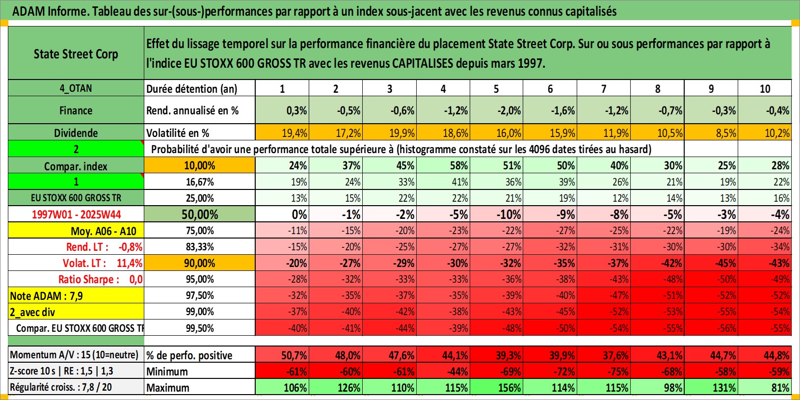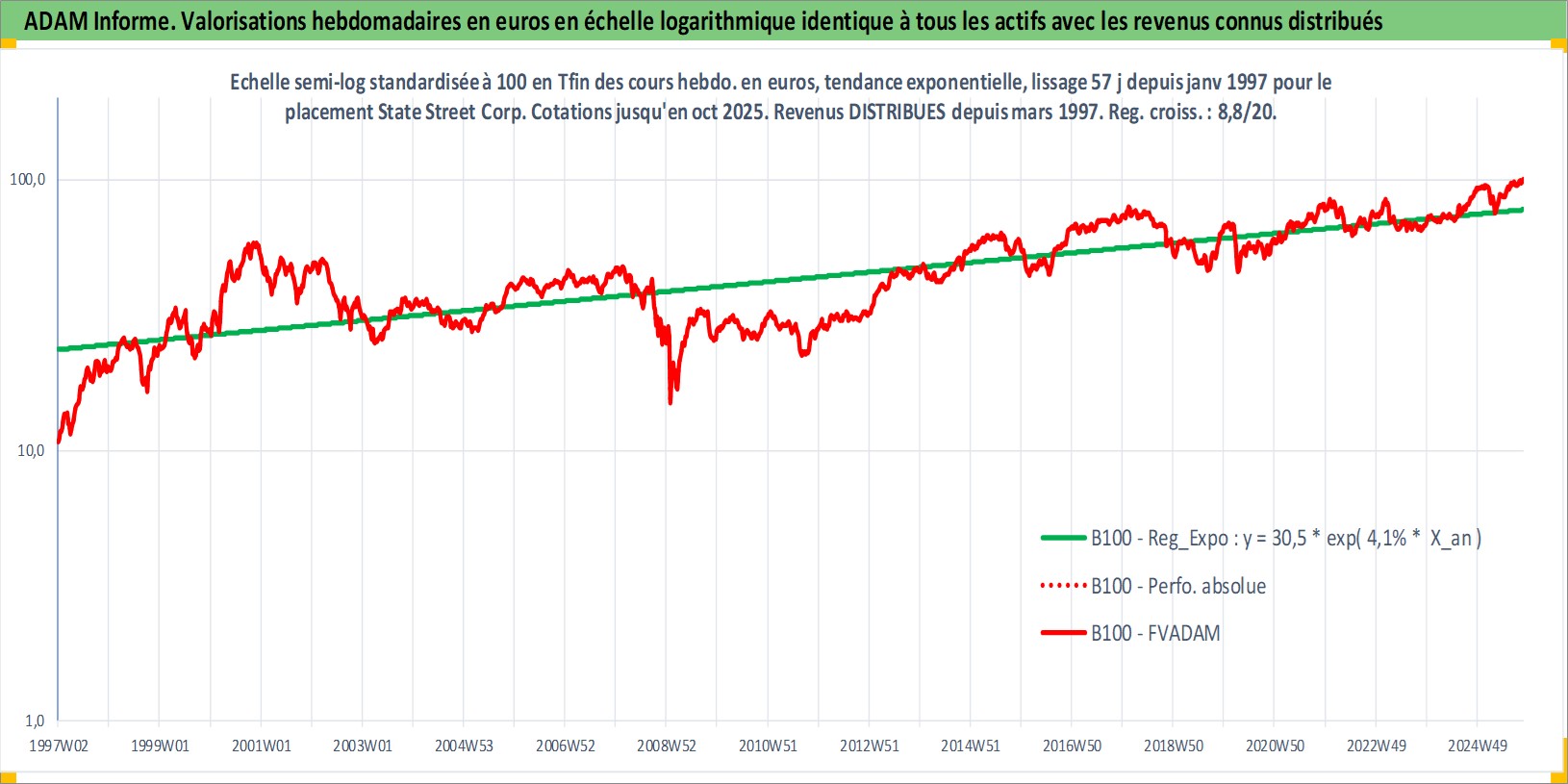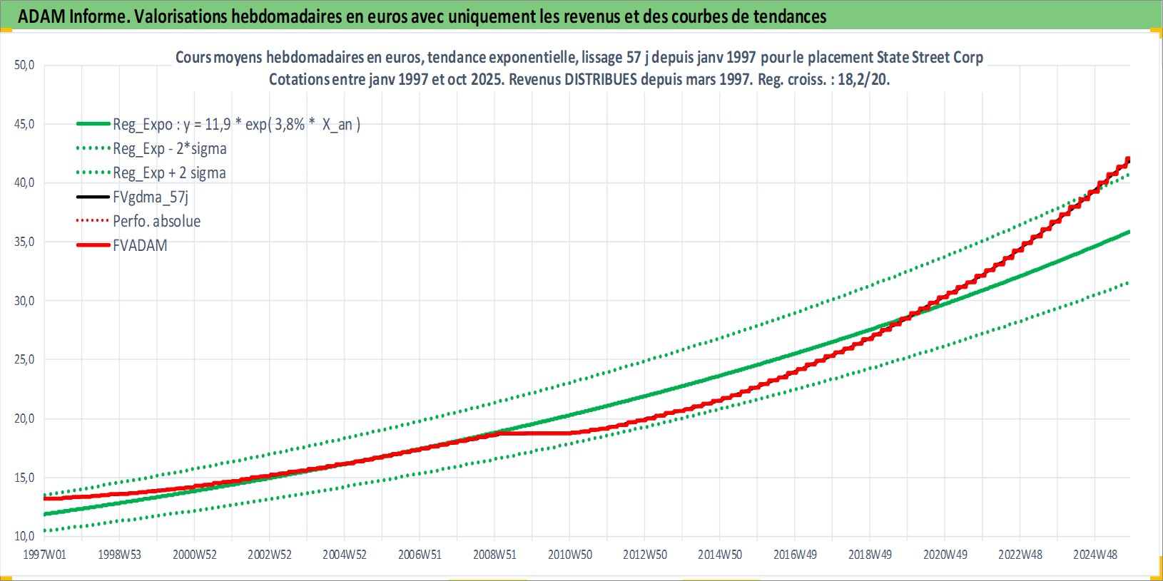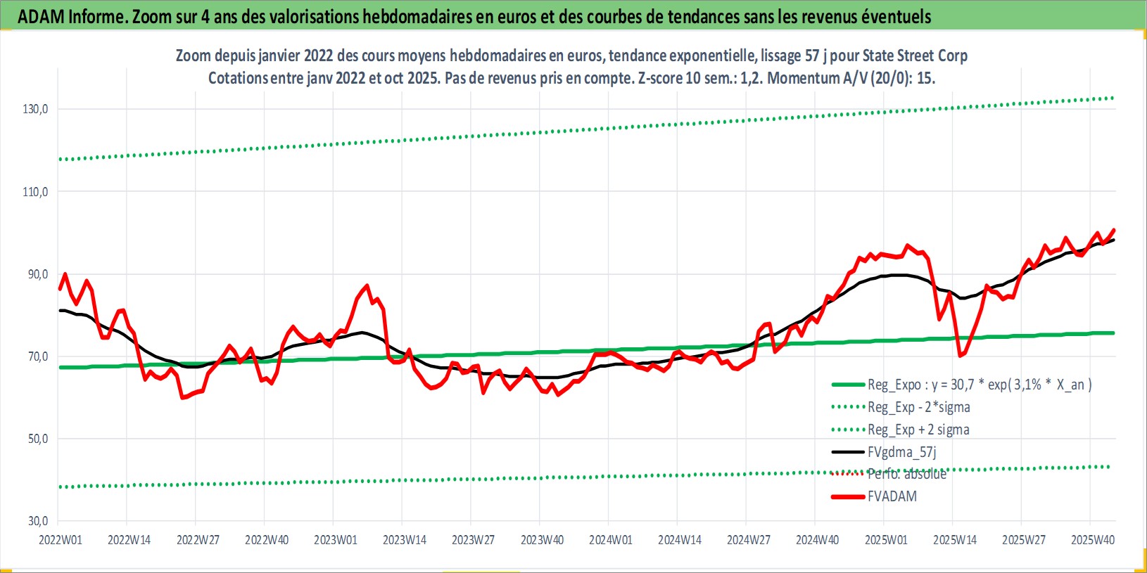 Site dédié aux investisseursPage dédiée sur site financeAnalyse des valorisations hebdomadaires de l'action State Street Corp. Cet actif est cote en USD. Les valorisations sont en contrevaleur EURO et couvrent les semaines 1997W01 a 2025W44. Les revenus de cet actif financier sont pris en compte depuis la semaine 1997W13. La note globale ESG de cet actif est estimee a 9.0 (apres rebasage entre 0 et 20).