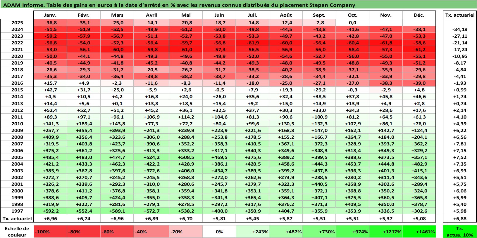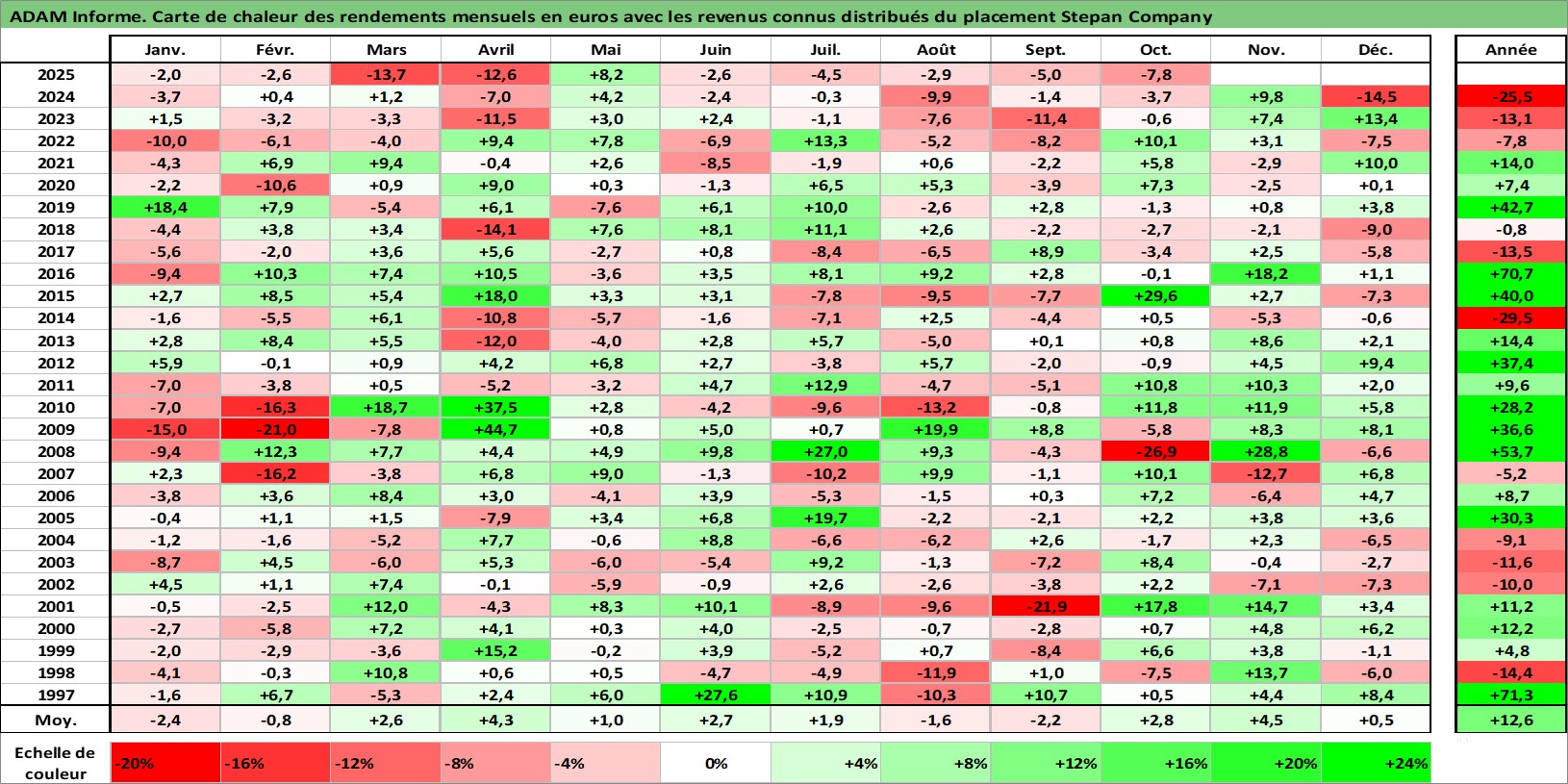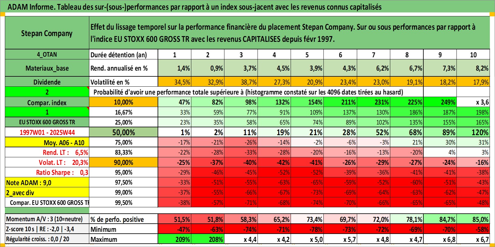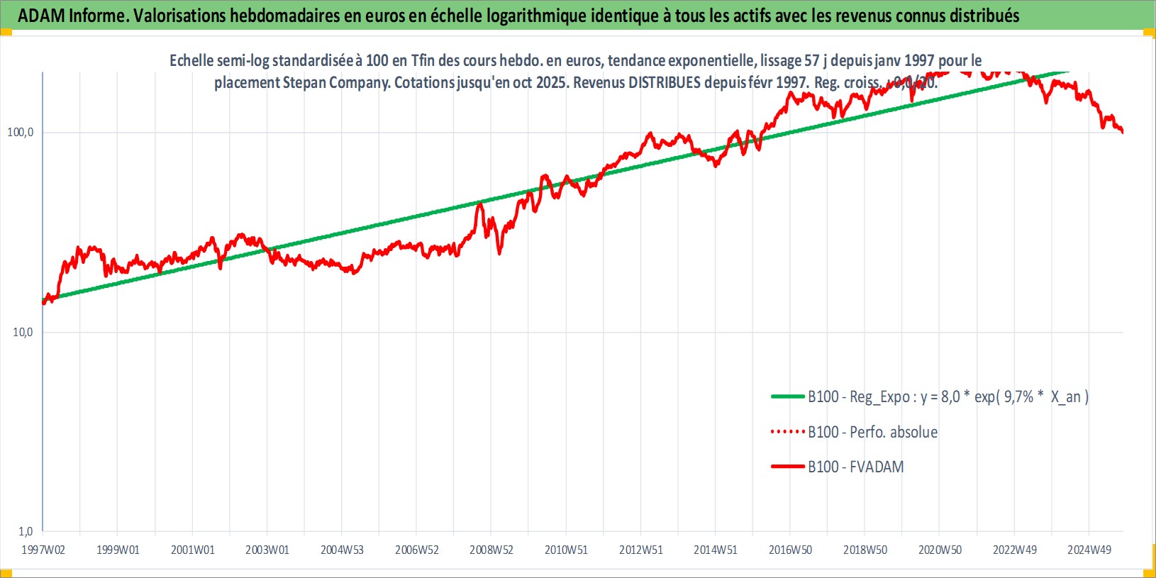 Site dédié aux investisseursPage dédiée sur site financeAnalyse des valorisations hebdomadaires de l'action Stepan Company. Cet actif est cote en USD. Les valorisations sont en contrevaleur EURO et couvrent les semaines 1997W01 a 2025W44. Les revenus de cet actif financier sont pris en compte depuis la semaine 1997W09. La note ESG de cet actif n'est pas connue.