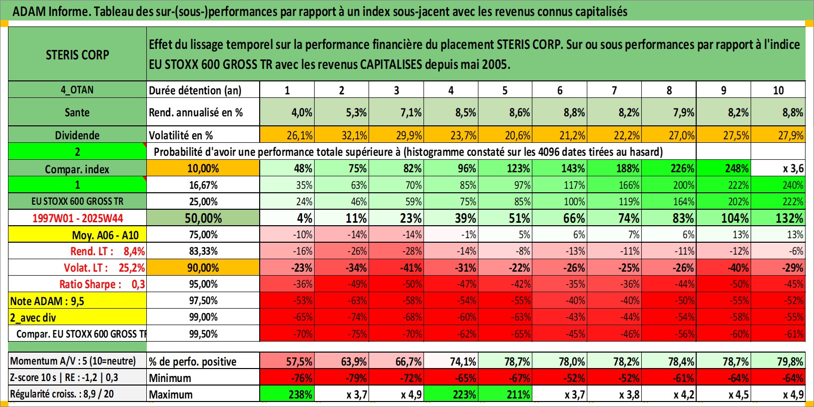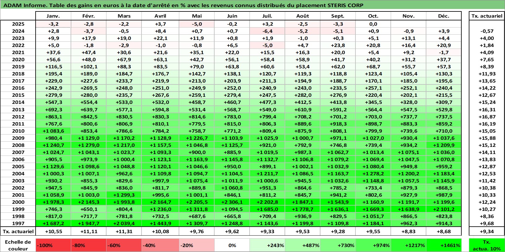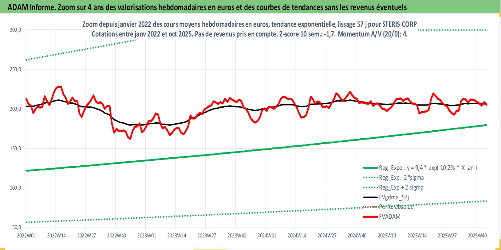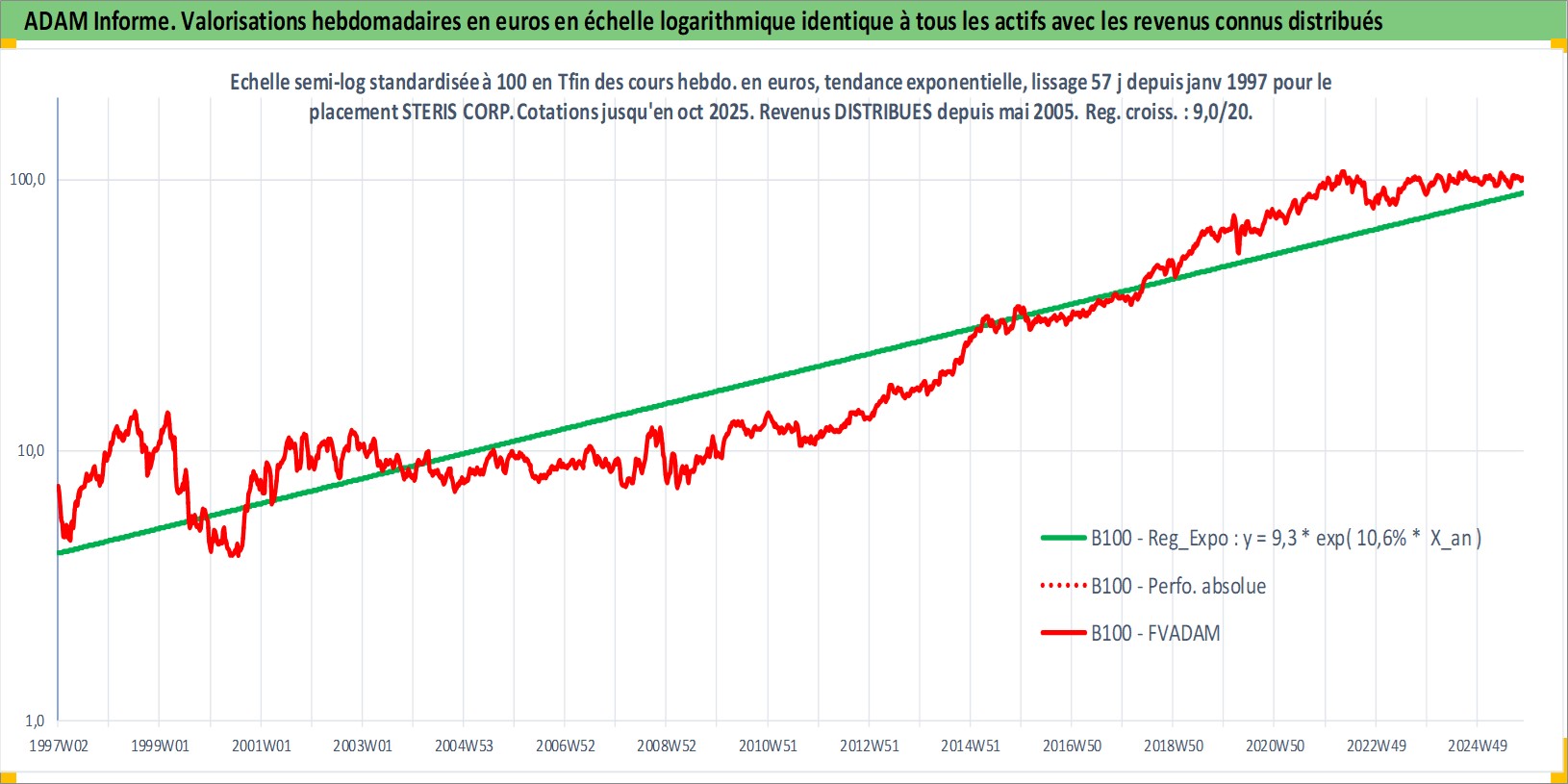 Site dédié aux investisseursPage dédiée sur site financeAnalyse des valorisations hebdomadaires de l'action STERIS CORP. Cet actif est cote en USD. Les valorisations sont en contrevaleur EURO et couvrent les semaines 1997W01 a 2025W44. Les revenus de cet actif financier sont pris en compte depuis la semaine 2005W21. La note ESG de cet actif n'est pas connue.