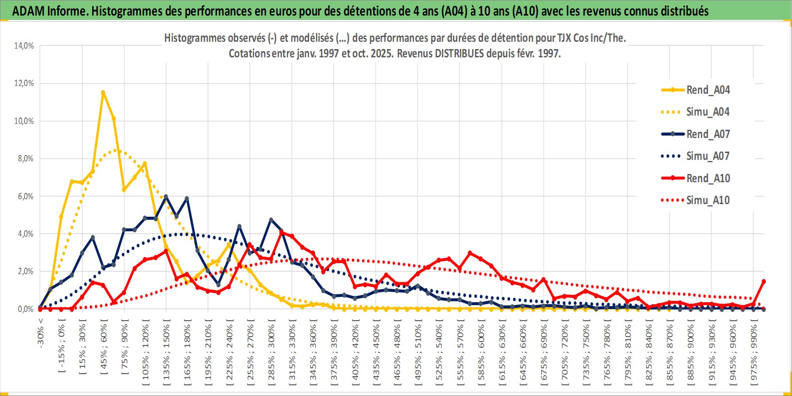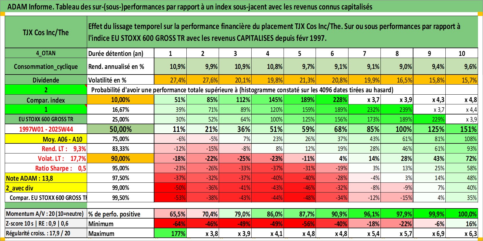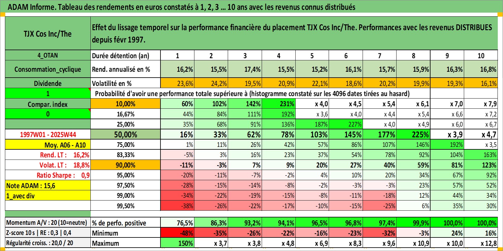 Site dédié aux investisseursPage dédiée sur site financeAnalyse des valorisations hebdomadaires de l'action TJX Cos Inc/The. Cet actif est cote en USD. Les valorisations sont en contrevaleur EURO et couvrent les semaines 1997W01 a 2025W44. Les revenus de cet actif financier sont pris en compte depuis la semaine 1997W06. La note globale ESG de cet actif est estimee a 14.0 (apres rebasage entre 0 et 20).