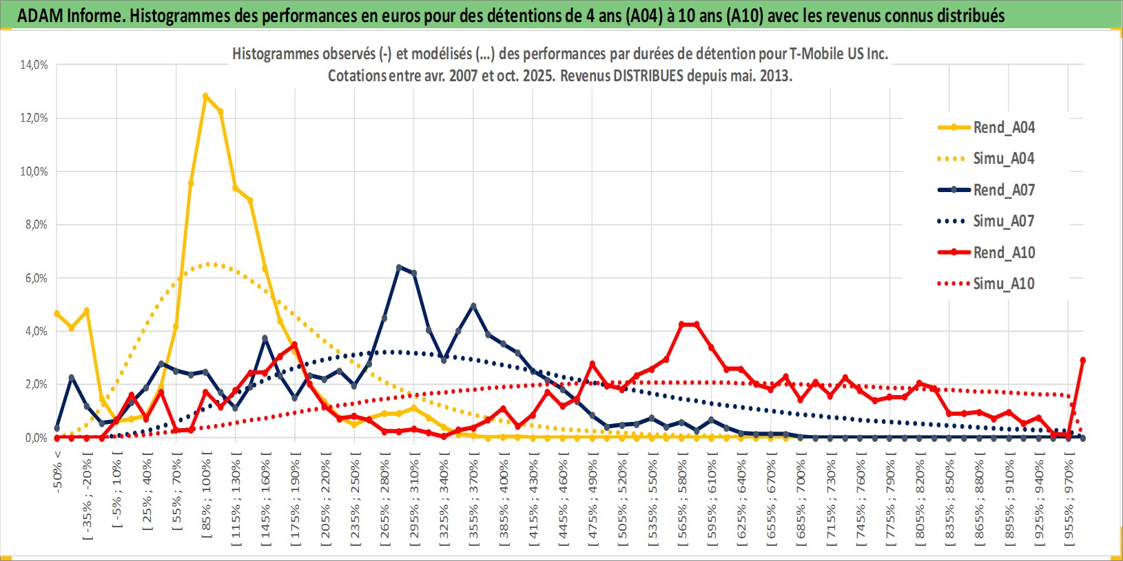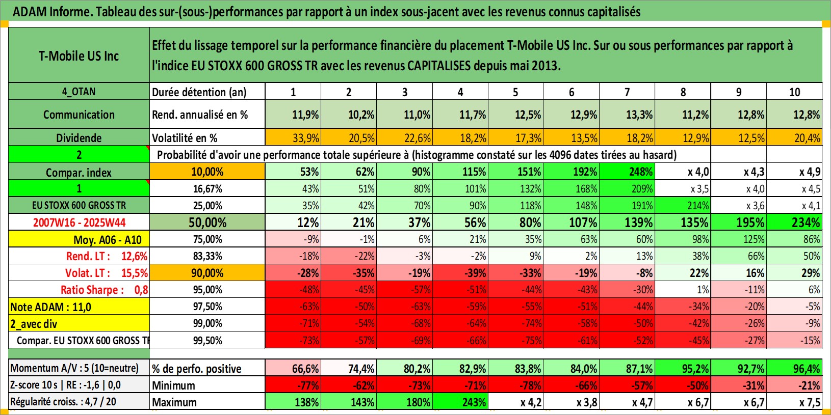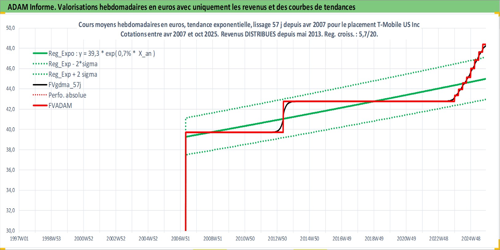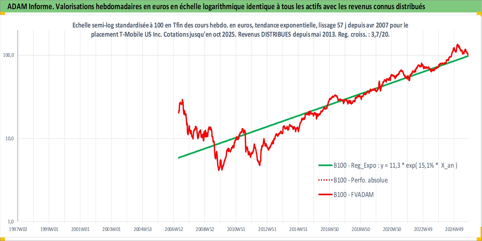Site dédié aux investisseursPage dédiée sur site financeAnalyse des valorisations hebdomadaires de l'action T-Mobile US Inc. Cet actif est cote en USD. Les valorisations sont en contrevaleur EURO et couvrent les semaines 2007W16 a 2025W44. Les revenus de cet actif financier sont pris en compte depuis la semaine 2013W18. La note globale ESG de cet actif est estimee a 7.0 (apres rebasage entre 0 et 20).