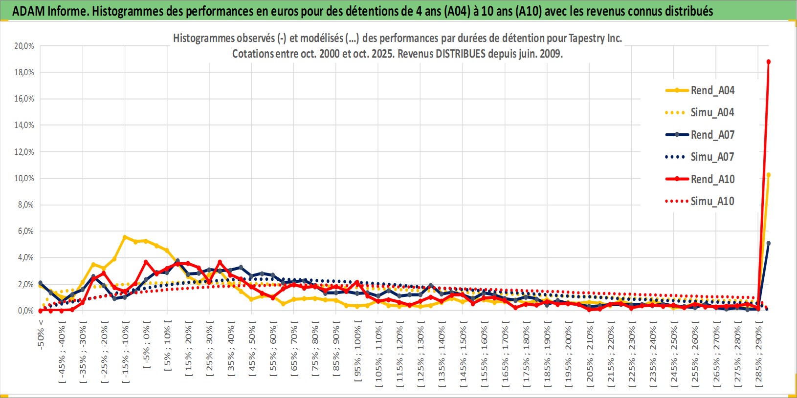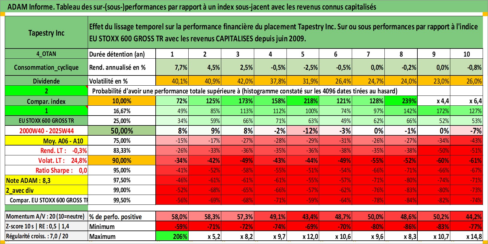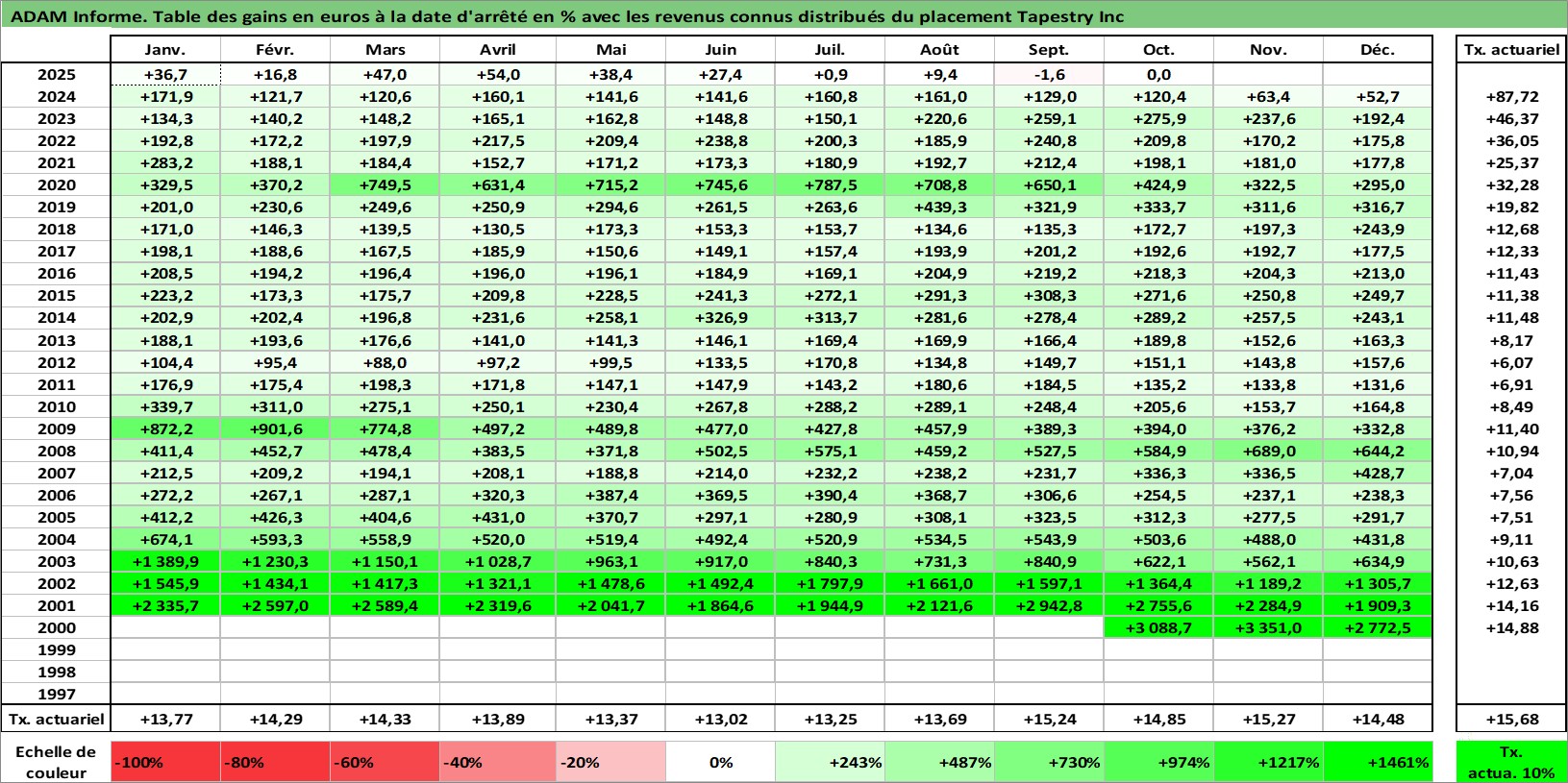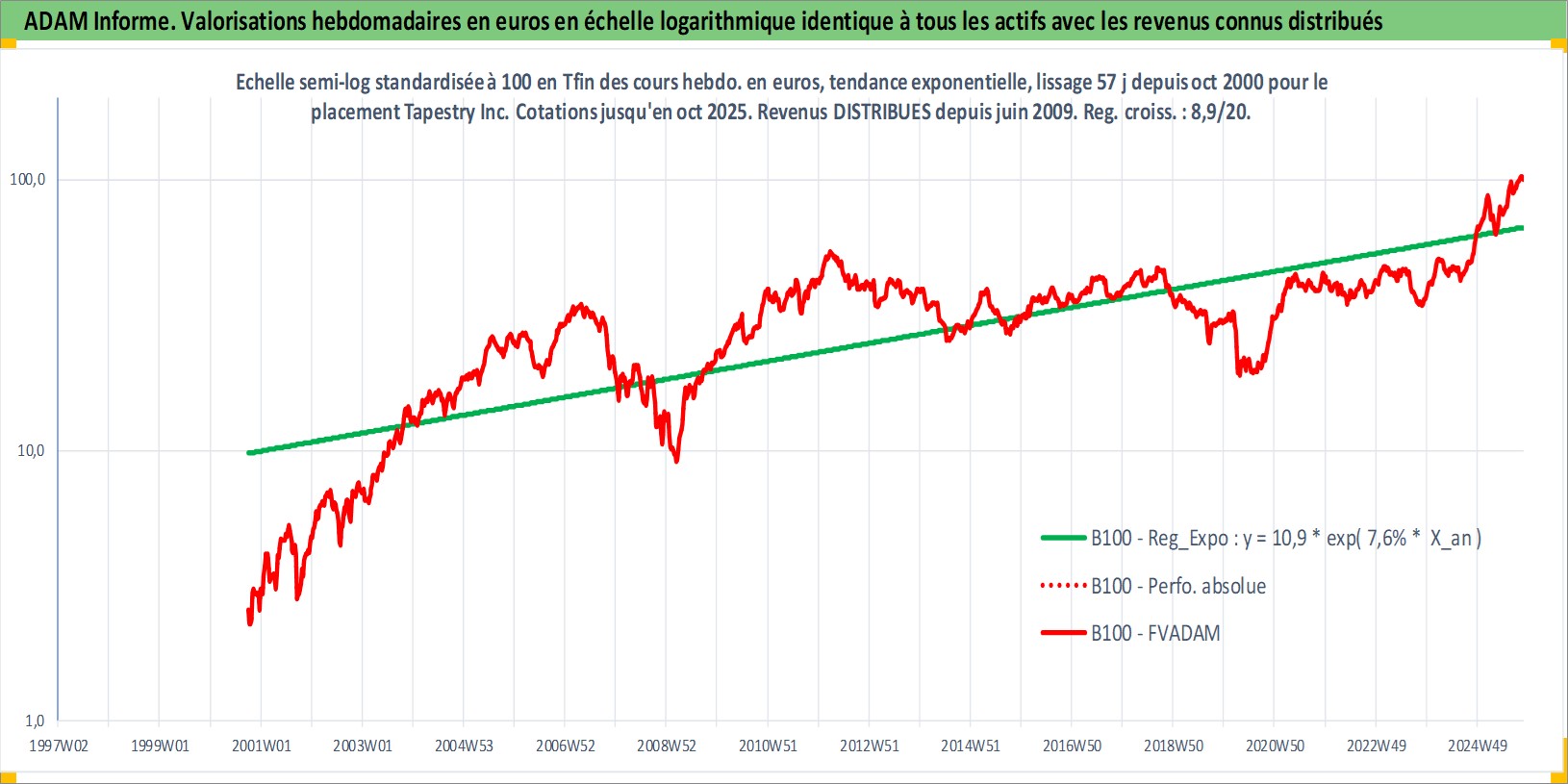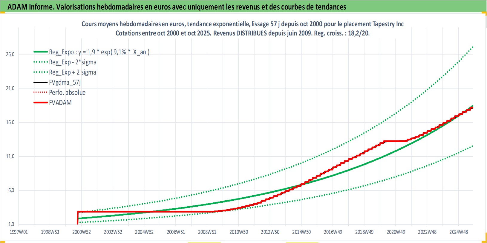 Site dédié aux investisseursPage dédiée sur site financeAnalyse des valorisations hebdomadaires de l'action Tapestry Inc. Cet actif est cote en USD. Les valorisations sont en contrevaleur EURO et couvrent les semaines 2000W40 a 2025W44. Les revenus de cet actif financier sont pris en compte depuis la semaine 2009W23. La note globale ESG de cet actif est estimee a 15.0 (apres rebasage entre 0 et 20).