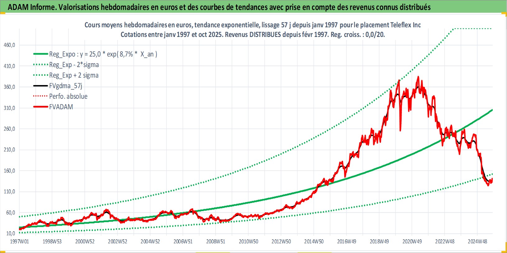 Site dédié aux investisseursPage dédiée sur site financeAnalyse des valorisations hebdomadaires de l'action Teleflex Inc. Cet actif est cote en USD. Les valorisations sont en contrevaleur EURO et couvrent les semaines 1997W01 a 2025W44. Les revenus de cet actif financier sont pris en compte depuis la semaine 1997W08. La note globale ESG de cet actif est estimee a 5.0 (apres rebasage entre 0 et 20).