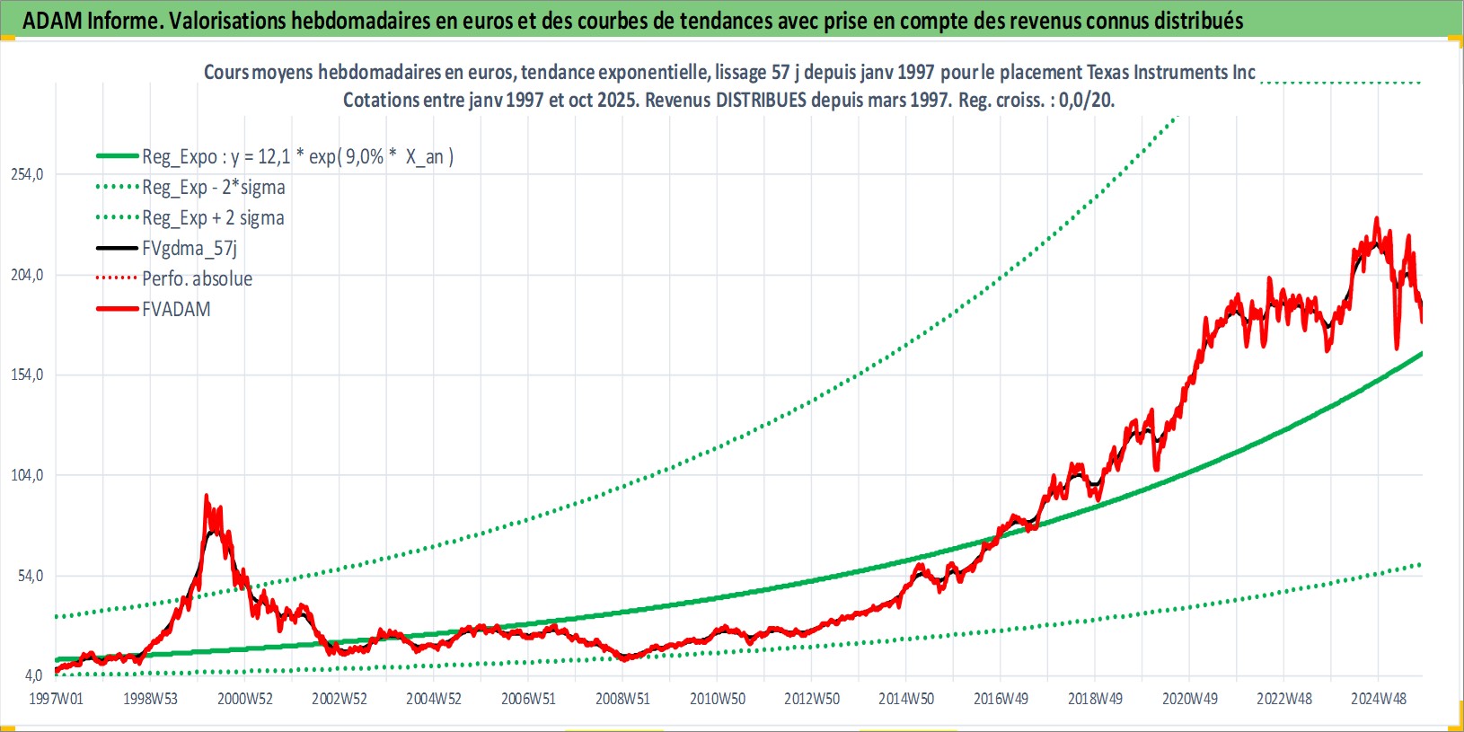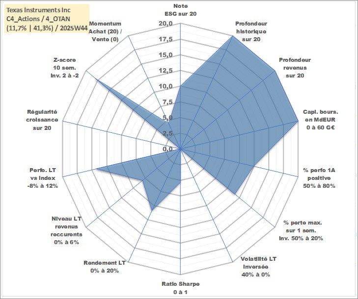 Site dédié aux investisseursPage dédiée sur site financeAnalyse des valorisations hebdomadaires de l'action Texas Instruments Inc. Cet actif est cote en USD. Les valorisations sont en contrevaleur EURO et couvrent les semaines 1997W01 a 2025W44. Les revenus de cet actif financier sont pris en compte depuis la semaine 1997W13. La note globale ESG de cet actif est estimee a 10.0 (apres rebasage entre 0 et 20).