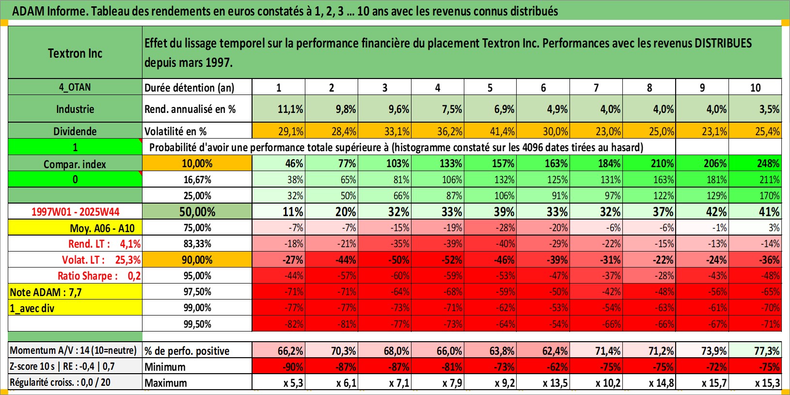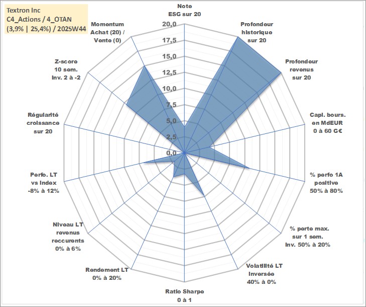 Site dédié aux investisseursPage dédiée sur site financeAnalyse des valorisations hebdomadaires de l'action Textron Inc. Cet actif est cote en USD. Les valorisations sont en contrevaleur EURO et couvrent les semaines 1997W01 a 2025W44. Les revenus de cet actif financier sont pris en compte depuis la semaine 1997W11. La note globale ESG de cet actif est estimee a 4.0 (apres rebasage entre 0 et 20).