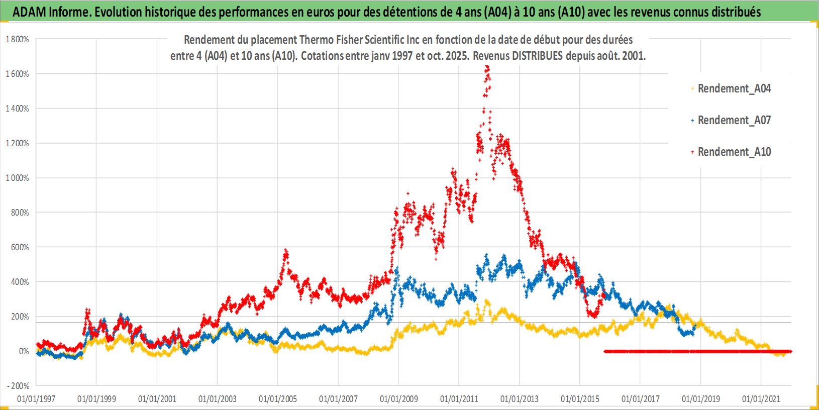 Site dédié aux investisseursPage dédiée sur site financeAnalyse des valorisations hebdomadaires de l'action Thermo Fisher Scientific Inc. Cet actif est cote en USD. Les valorisations sont en contrevaleur EURO et couvrent les semaines 1997W01 a 2025W44. Les revenus de cet actif financier sont pris en compte depuis la semaine 2001W32. La note globale ESG de cet actif est estimee a 14.0 (apres rebasage entre 0 et 20).
