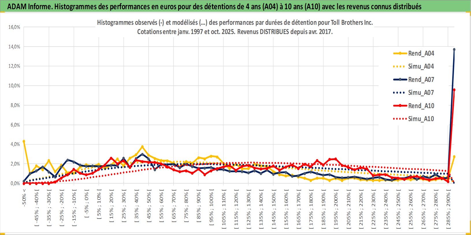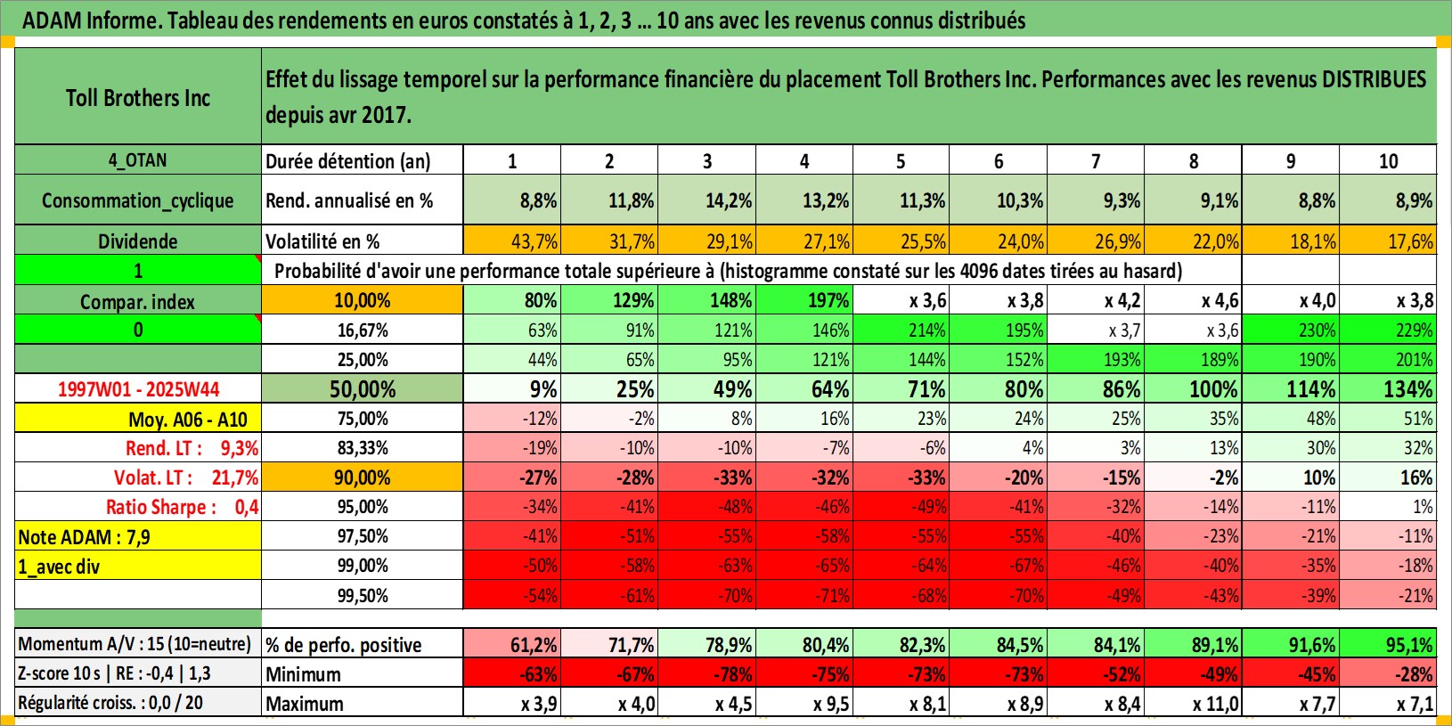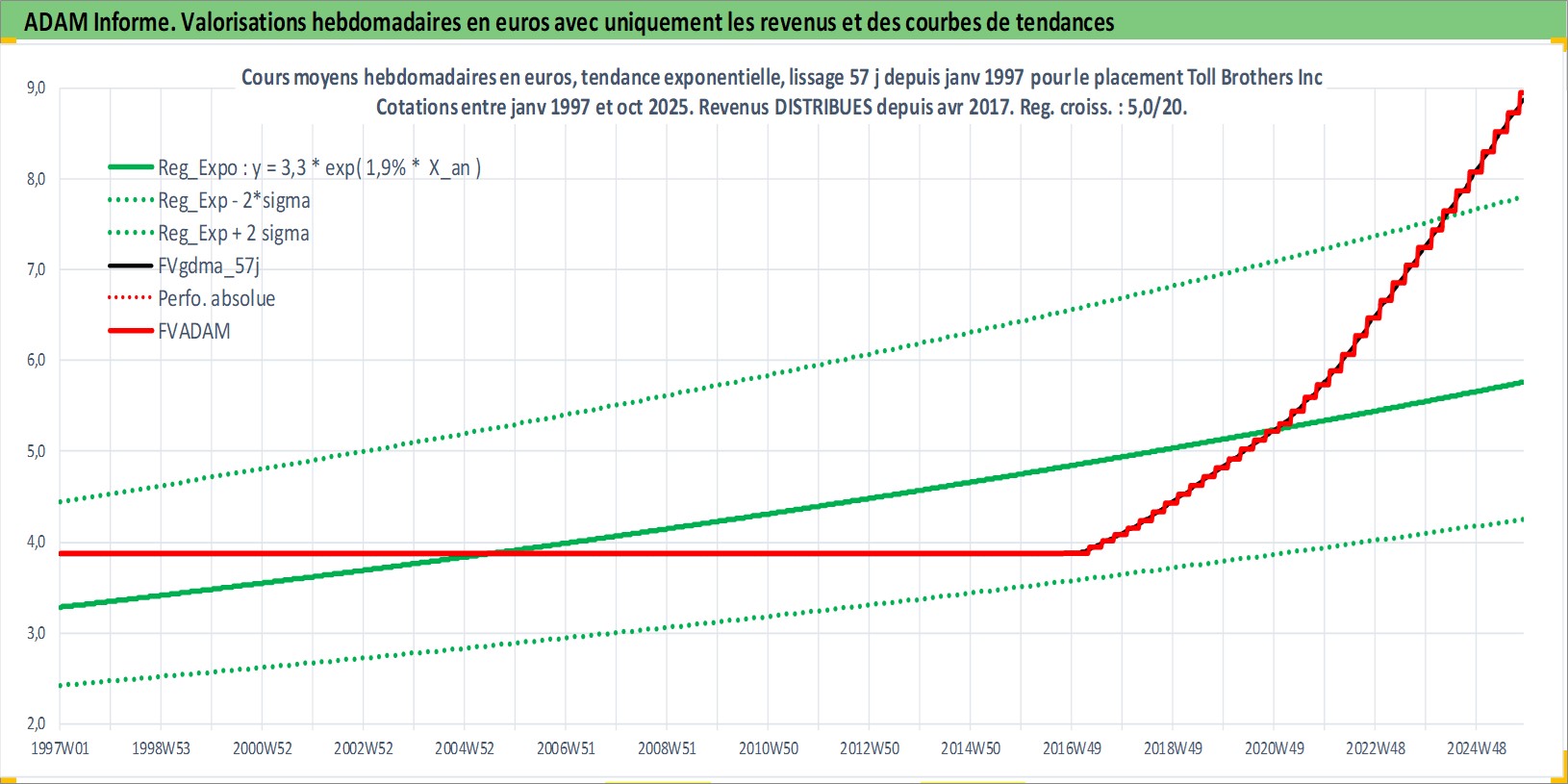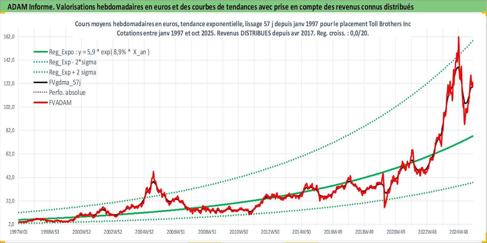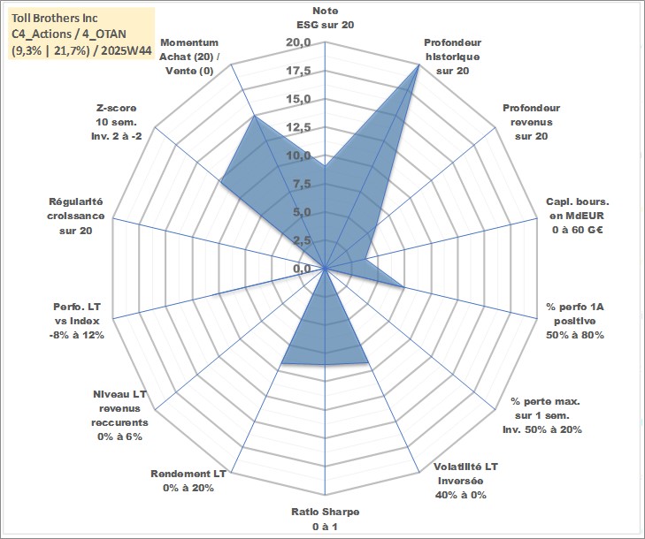 Site dédié aux investisseursPage dédiée sur site financeAnalyse des valorisations hebdomadaires de l'action Toll Brothers Inc. Cet actif est cote en USD. Les valorisations sont en contrevaleur EURO et couvrent les semaines 1997W01 a 2025W44. Les revenus de cet actif financier sont pris en compte depuis la semaine 2017W15. La note globale ESG de cet actif est estimee a 9.0 (apres rebasage entre 0 et 20).