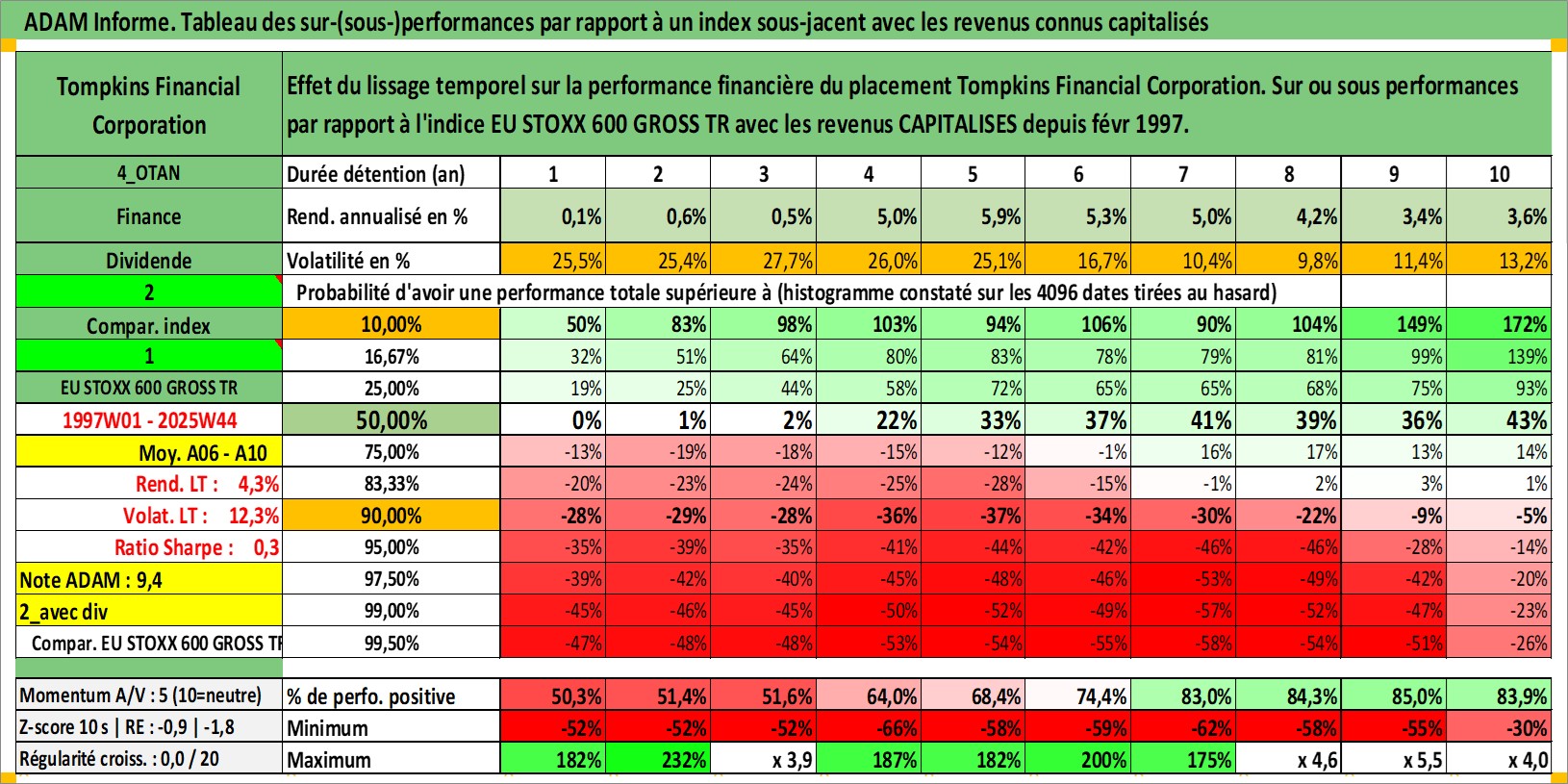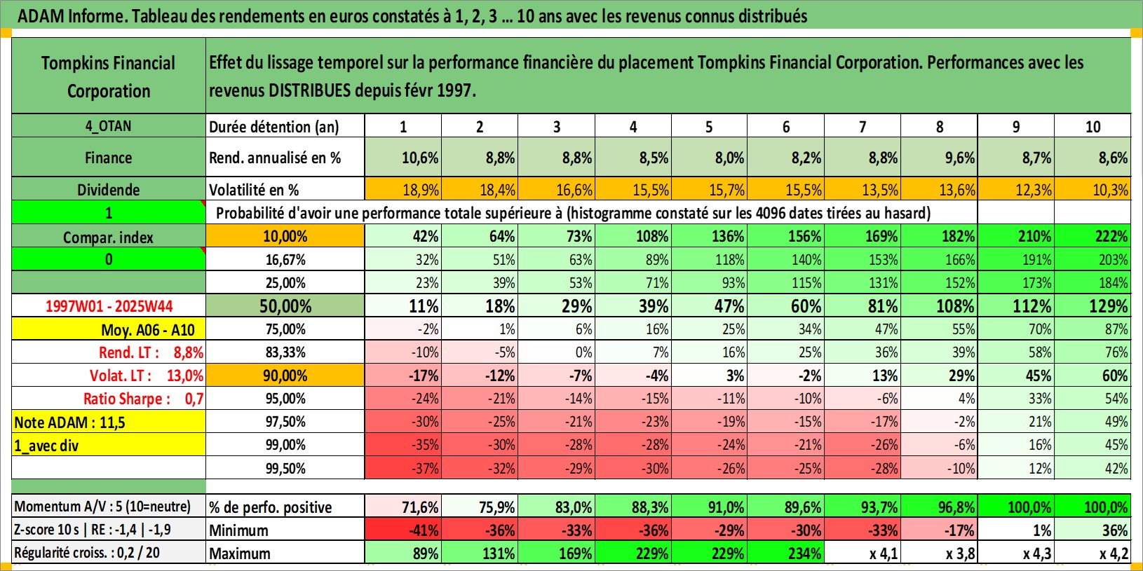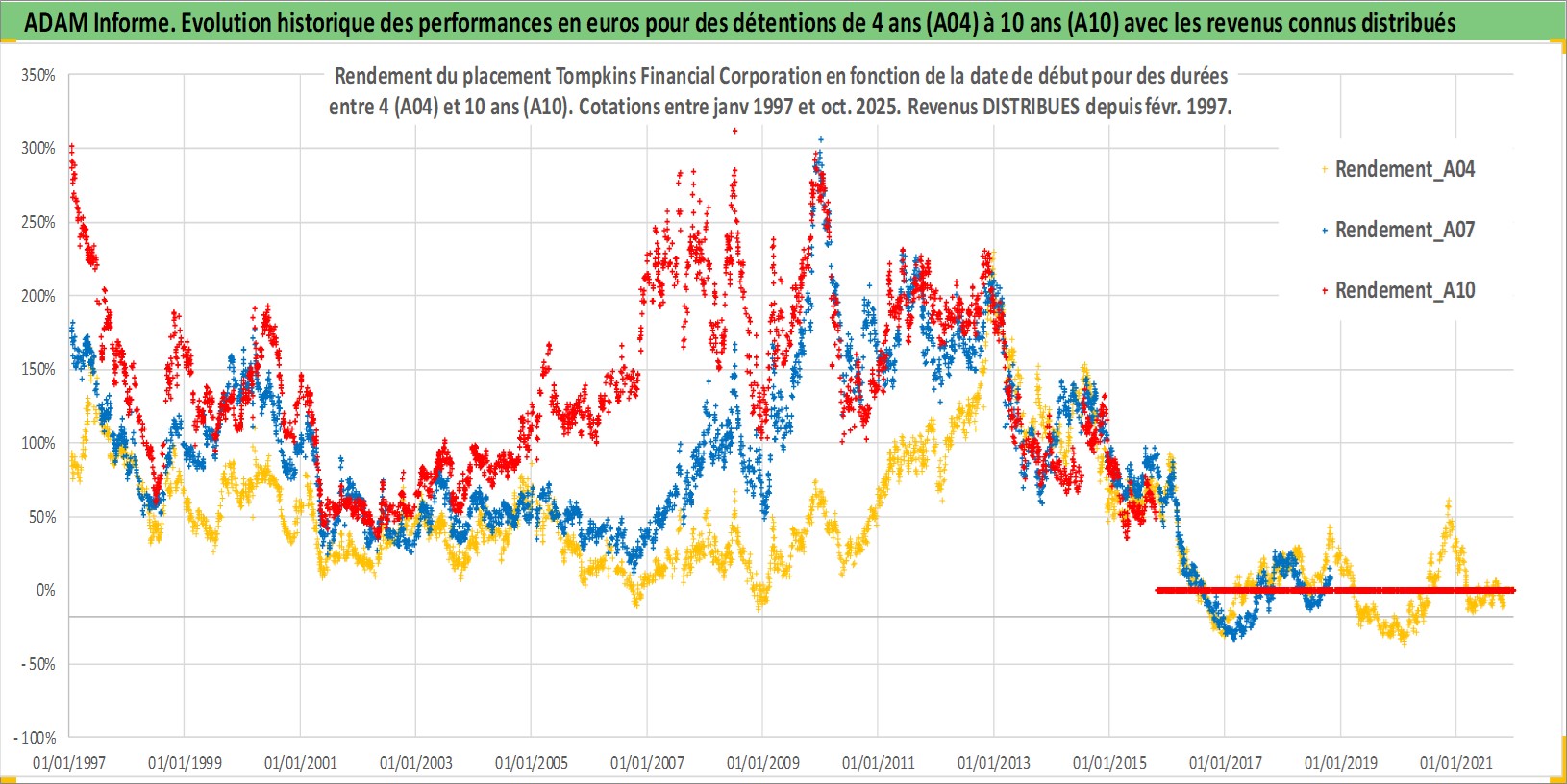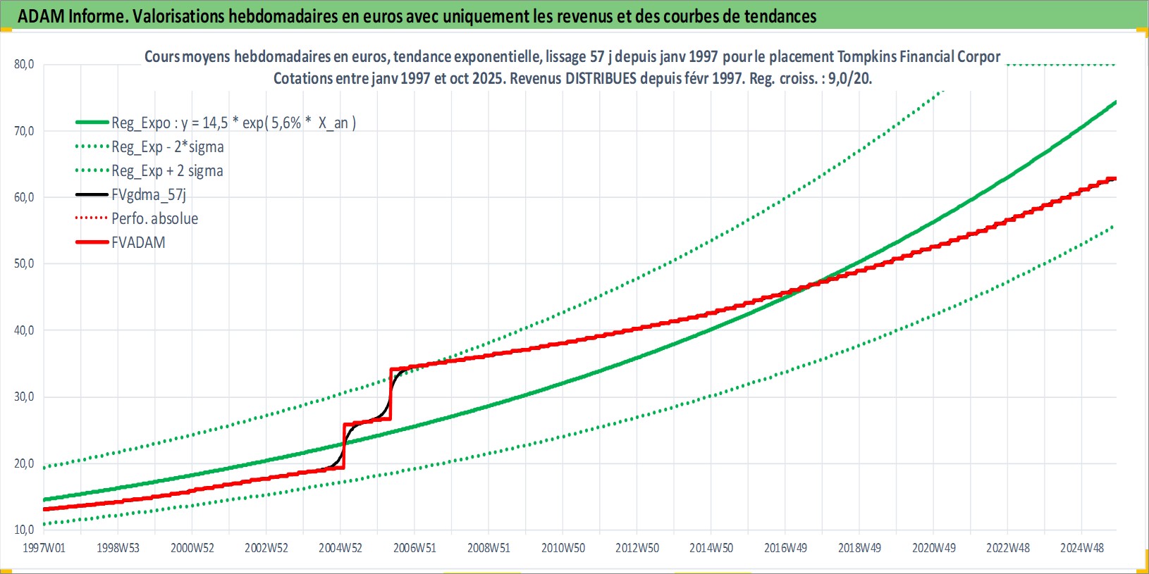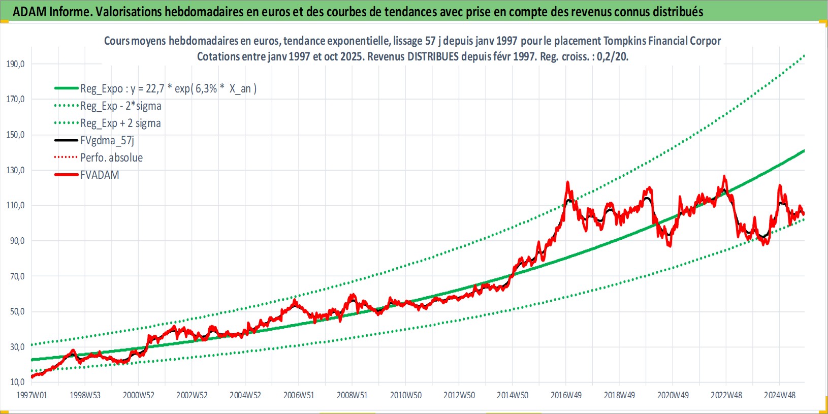 Site dédié aux investisseursPage dédiée sur site financeAnalyse des valorisations hebdomadaires de l'action Tompkins Financial Corporation. Cet actif est cote en USD. Les valorisations sont en contrevaleur EURO et couvrent les semaines 1997W01 a 2025W44. Les revenus de cet actif financier sont pris en compte depuis la semaine 1997W09. La note ESG de cet actif n'est pas connue.
