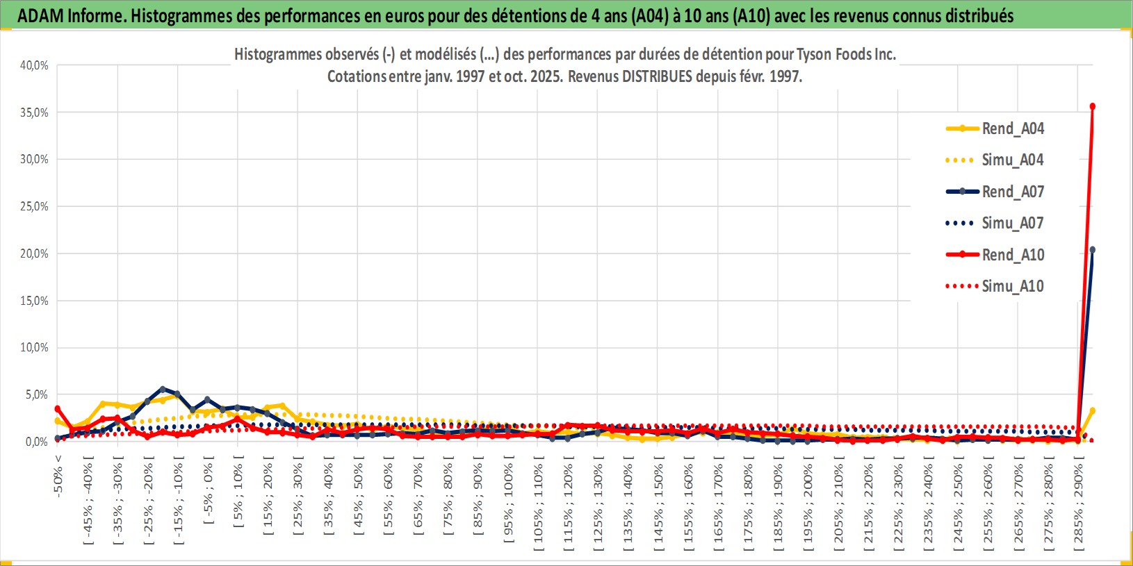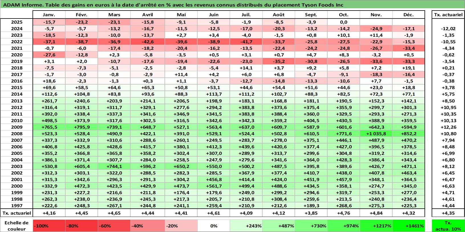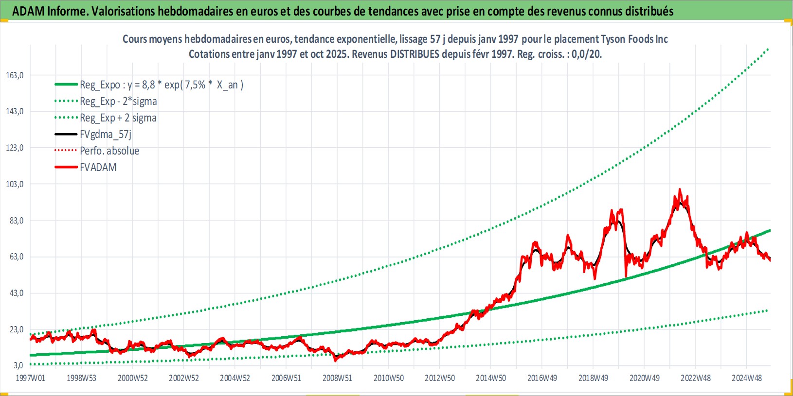 Site dédié aux investisseursPage dédiée sur site financeAnalyse des valorisations hebdomadaires de l'action Tyson Foods Inc. Cet actif est cote en USD. Les valorisations sont en contrevaleur EURO et couvrent les semaines 1997W01 a 2025W44. Les revenus de cet actif financier sont pris en compte depuis la semaine 1997W09. La note globale ESG de cet actif est estimee a 3.0 (apres rebasage entre 0 et 20).