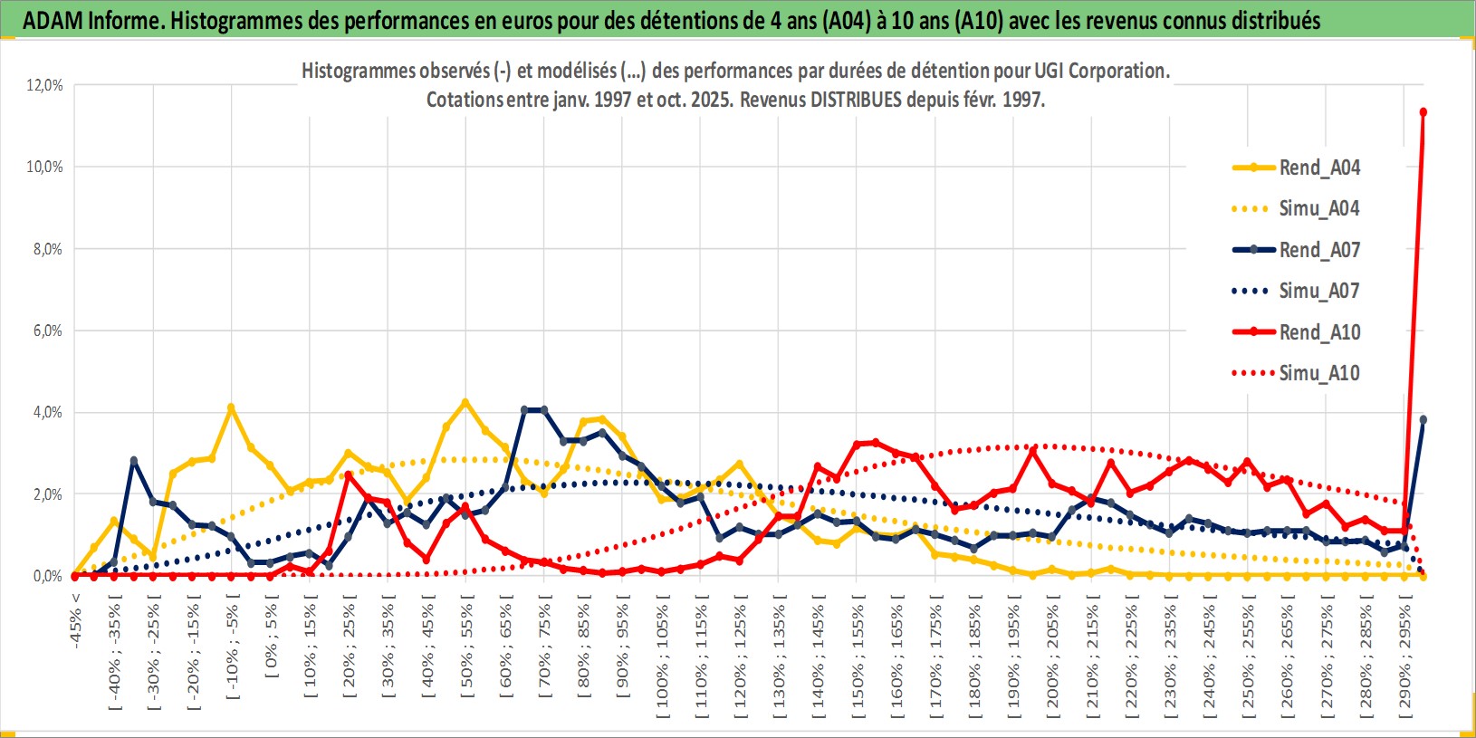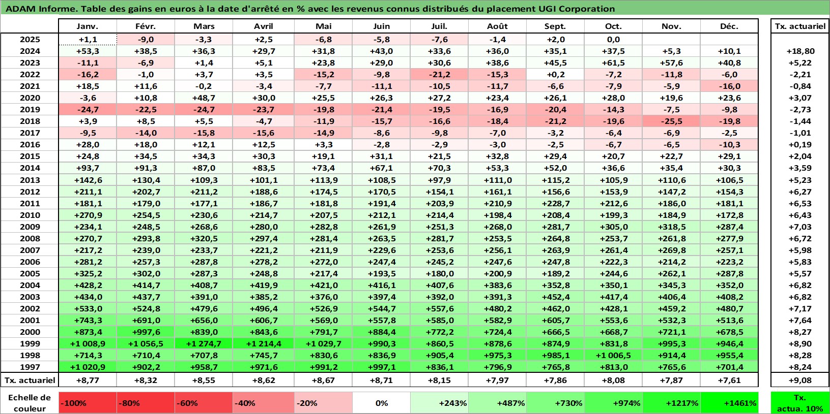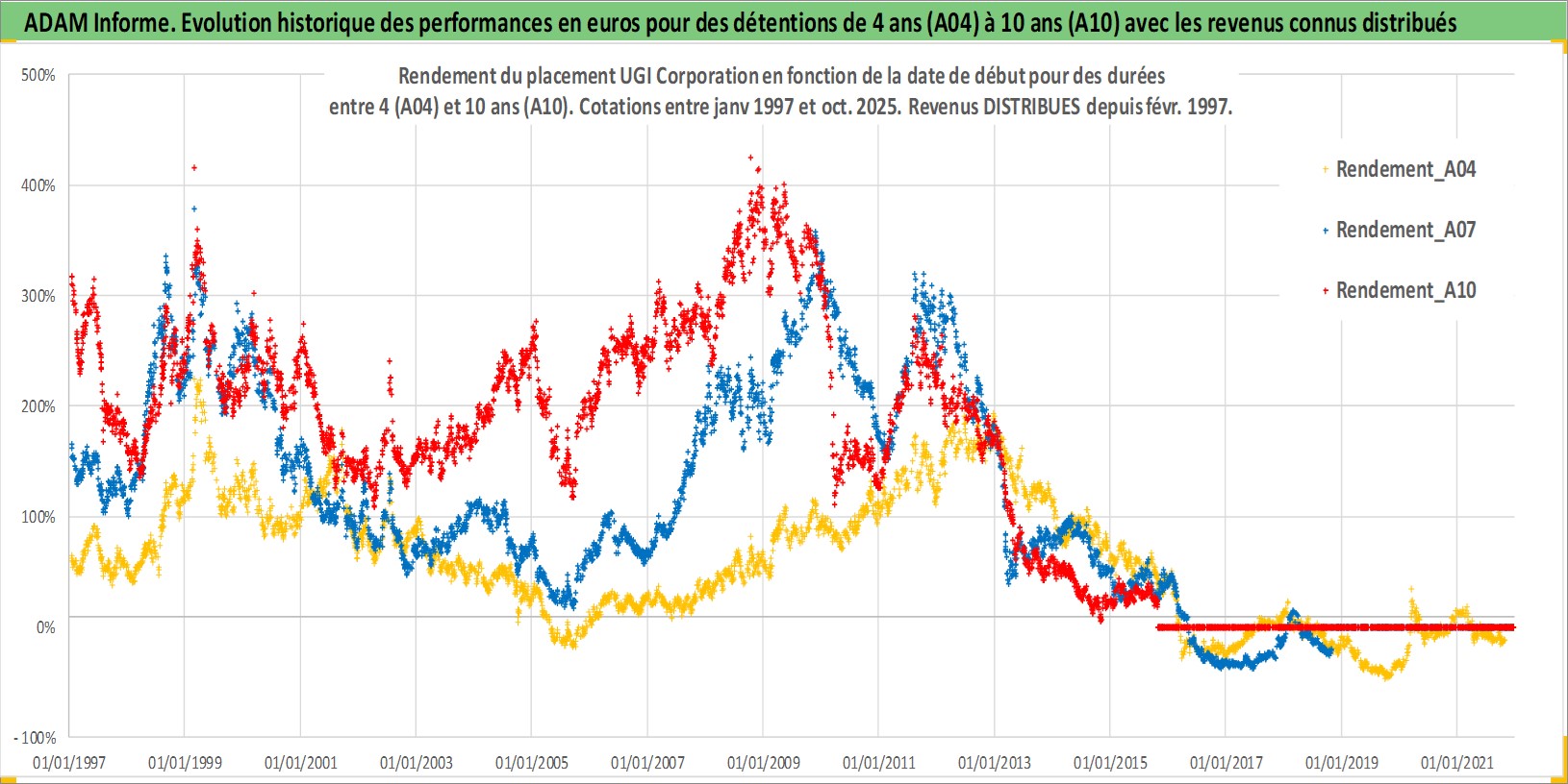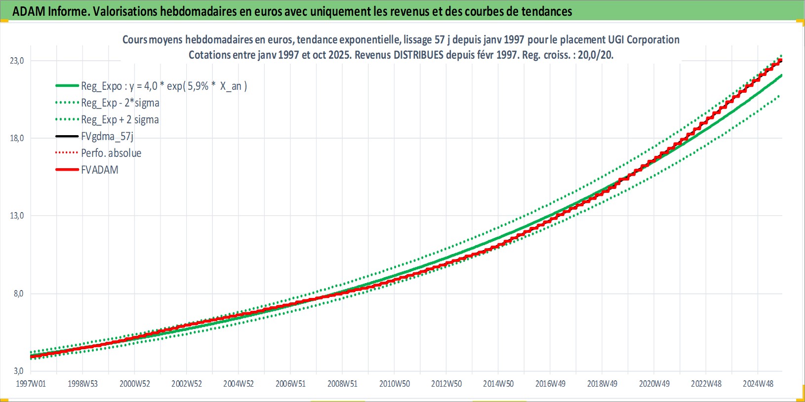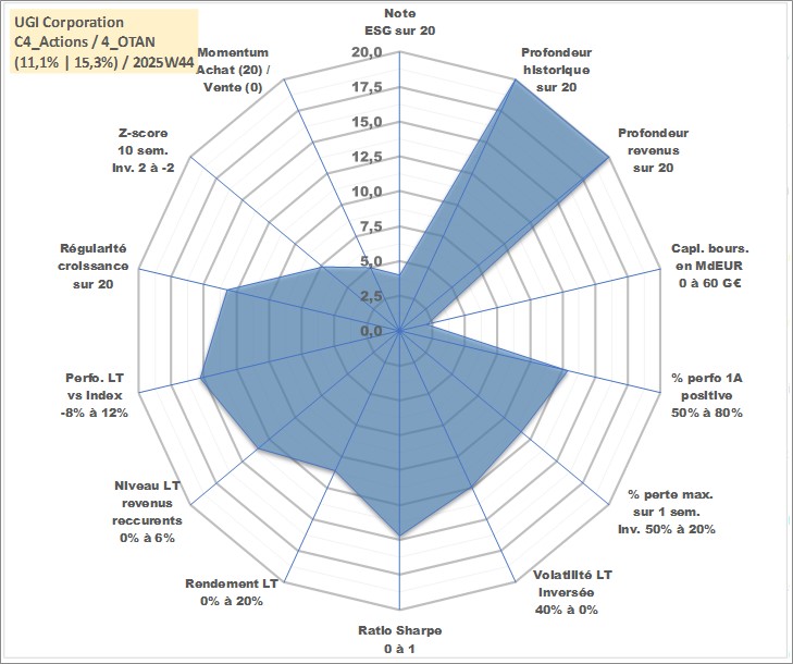 Site dédié aux investisseursPage dédiée sur site financeAnalyse des valorisations hebdomadaires de l'action UGI Corporation. Cet actif est cote en USD. Les valorisations sont en contrevaleur EURO et couvrent les semaines 1997W01 a 2025W44. Les revenus de cet actif financier sont pris en compte depuis la semaine 1997W09. La note globale ESG de cet actif est estimee a 4.0 (apres rebasage entre 0 et 20).