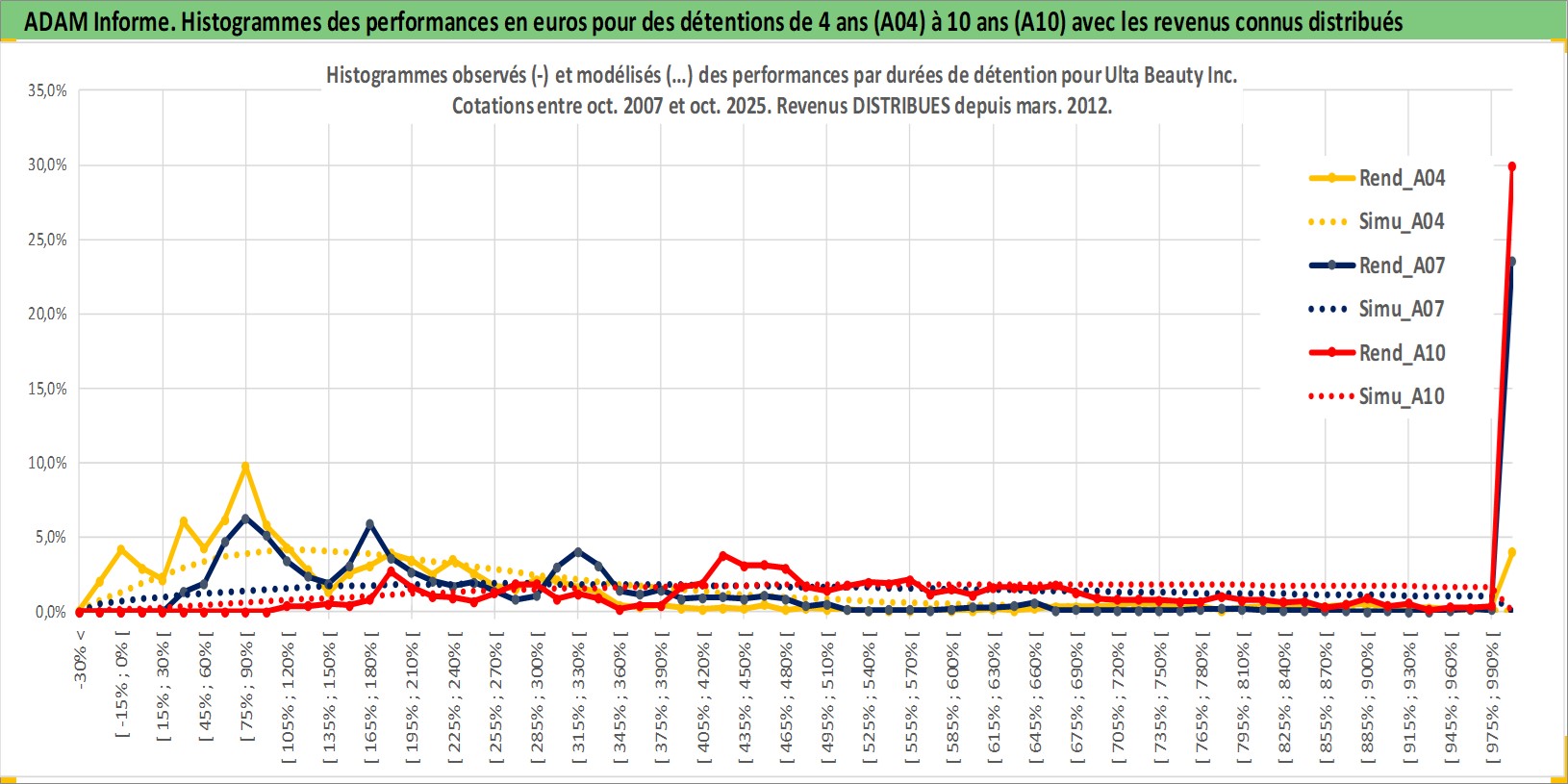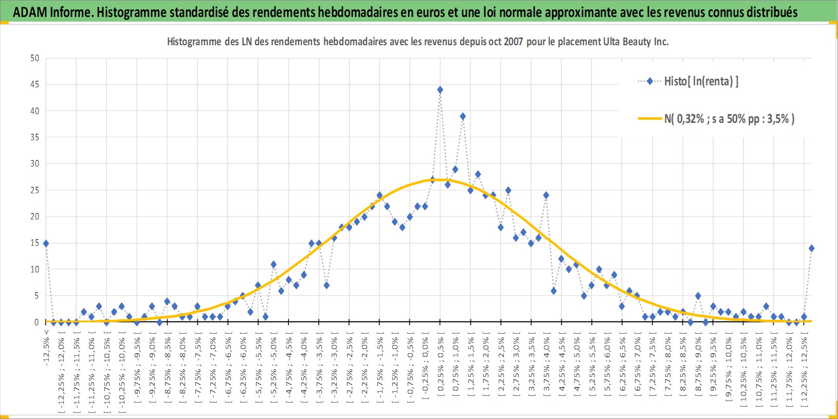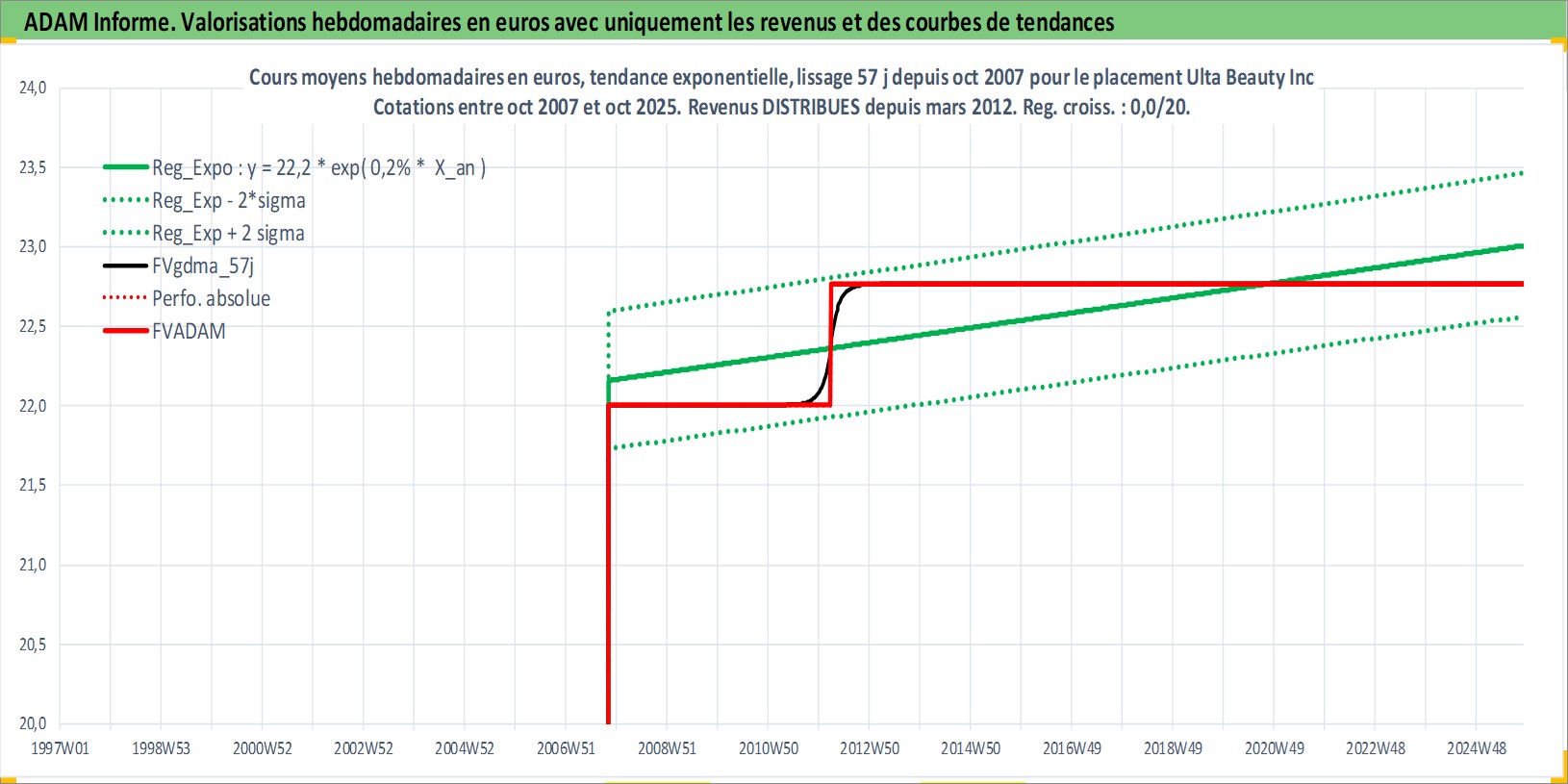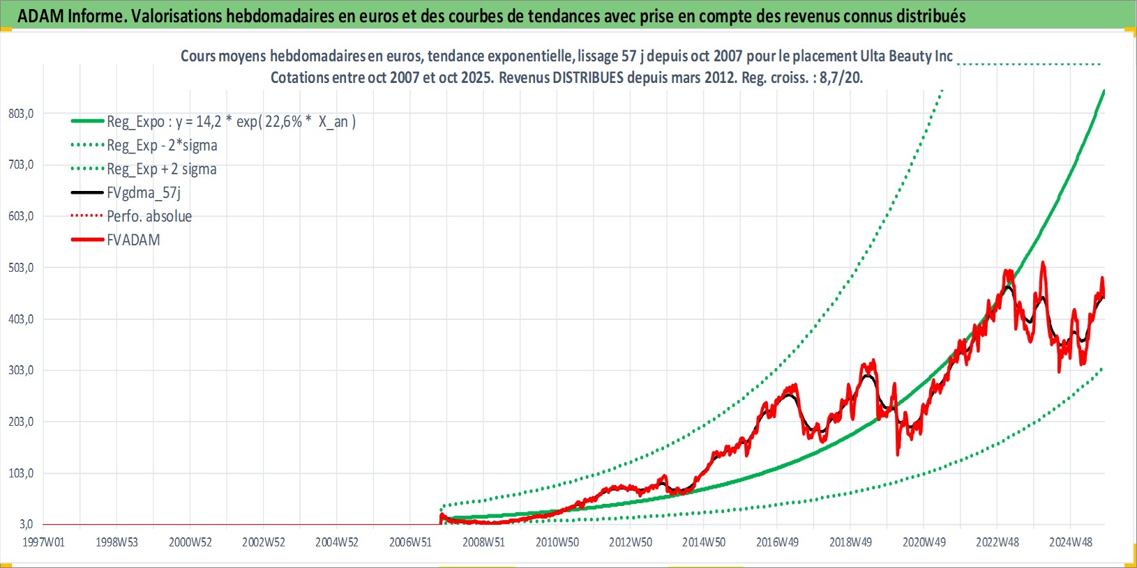 Site dédié aux investisseursPage dédiée sur site financeAnalyse des valorisations hebdomadaires de l'action Ulta Beauty Inc. Cet actif est cote en USD. Les valorisations sont en contrevaleur EURO et couvrent les semaines 2007W43 a 2025W44. Les revenus de cet actif financier sont pris en compte depuis la semaine 2012W11. La note globale ESG de cet actif est estimee a 13.0 (apres rebasage entre 0 et 20).