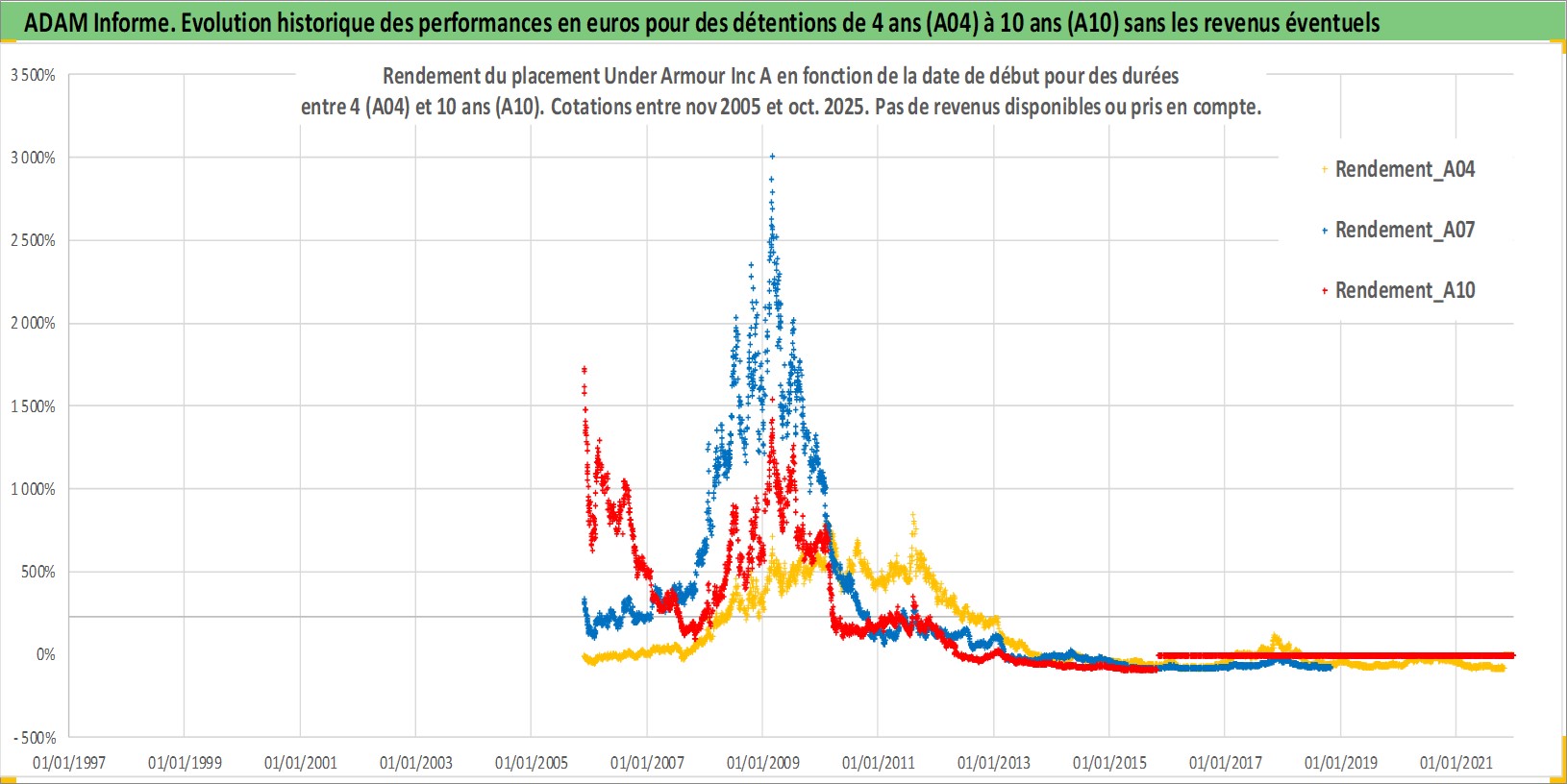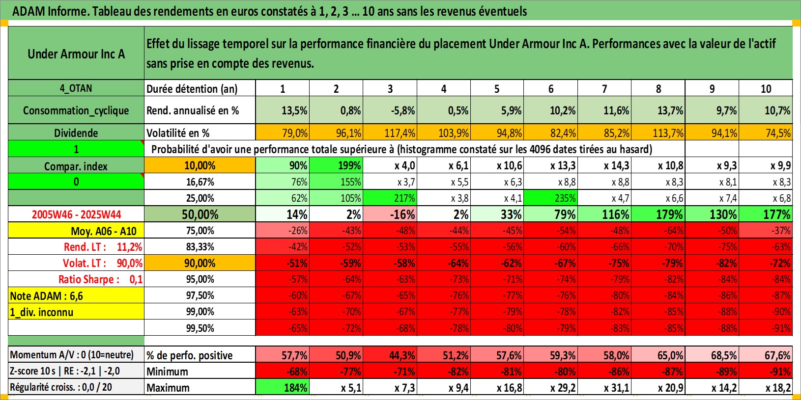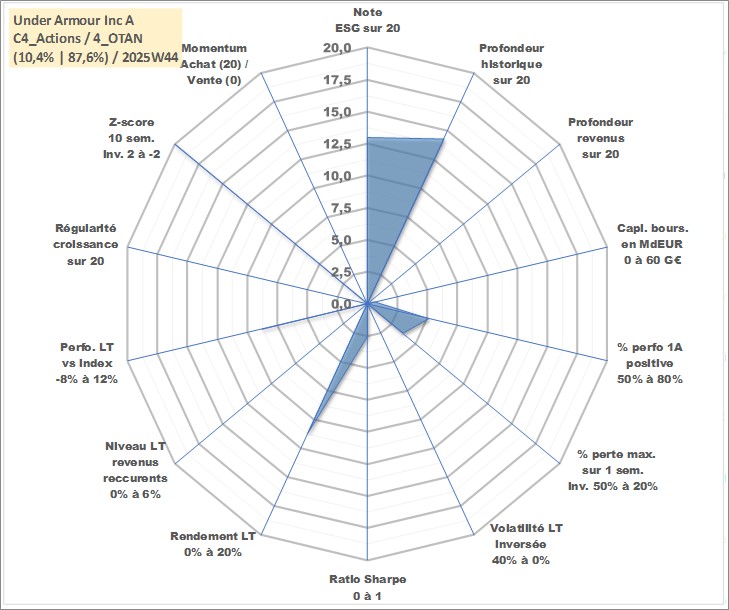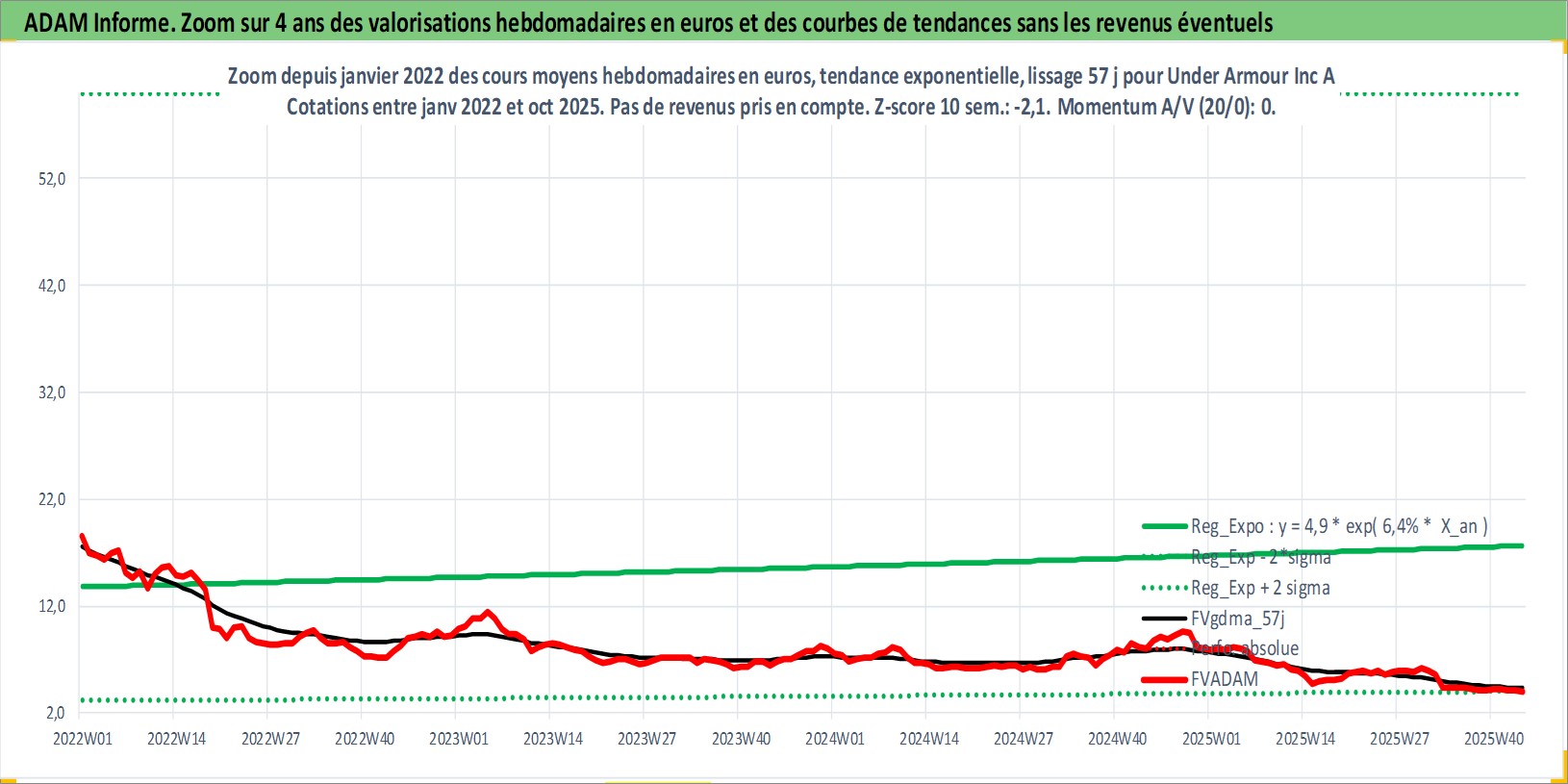 Site dédié aux investisseursPage dédiée sur site financeAnalyse des valorisations hebdomadaires de l'action Under Armour Inc A. Cet actif est cote en USD. Les valorisations sont en contrevaleur EURO et couvrent les semaines 2005W46 a 2025W44. Les revenus de cet actif financier ne sont pas connus car non existants ou non disponibles sur le site Yahoo Finance. La note globale ESG de cet actif est estimee a 13.0 (apres rebasage entre 0 et 20).