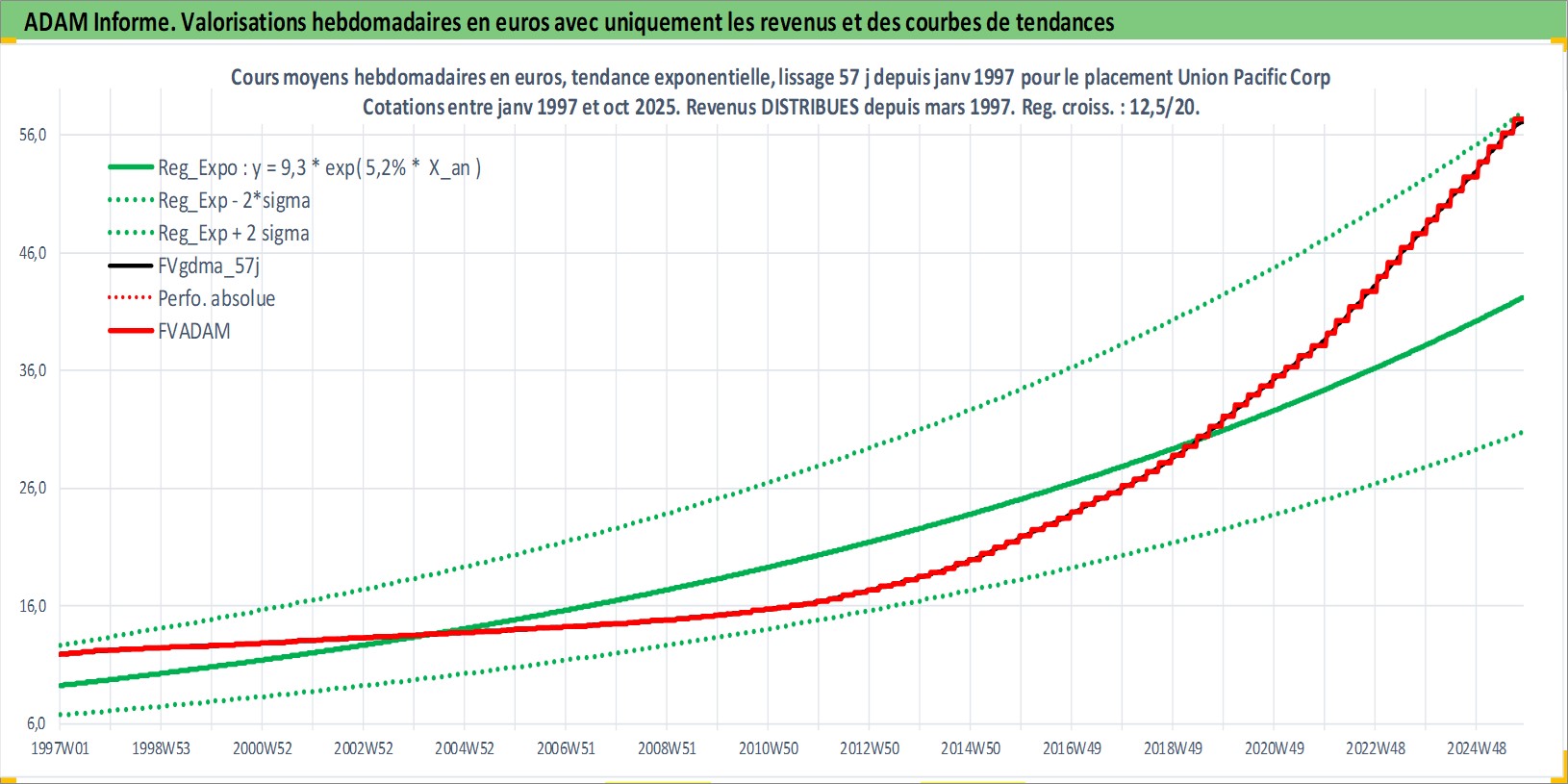 Site dédié aux investisseursPage dédiée sur site financeAnalyse des valorisations hebdomadaires de l'action Union Pacific Corp. Cet actif est cote en USD. Les valorisations sont en contrevaleur EURO et couvrent les semaines 1997W01 a 2025W44. Les revenus de cet actif financier sont pris en compte depuis la semaine 1997W11. La note globale ESG de cet actif est estimee a 7.0 (apres rebasage entre 0 et 20).