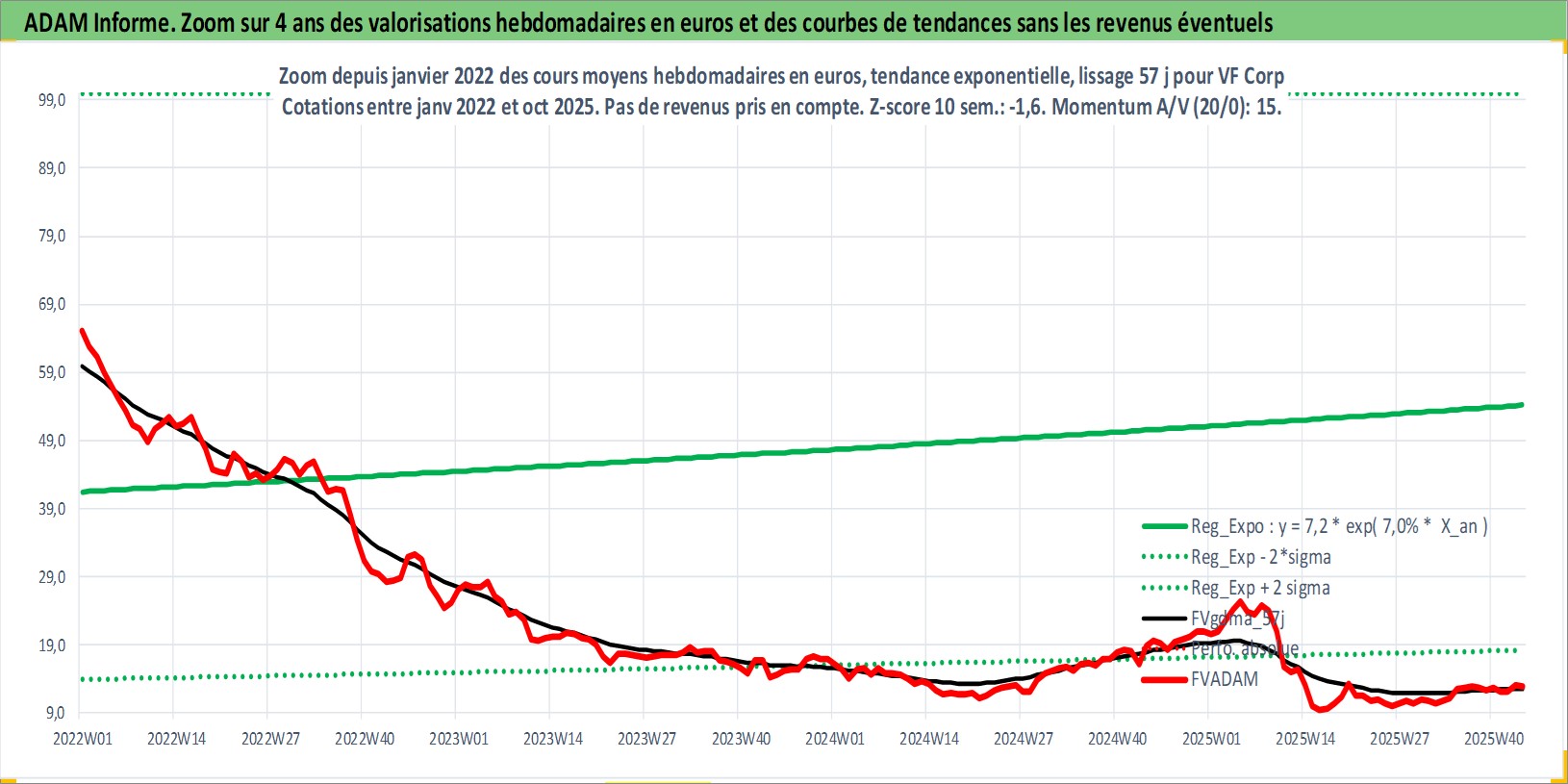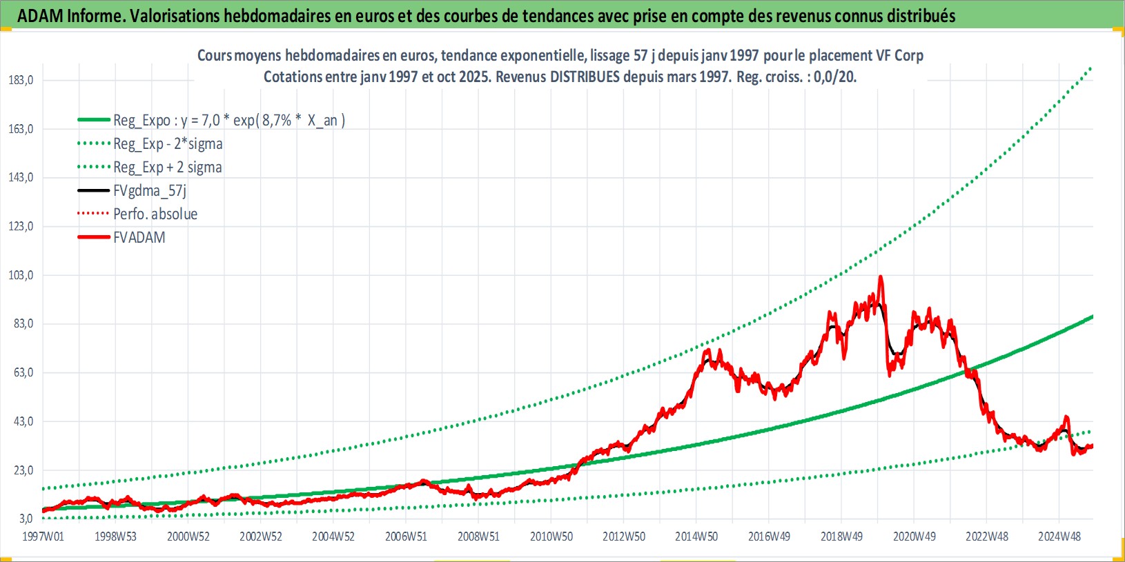 Site dédié aux investisseursPage dédiée sur site financeAnalyse des valorisations hebdomadaires de l'action VF Corp. Cet actif est cote en USD. Les valorisations sont en contrevaleur EURO et couvrent les semaines 1997W01 a 2025W44. Les revenus de cet actif financier sont pris en compte depuis la semaine 1997W10. La note globale ESG de cet actif est estimee a 15.0 (apres rebasage entre 0 et 20).