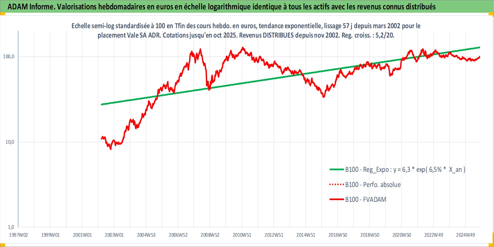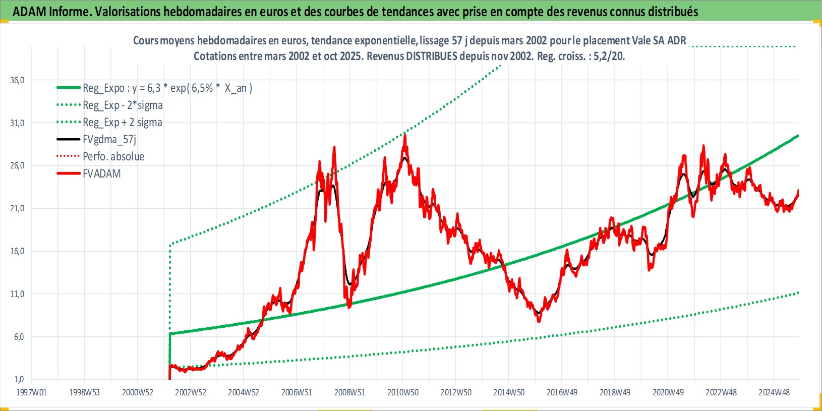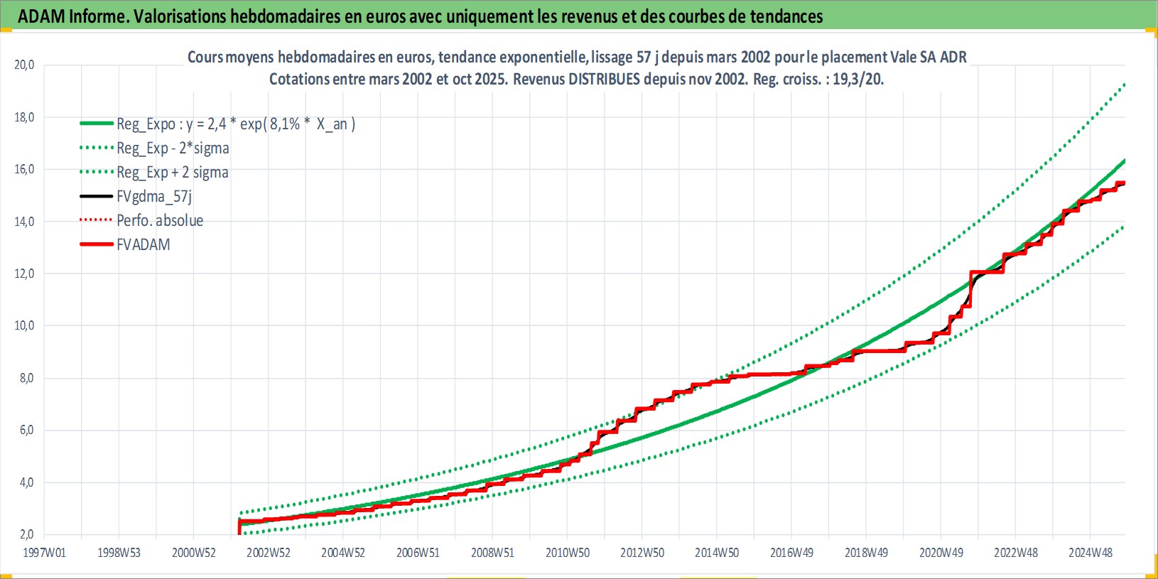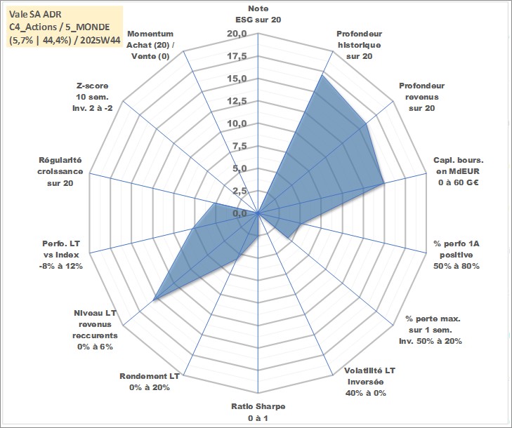 Site dédié aux investisseursPage dédiée sur site financeAnalyse des valorisations hebdomadaires de l'action Vale SA ADR. Cet actif est cote en USD. Les valorisations sont en contrevaleur EURO et couvrent les semaines 2002W12 a 2025W44. Les revenus de cet actif financier sont pris en compte depuis la semaine 2002W46. La note ESG de cet actif n'est pas connue.